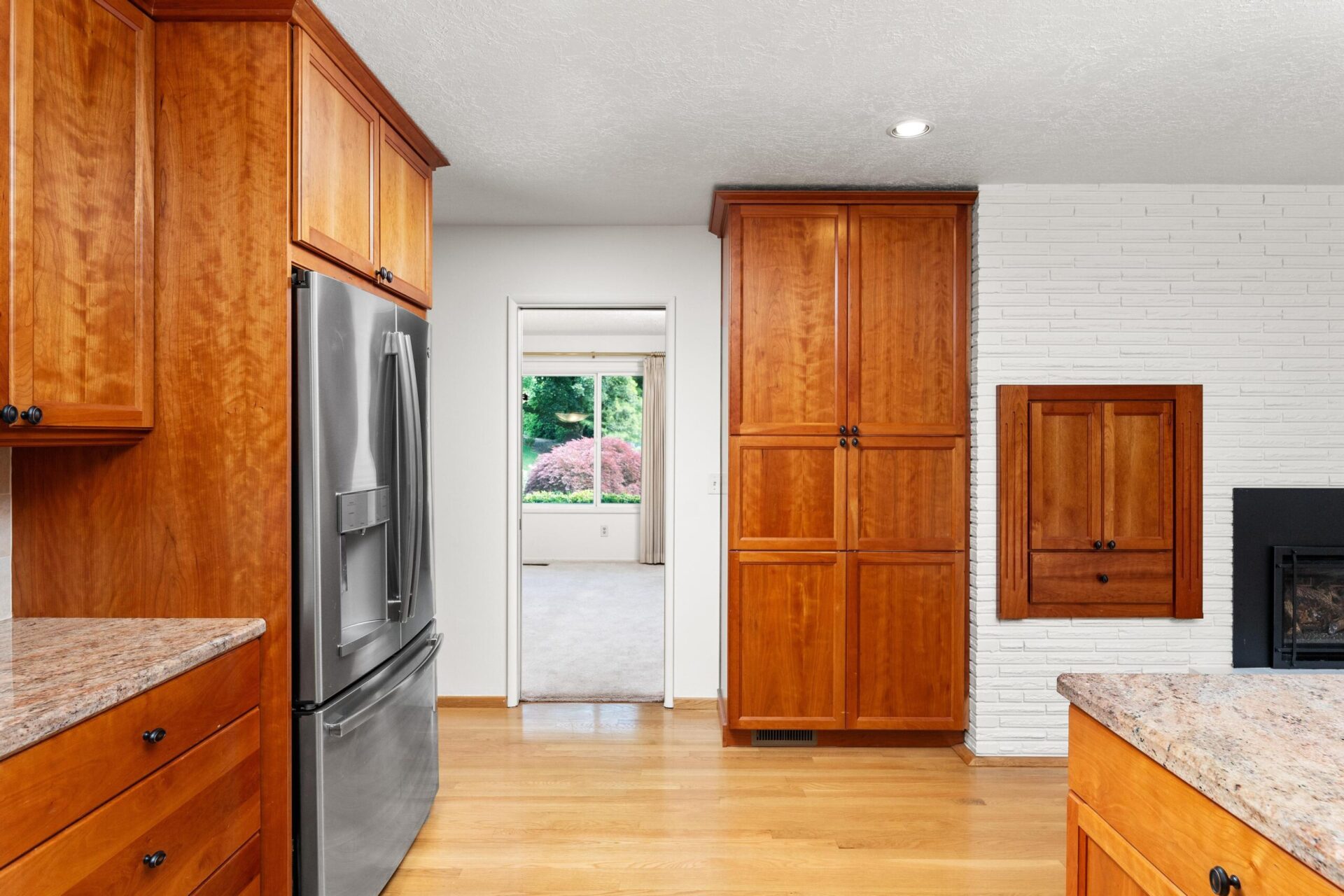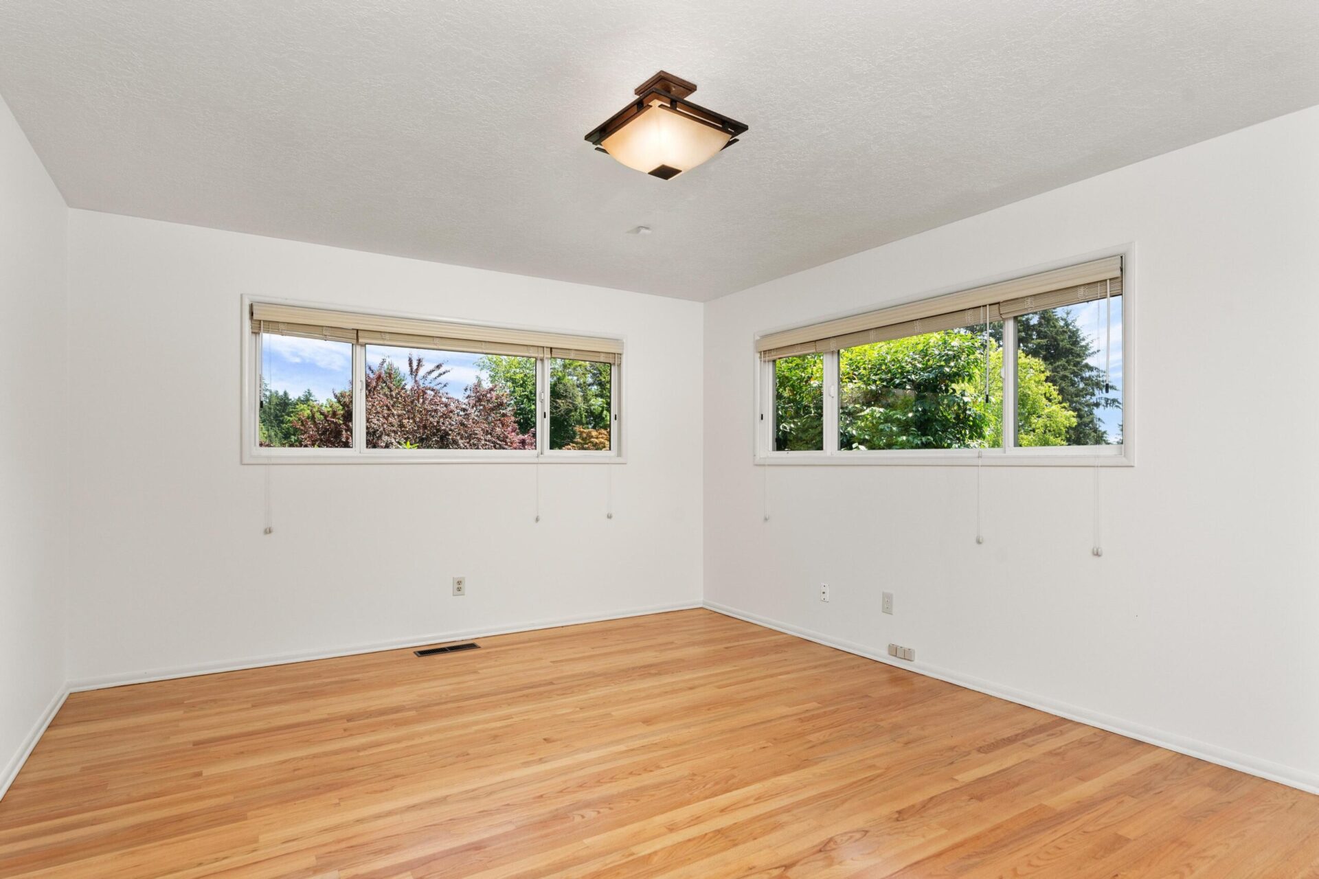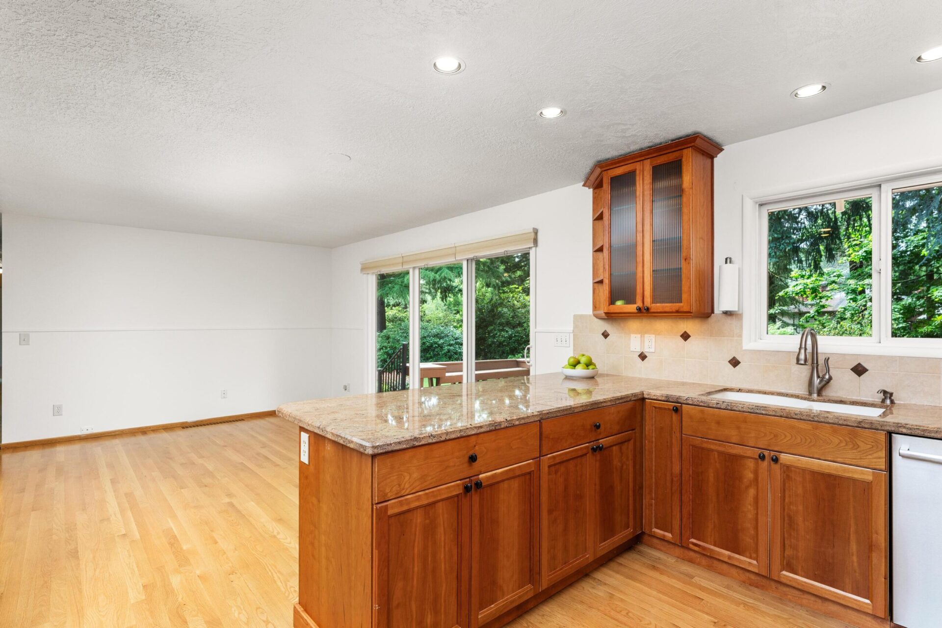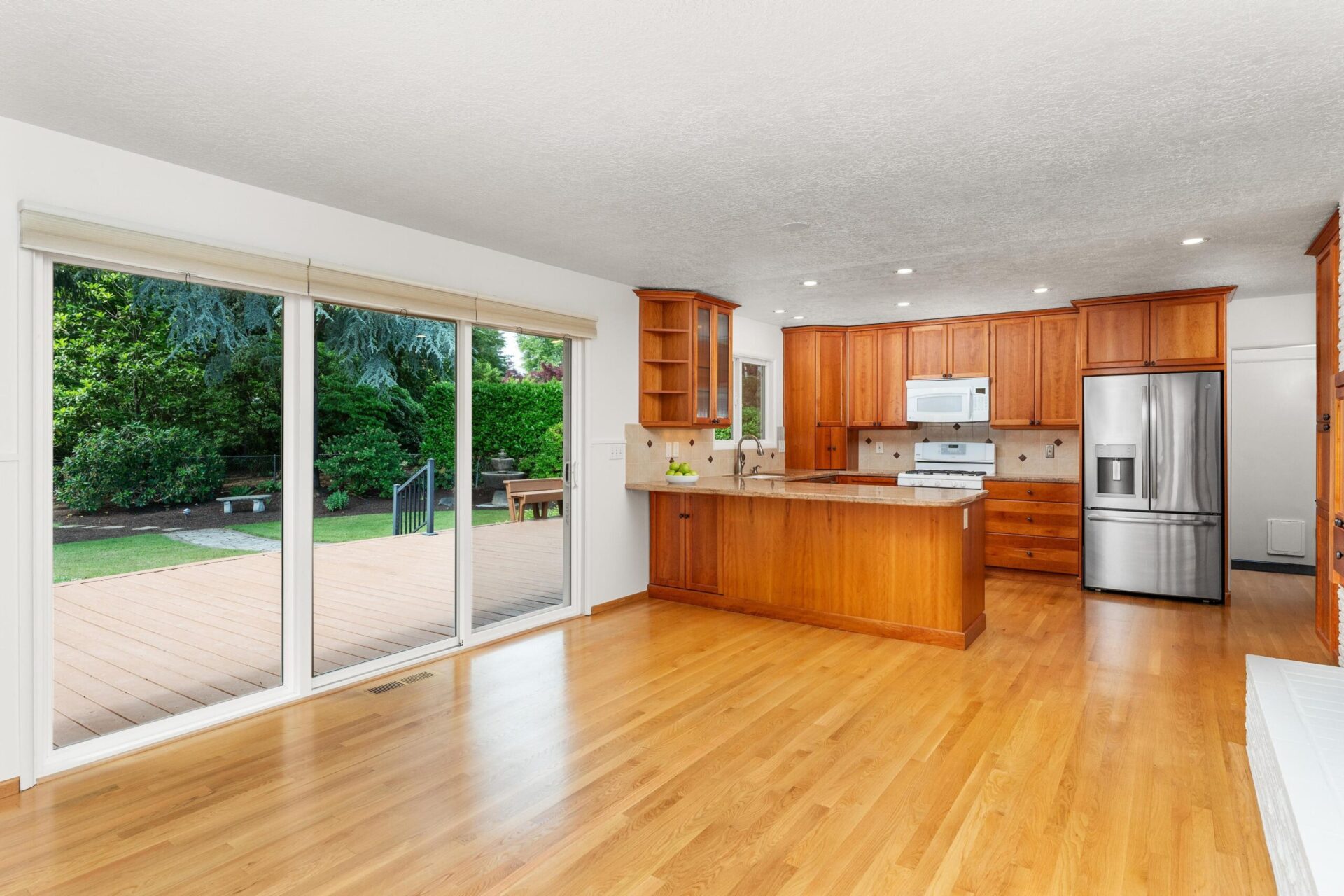 Originally built in 1961, this stunning mid-century home stands proudly in the heart of one of southwest Portland's most coveted neighborhoods. As you approach the home you will notice it's incredible deep soffis that run continuously across each elevation, extending the property's amazing architectural presence. Entering the home you will find yourself in the foyer with natural stone underfoot and a distinctly broad entrance leading you into the home's main hallway and large living room. The living room features an expansive window complemented by a natural stone fireplace surround of equal width that runs floor to ceiling. Multi-hinged doors allow for a seamless flow from the living room to the dining room while creating the functional benefit of closing off the space if you wish. The scale of the dining room is broad and long with almost 170 square feet of space. Directly off the dining room is the remodeled kitchen which features upgraded cherry cabinetry, great appliances and a stunning granite counter surround. The kitchen opens to almost 200 square feet of great room space highlighted by an incredible triple pane slider and second fireplace surrounded by gorgeous linear roman-style brick.