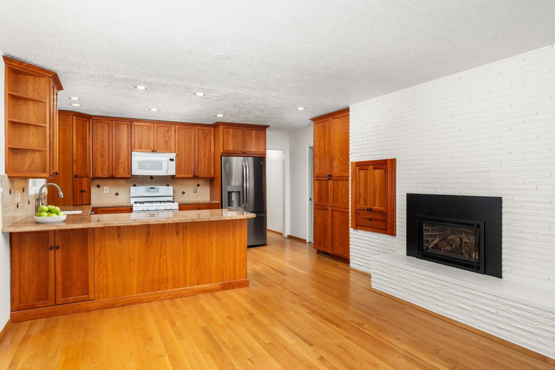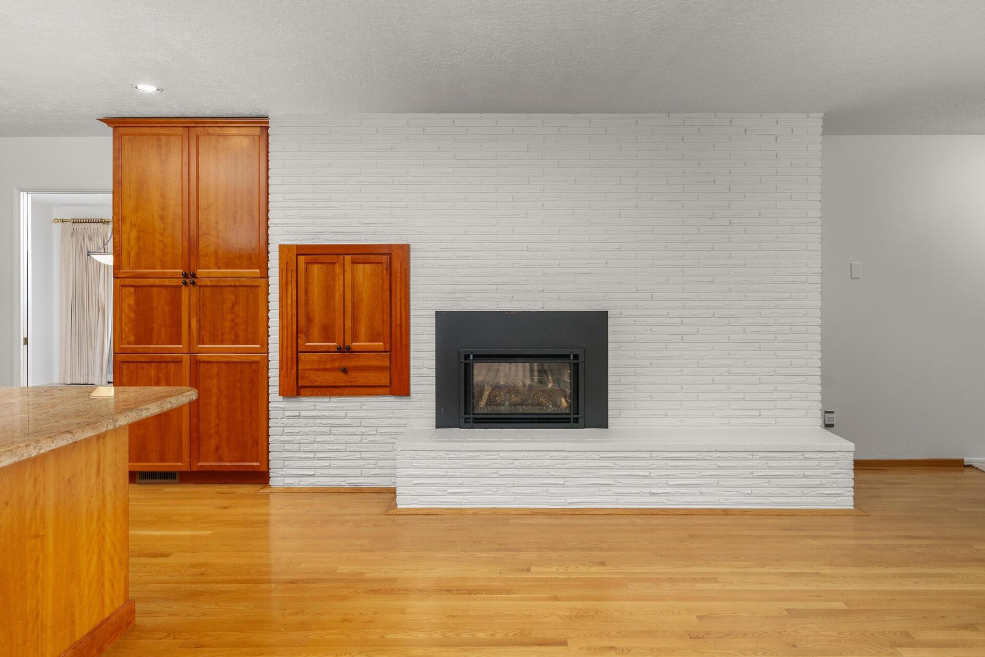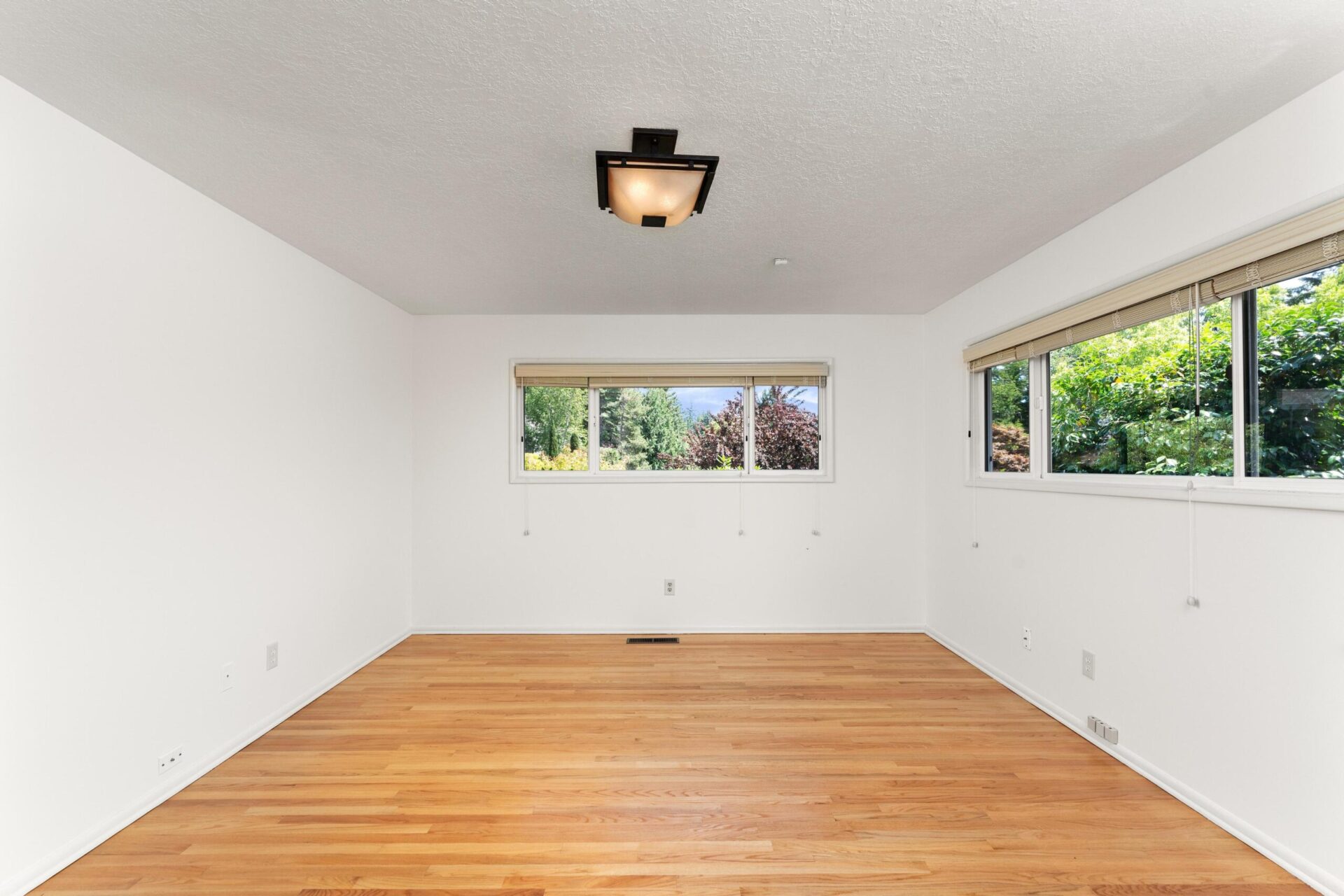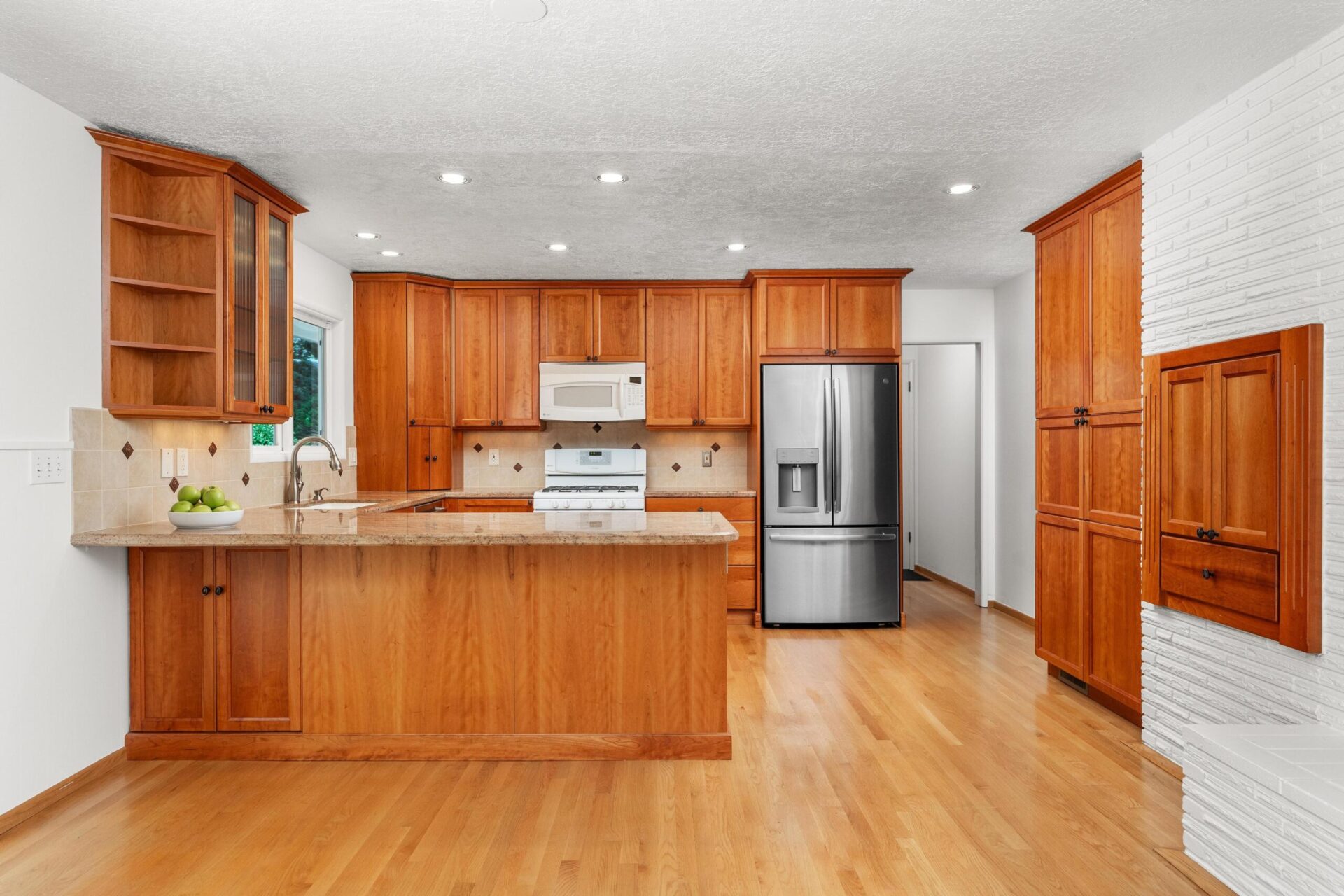 Originally built in 1961, this stunning mid-century home stands proudly in the heart of one of southwest Portland's most coveted neighborhoods. As you approach the home you will notice it's incredible deep soffis that run continuously across each elevation, extending the property's amazing architectural presence. Entering the home you will find yourself in the foyer with natural stone underfoot and a distinctly broad entrance leading you into the home's main hallway and large living room. The living room features an expansive window complemented by a natural stone fireplace surround of equal width that runs floor to ceiling. Multi-hinged doors allow for a seamless flow from the living room to the dining room while creating the functional benefit of closing off the space if you wish. The scale of the dining room is broad and long with almost 170 square feet of space. Directly off the dining room is the remodeled kitchen which features upgraded cherry cabinetry, great appliances and a stunning granite counter surround. The kitchen opens to almost 200 square feet of great room space highlighted by an incredible triple pane slider and second fireplace surrounded by gorgeous linear roman-style brick.