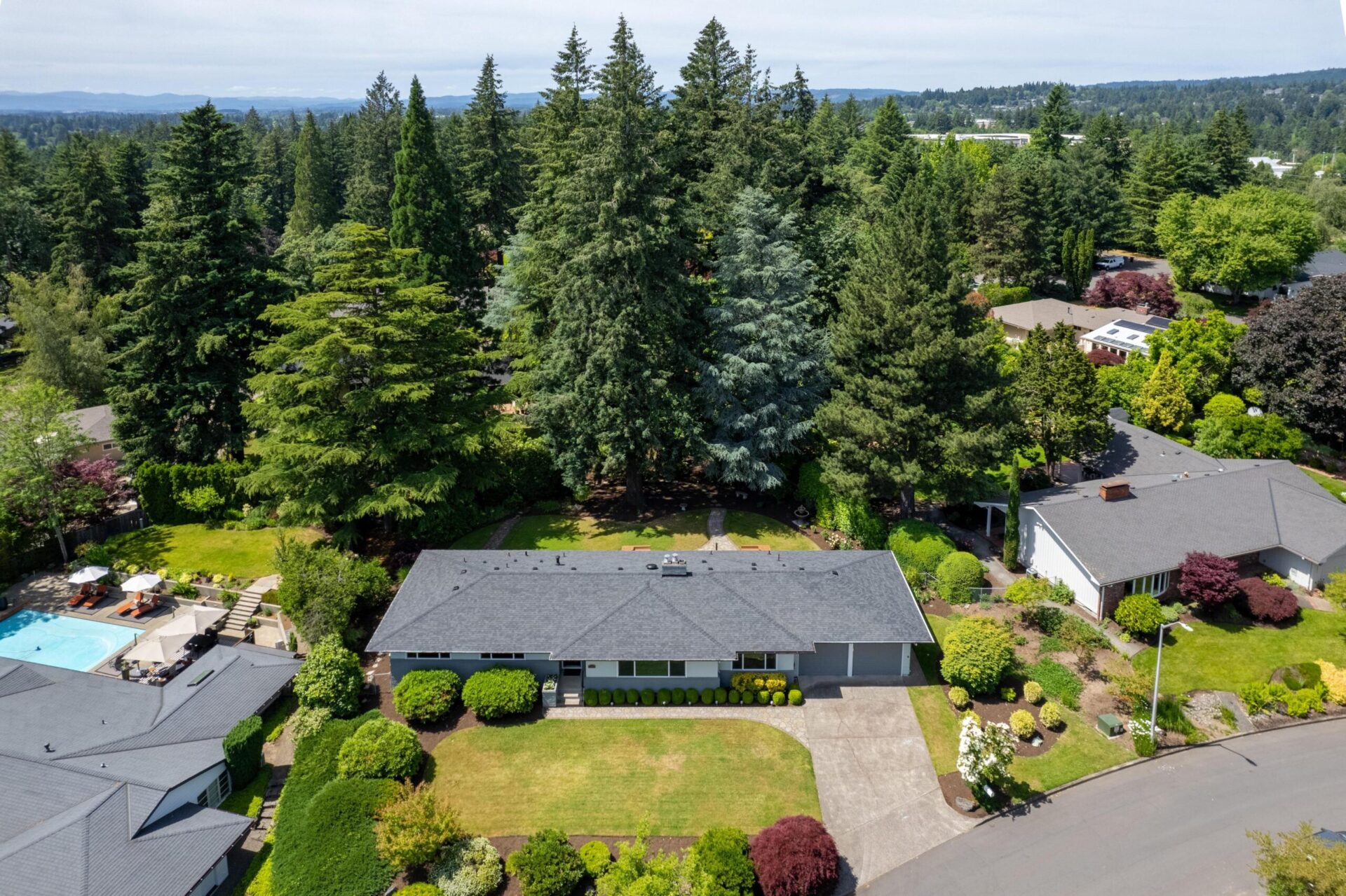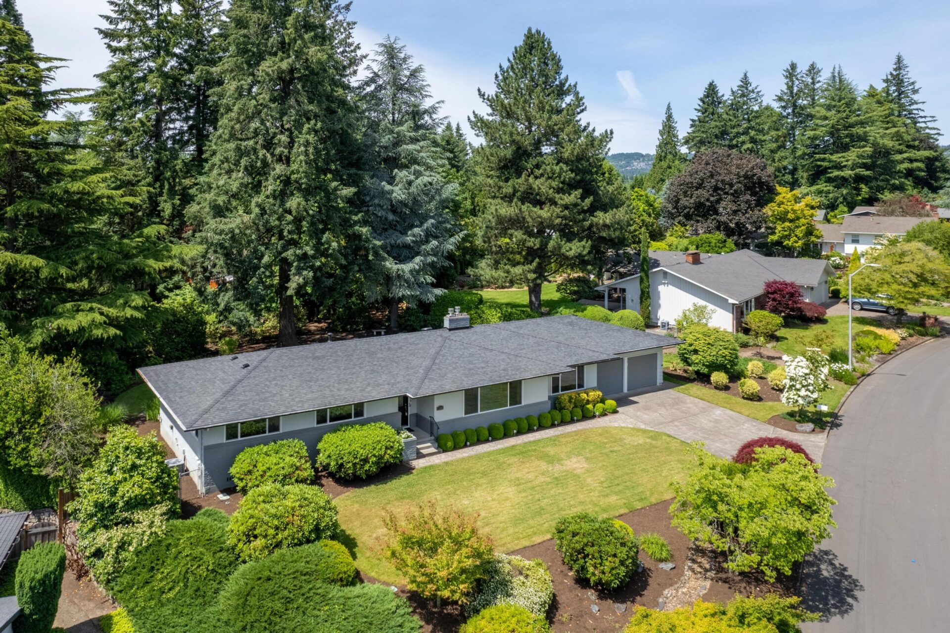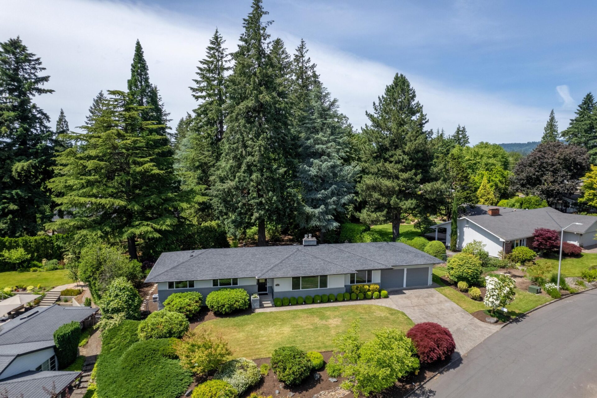 Originally built in 1961, this stunning mid-century home stands proudly in the heart of one of southwest Portland's most coveted neighborhoods. As you approach the home you will notice it's incredible deep soffis that run continuously across each elevation, extending the property's amazing architectural presence. Entering the home you will find yourself in the foyer with natural stone underfoot and a distinctly broad entrance leading you into the home's main hallway and large living room. The living room features an expansive window complemented by a natural stone fireplace surround of equal width that runs floor to ceiling. Multi-hinged doors allow for a seamless flow from the living room to the dining room while creating the functional benefit of closing off the space if you wish. The scale of the dining room is broad and long with almost 170 square feet of space. Directly off the dining room is the remodeled kitchen which features upgraded cherry cabinetry, great appliances and a stunning granite counter surround. The kitchen opens to almost 200 square feet of great room space highlighted by an incredible triple pane slider and second fireplace surrounded by gorgeous linear roman-style brick.