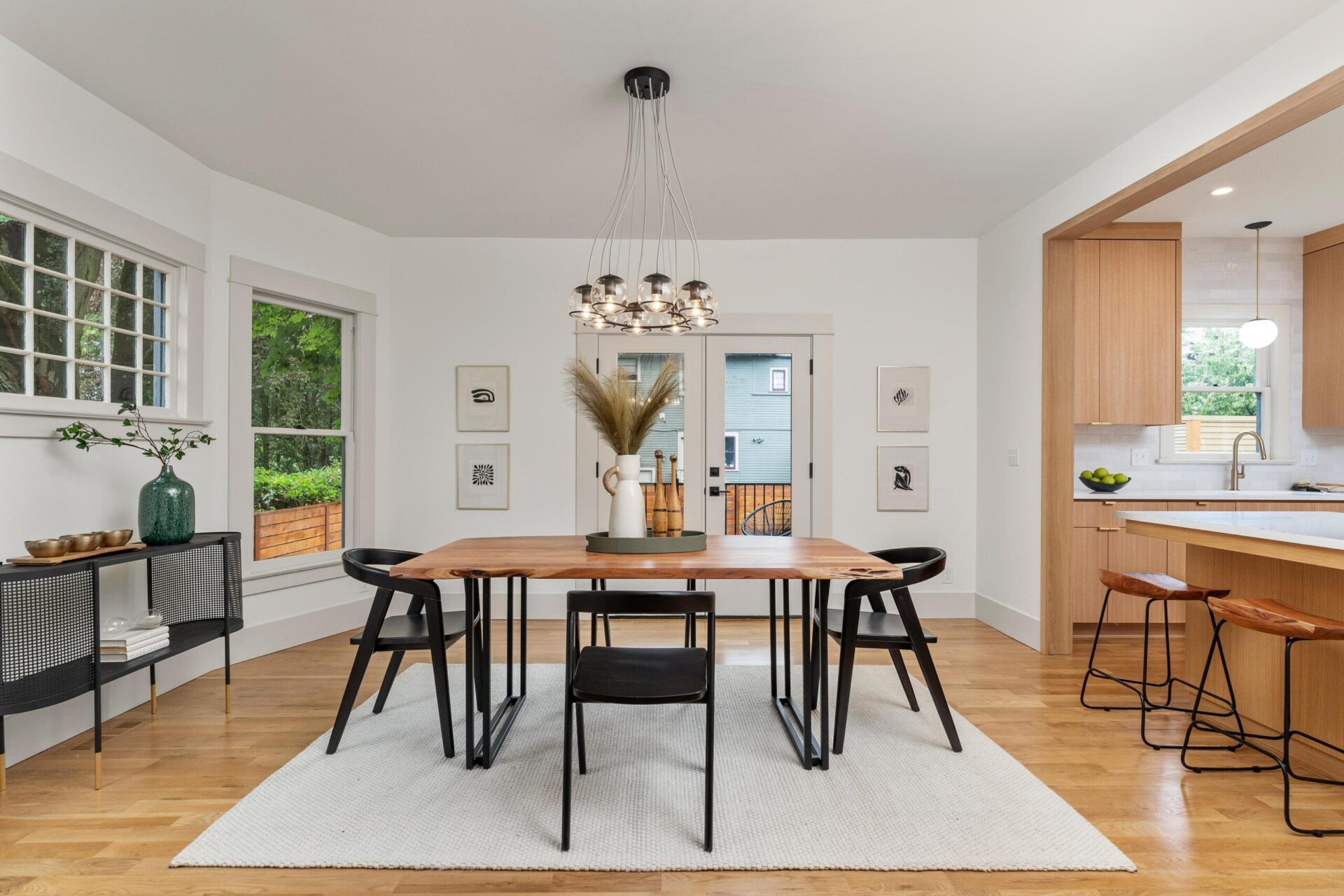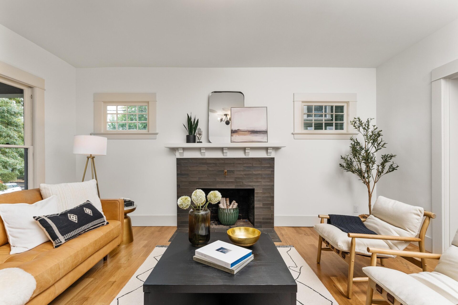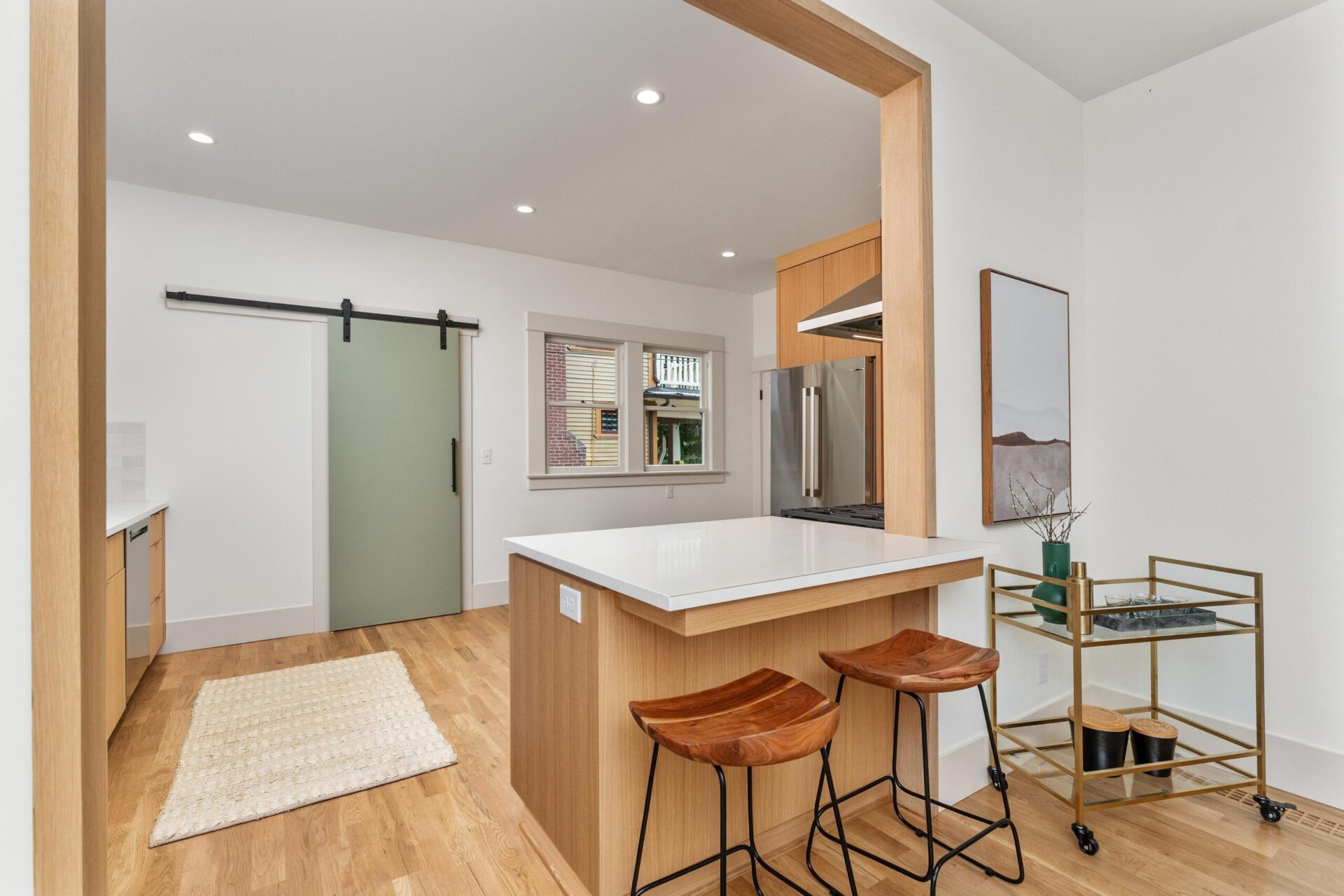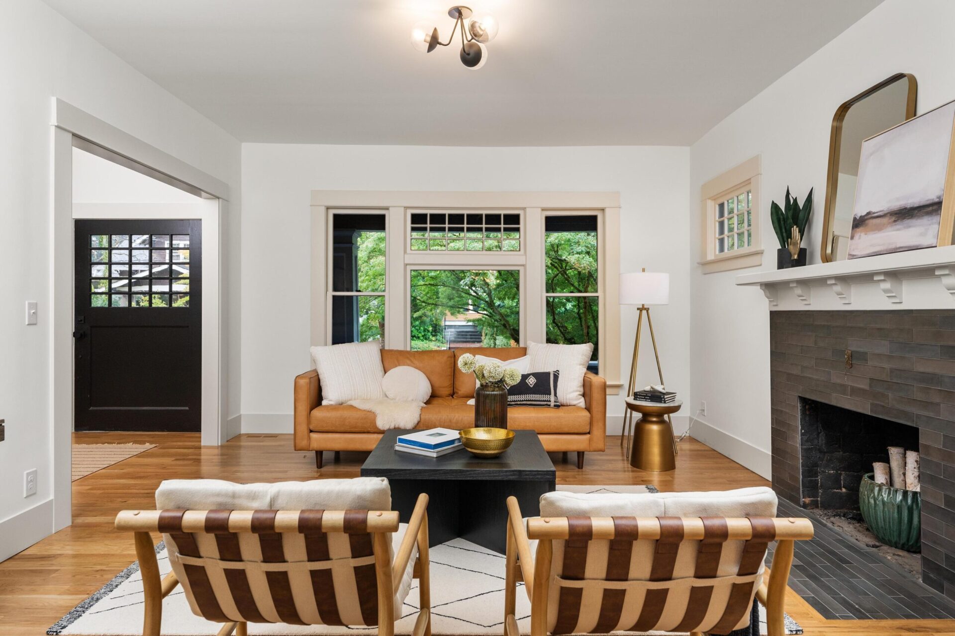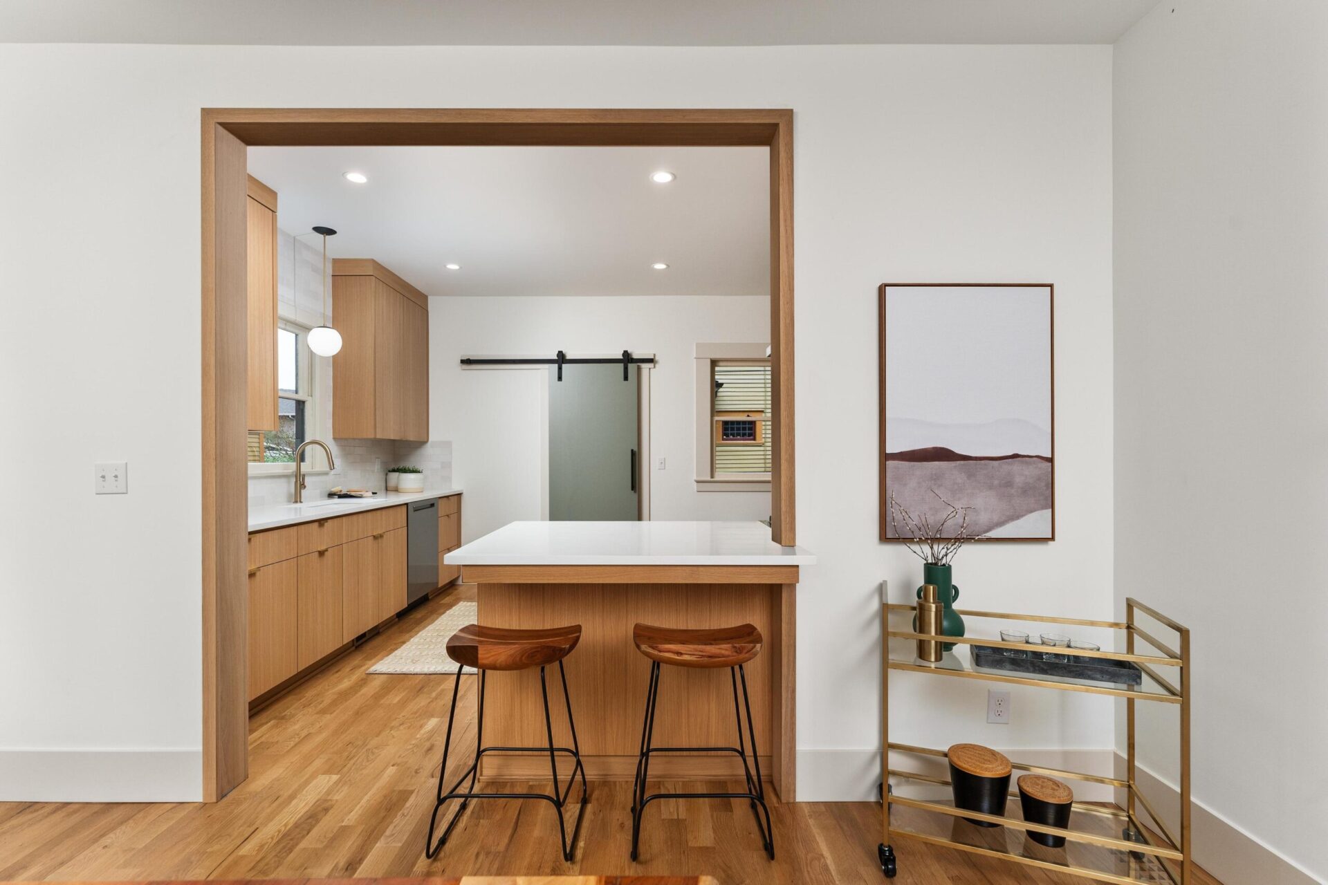 Originally built in 1910, this stunning craftsman home has been remodeled from top to bottom by one of northeast Portland's best renovators. As a follow up to his record breaking Beaumont projects, Ron Albano is back in Grant Park where he introduced one of his first renovations almost 20 years ago. As you approach the home you will take notice of the incredible craftsmanship that was a hallmark of the turn of the century. Massive corbels flank the deep soffits of the porch, running around all four elevations in unison, while also creating depth and architectural value on the home's trademark hip roofed dormer. Stepping onto the porch, you will notice a scale and depth that you rarely see in new builds today. Entering the expansive front door you are greeted by new oak hardwood floors, the home's original stairwell-side built-ins and a new powder room. The powder room is where you will first notice Albano's creative license. Designer wallpaper surrounds the large space with a clever alcove hosting the furniture style vanity with perfect sconce above. Moving into the living room, classic colors coupled with a new fireplace surround and incredible divided light windows showcase a perfect balance between old and new. The adjacent dining room has been improved to host a stunning Schoolhouse chandelier, two new French doors and a new, wider opening into the completely remodeled kitchen. Custom solid oak casing wraps the transition between the rooms and introduces you to the gorgeous oak slab cabinets Albano used alongside brilliant white quartz counters, a picture perfect barn style door to the pantry and the trademark Wolf range he always employs. Moving upstairs you will find three gracious bedrooms all boasting newly refinished fir floors, gorgeous white walls with Hushed Hue casing and an incredible, completely remodeled bathroom. Albano managed to recraft the dimensions of the bathroom to include a stunning custom tile-set shower, gorgeous freestanding tub and a custom double vanity you don't want to miss. In addition to the two stunning above grade floors is a 700 square foot finished basement with new polished concrete floors, gorgeous built-ins, a new, third full bathroom, family room and expansive fourth bedroom. Beyond these spaces Albano finished the tuck-under garage and created new storage spaces which are home to a new tankless water heater and furnace. Unlike many renovators, he introduced all new mechanicals, electrical and plumbing throughout the home, while also adding new central air conditioning. Beyond the showcase interiors, is a huge backyard, where Albano installed all new cedar fencing, a new lawn and a trex deck off the back of the home, which is perfectly elevated above the yard. With an address just blocks to the library, Whole Foods, countless Hollywood shops and two of Portland's most cherished schools, you don't want to miss this noteworthy renovation!
