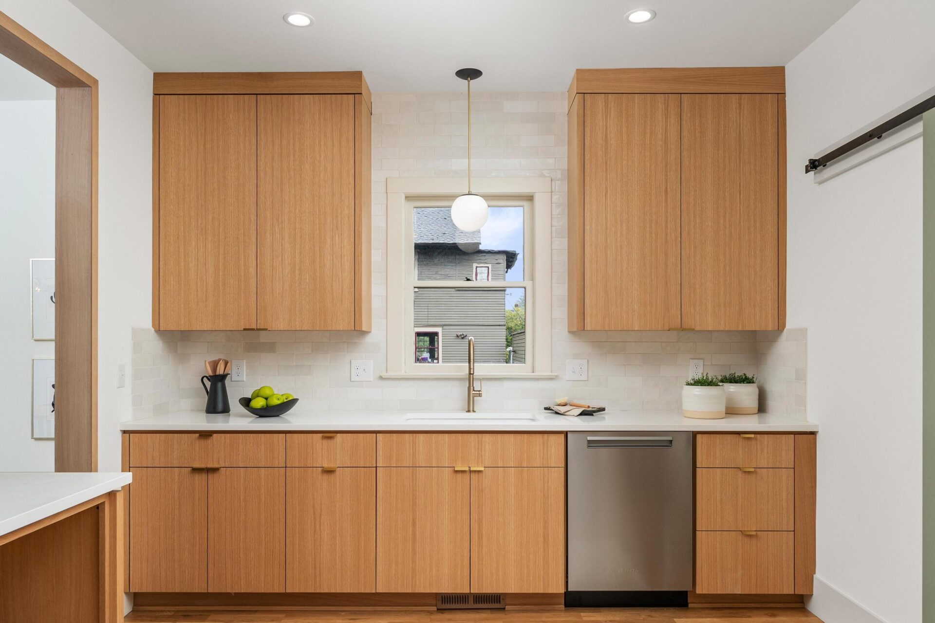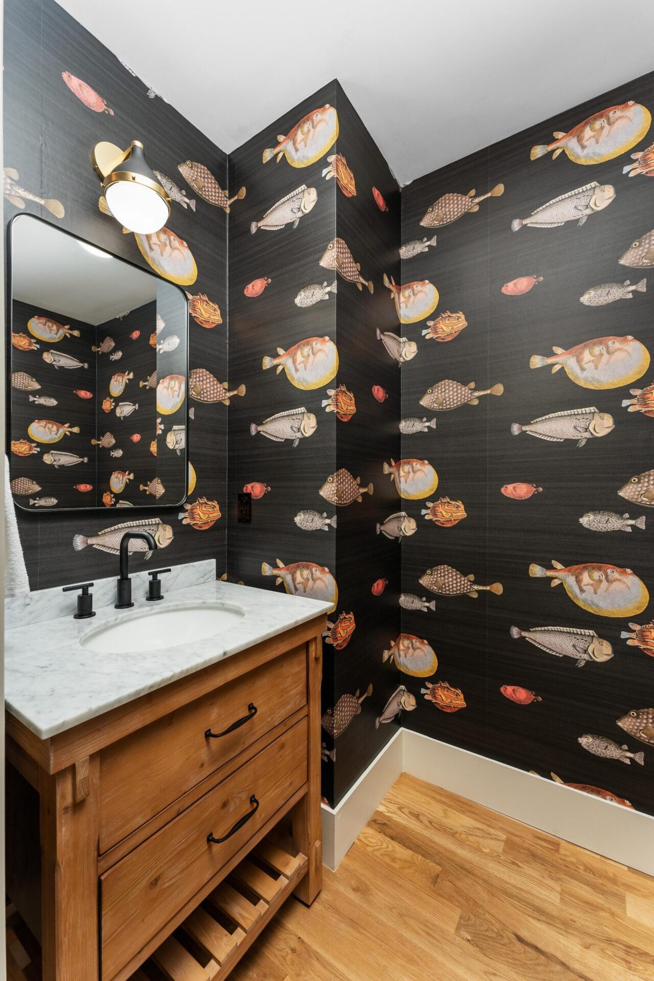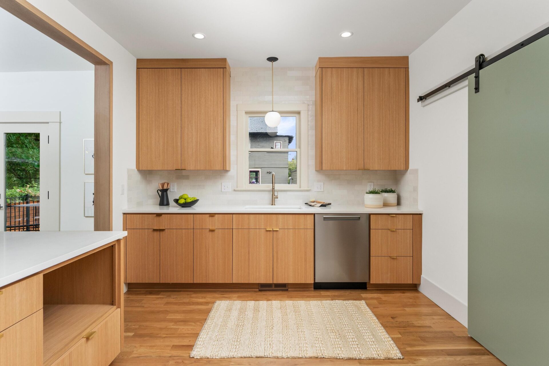 Entering the expansive front door you are greeted by new oak hardwood floors, the home's original stairwell-side built-ins and a new powder room. The powder room is where you will first notice Albano's creative license. Designer wallpaper surrounds the large space with a clever alcove hosting the furniture style vanity with perfect sconce above. Moving into the living room, classic colors coupled with a new fireplace surround and incredible divided light windows showcase a perfect balance between old and new. The adjacent dining room has been improved to host a stunning Schoolhouse chandelier, two new French doors and a new, wider opening into the completely remodeled kitchen. Custom solid oak casing wraps the transition between the rooms and introduces you to the gorgeous oak slab cabinets Albano used alongside brilliant white quartz counters, a picture perfect barn style door to the pantry and the trademark Wolf range he always employs.