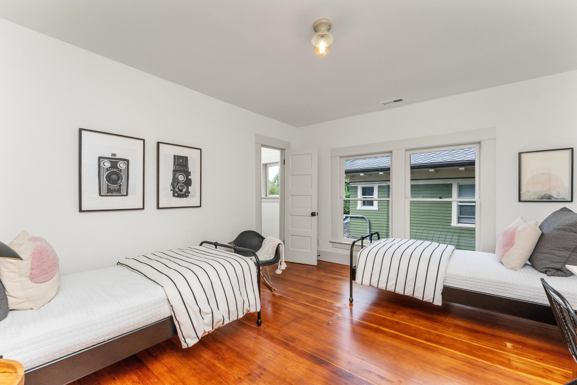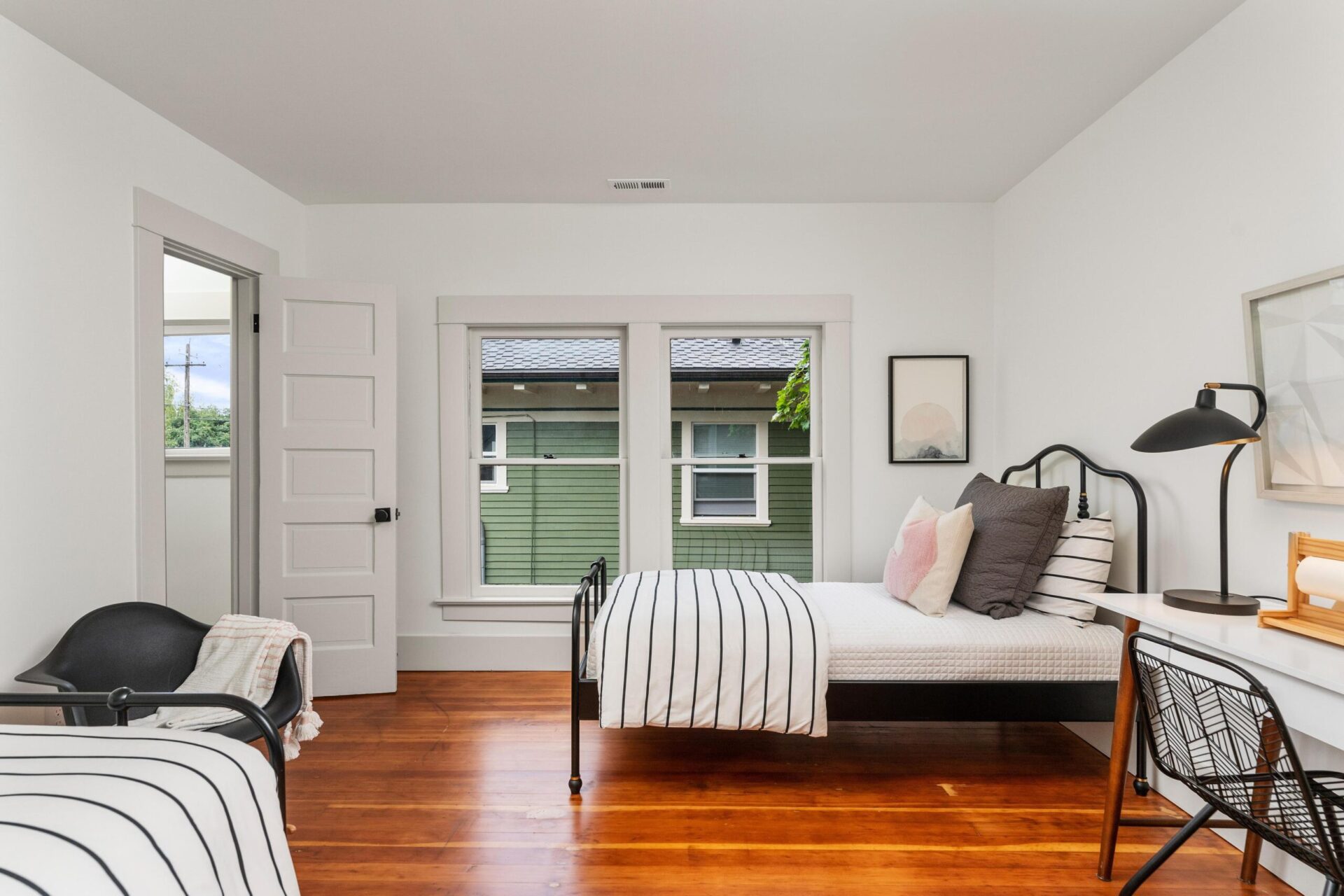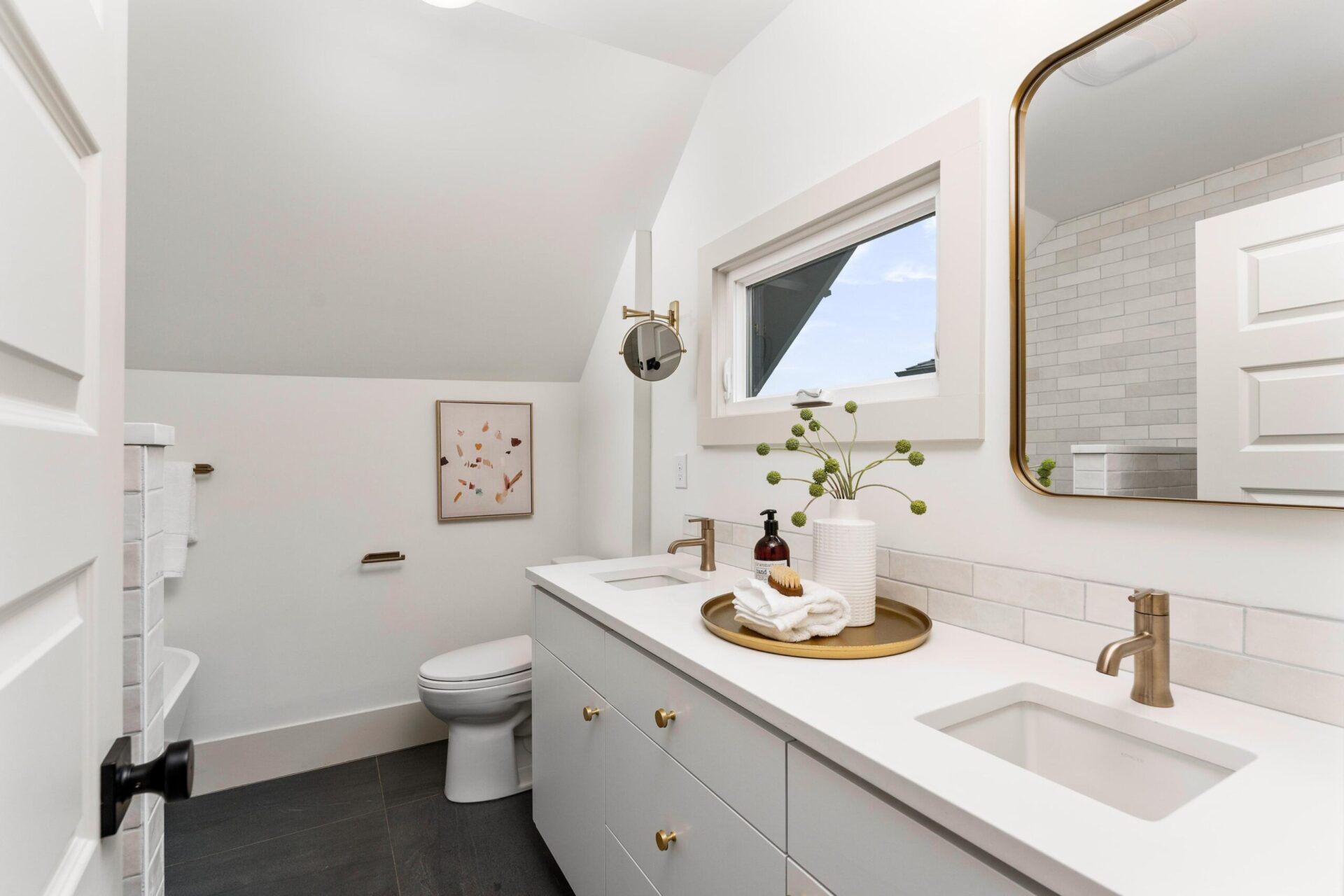 Originally built in 1910, this stunning craftsman home has been remodeled from top to bottom by one of northeast Portland's best renovators. As a follow up to his record breaking Beaumont projects, Ron Albano is back in Grant Park where he introduced one of his first renovations almost 20 years ago. As you approach the home you will take notice of the incredible craftsmanship that was a hallmark of the turn of the century. Massive corbels flank the deep soffits of the porch, running around all four elevations in unison, while also creating depth and architectural value on the home's trademark hip roofed dormer. Stepping onto the porch, you will notice a scale and depth that you rarely see in new builds today. Entering the expansive front door you are greeted by new oak hardwood floors, the home's original stairwell-side built-ins and a new powder room. The powder room is where you will first notice Albano's creative license. Designer wallpaper surrounds the large space with a clever alcove hosting the furniture style vanity with perfect sconce above. Moving into the living room, classic colors coupled with a new fireplace surround and incredible divided light windows showcase a perfect balance between old and new. The adjacent dining room has been improved to host a stunning Schoolhouse chandelier, two new French doors and a new, wider opening into the completely remodeled kitchen. Custom solid oak casing wraps the transition between the rooms and introduces you to the gorgeous oak slab cabinets Albano used alongside brilliant white quartz counters, a picture perfect barn style door to the pantry and the trademark Wolf range he always employs. Moving upstairs you will find three gracious bedrooms all boasting newly refinished fir floors, gorgeous white walls with Hushed Hue casing and an incredible, completely remodeled bathroom. Albano managed to recraft the dimensions of the bathroom to include a stunning custom tile-set shower, gorgeous freestanding tub and a custom double vanity you don't want to miss. In addition to the two stunning above grade floors is a 700 square foot finished basement with new polished concrete floors, gorgeous built-ins, a new, third full bathroom, family room and expansive fourth bedroom. Beyond these spaces Albano finished the tuck-under garage and created new storage spaces which are home to a new tankless water heater and furnace. Unlike many renovators, he introduced all new mechanicals, electrical and plumbing throughout the home, while also adding new central air conditioning. Beyond the showcase interiors, is a huge backyard, where Albano installed all new cedar fencing, a new lawn and a trex deck off the back of the home, which is perfectly elevated above the yard. With an address just blocks to the library, Whole Foods, countless Hollywood shops and two of Portland's most cherished schools, you don't want to miss this noteworthy renovation!
