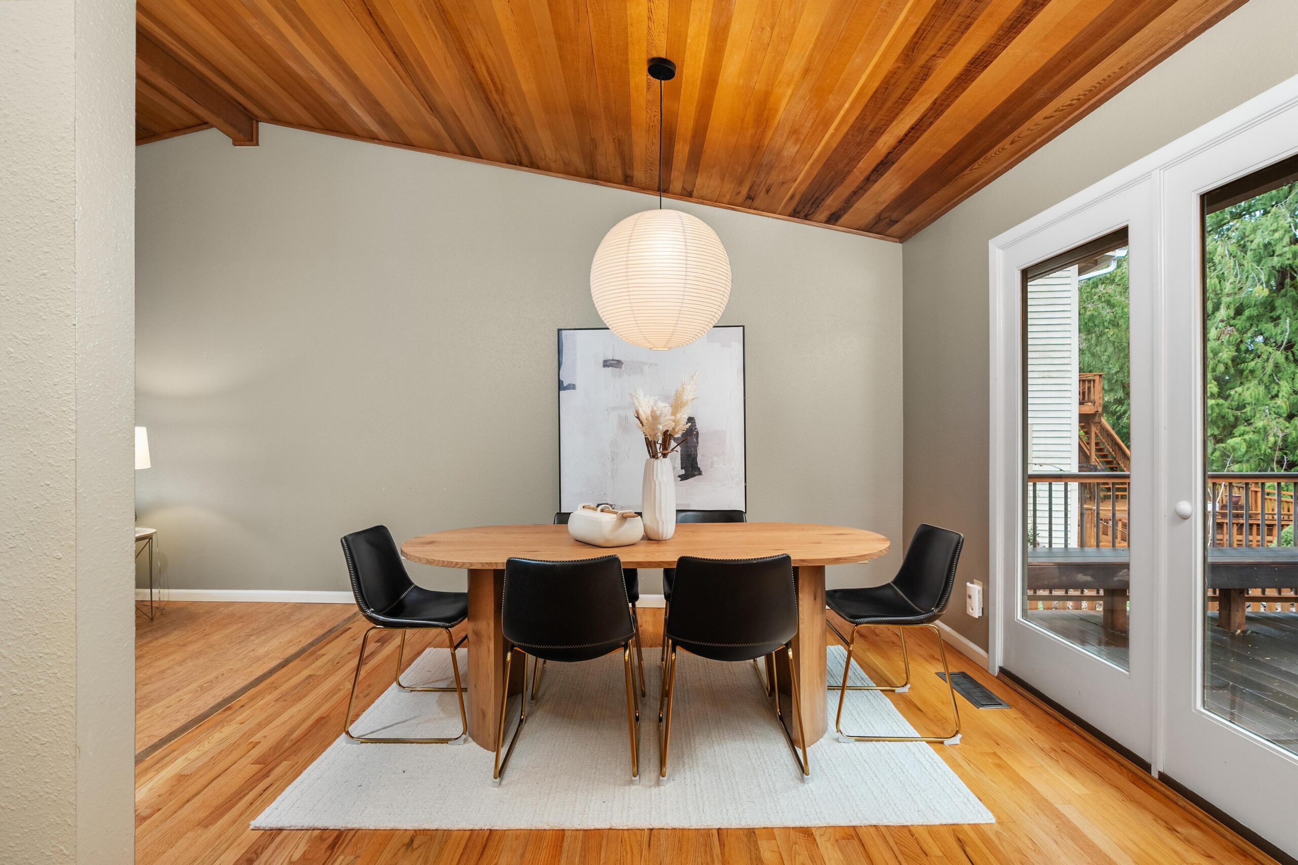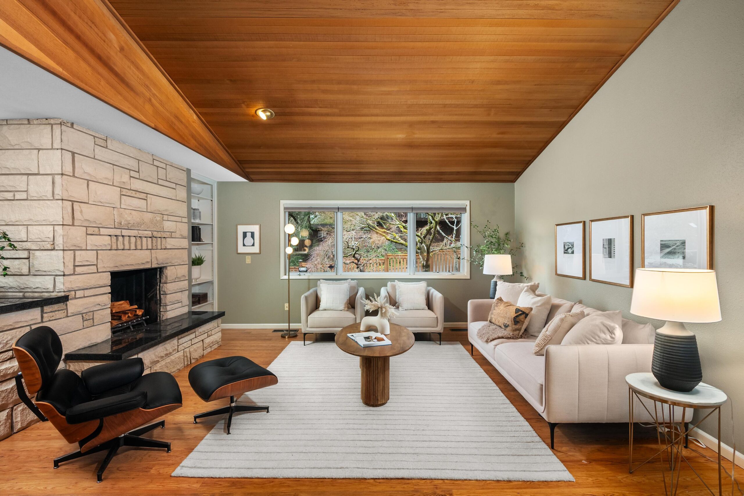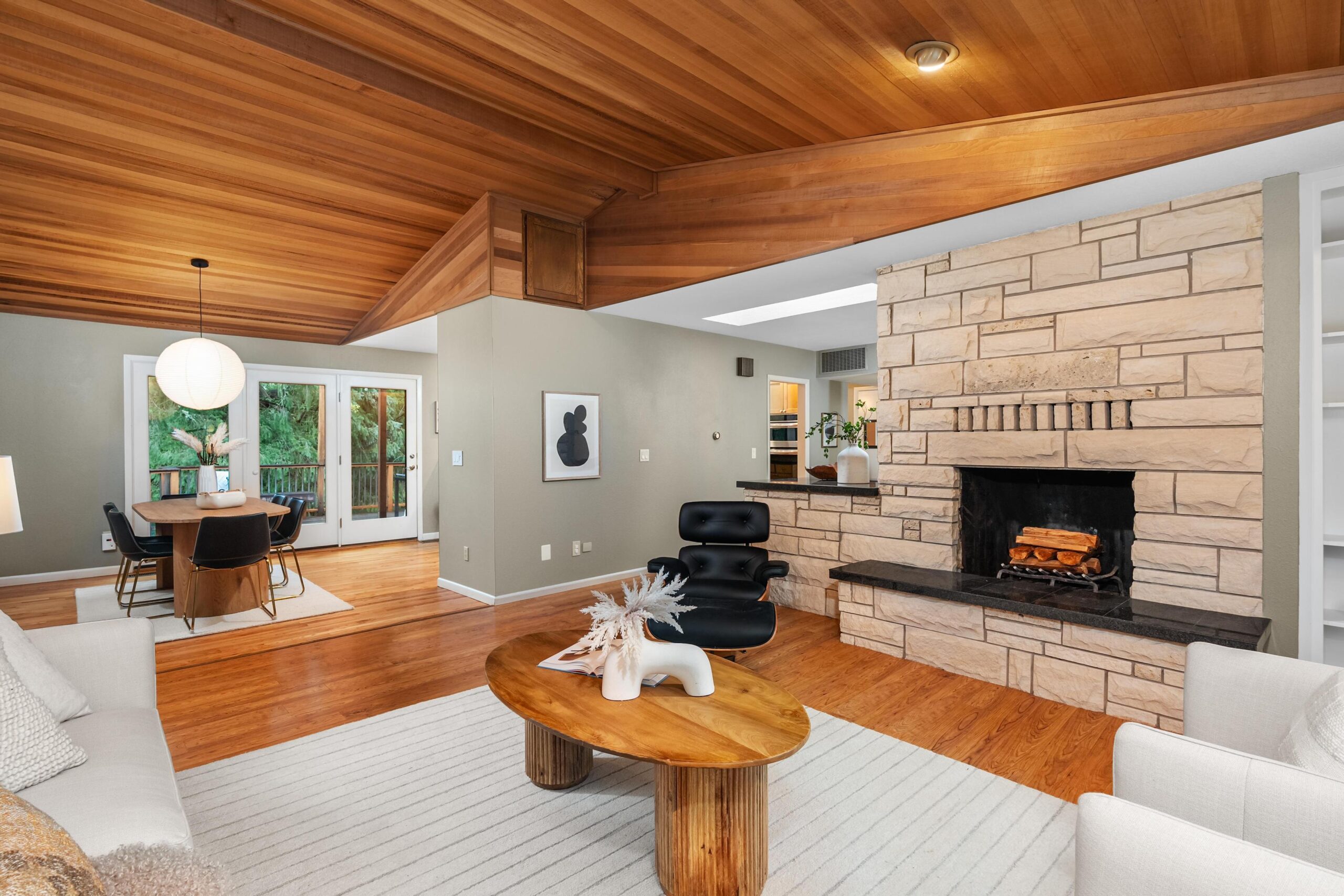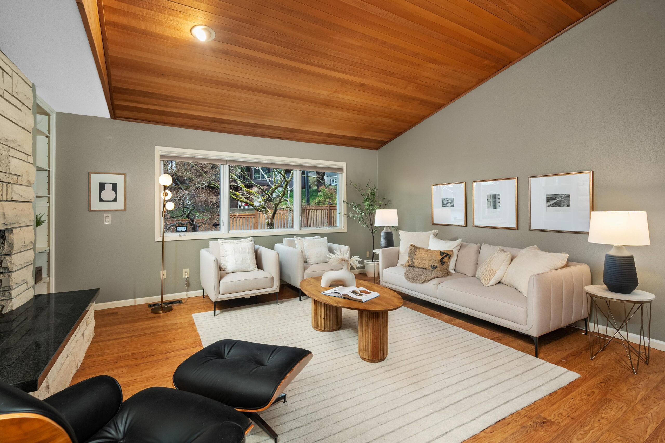 Originally built in 1981, this stunning northwest contemporary stands proudly on almost a quarter acre lot in the sought after West Haven neighborhood. As you approach the home you are welcomed by a paver patio, stunning plantings and a grand front door landing. Entering the home you find yourself in a large foyer with custom flagstone underfoot, drawing you into the home's gorgeous main floor. The living room is magazine-worthy, boasting vaulted ceilings clad in gorgeous clear vertical grain cedar, updated flooring and a stunning wood burning fireplace that anchors the room. Moving seamlessly into the dining room and beyond to the kitchen you immediately witness the home's mid-century influences highlighted by its surface treatments and classic circular flow pattern. The kitchen has been updated to include granite counters, maple shaker cabinetry and stainless steel appliances while the dining room boasts an expansive three panel, full light French door to the backyard deck.Moving beyond the almost 1000 square foot main floor you will find a private, upstairs primary suite. Vaulted ceilings clad in cedar, updated flooring and its own private deck balance perfectly against the stunning, remodeled en suite bathroom which features a custom, double vanity, free standing tub, gorgeous tiled shower and walk-in closet. Moving back downstairs you will find approximately 1500 square feet of finished space in the daylight basement. Three additional bedrooms, a third bathroom, laundry room and large family room / media room highlight the lower level which also offers direct access to a private patio through expansive patio doors. As with the careful interior stewardship, the exterior has been carefully updated and maintained. Multi-level decking, featuring IPE hardwoods offer direct access to the backyard from the upper floors, while terraced grounds maximize the property's utility and stunning backdrop which includes a picturesque creek & established trees.