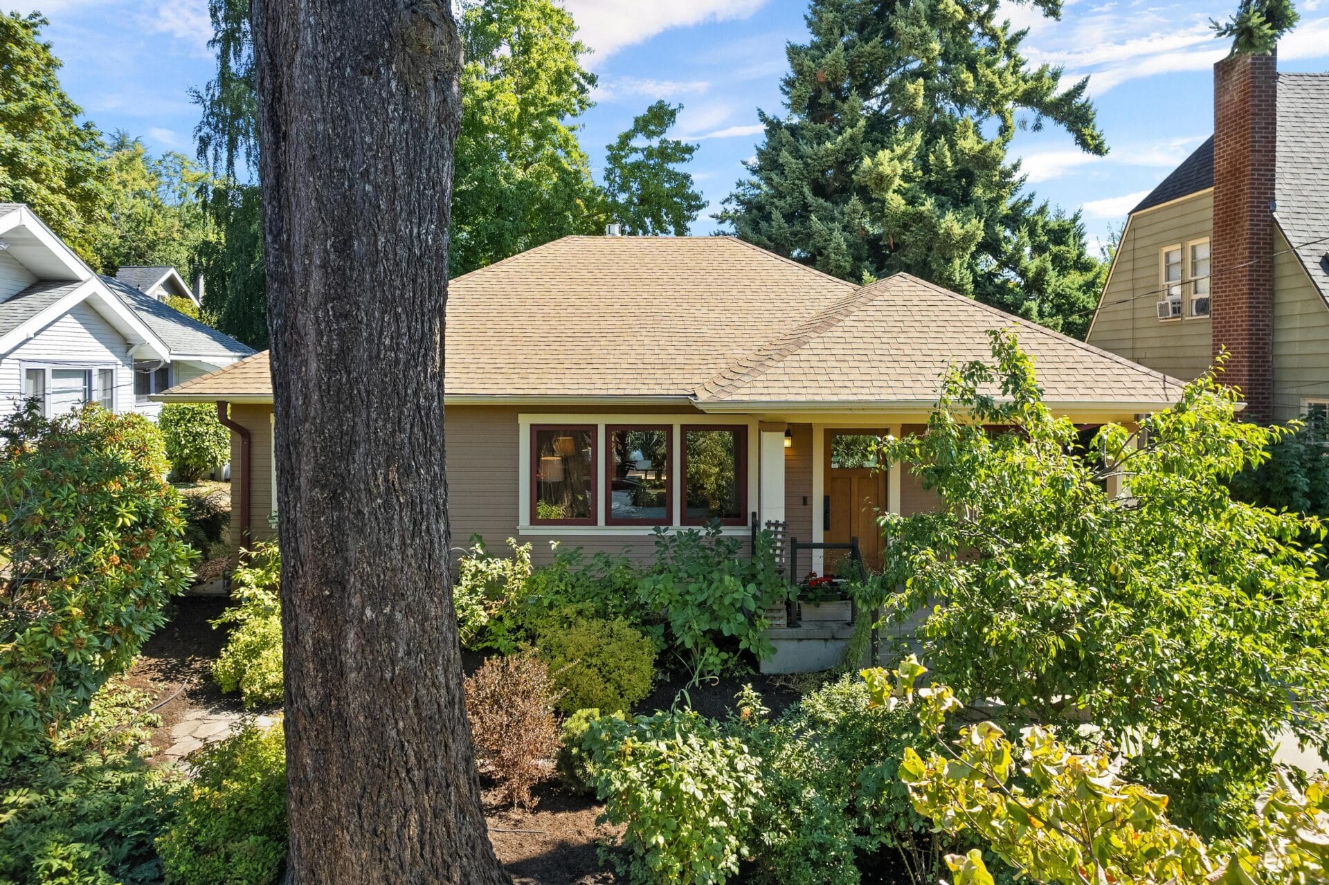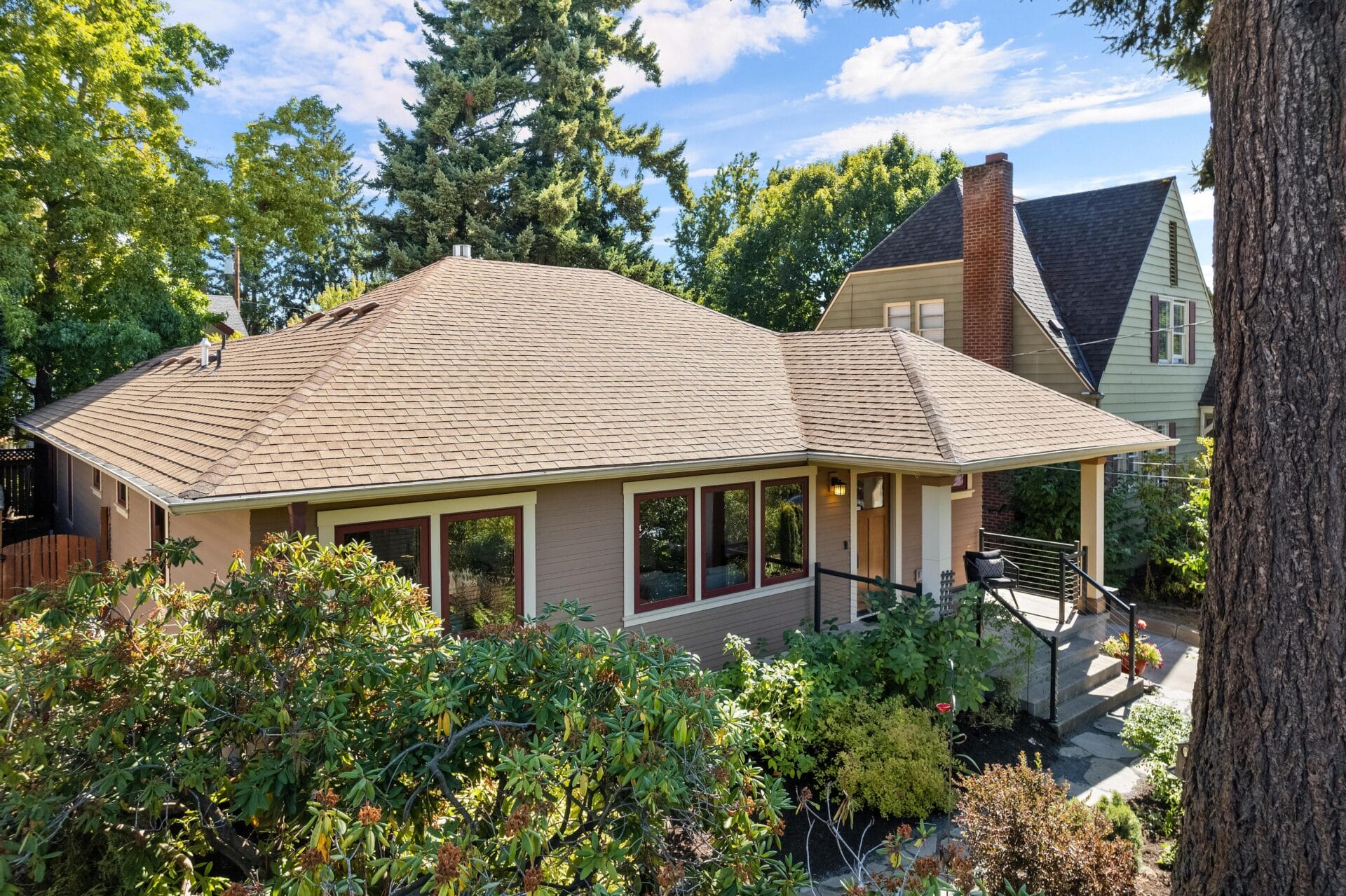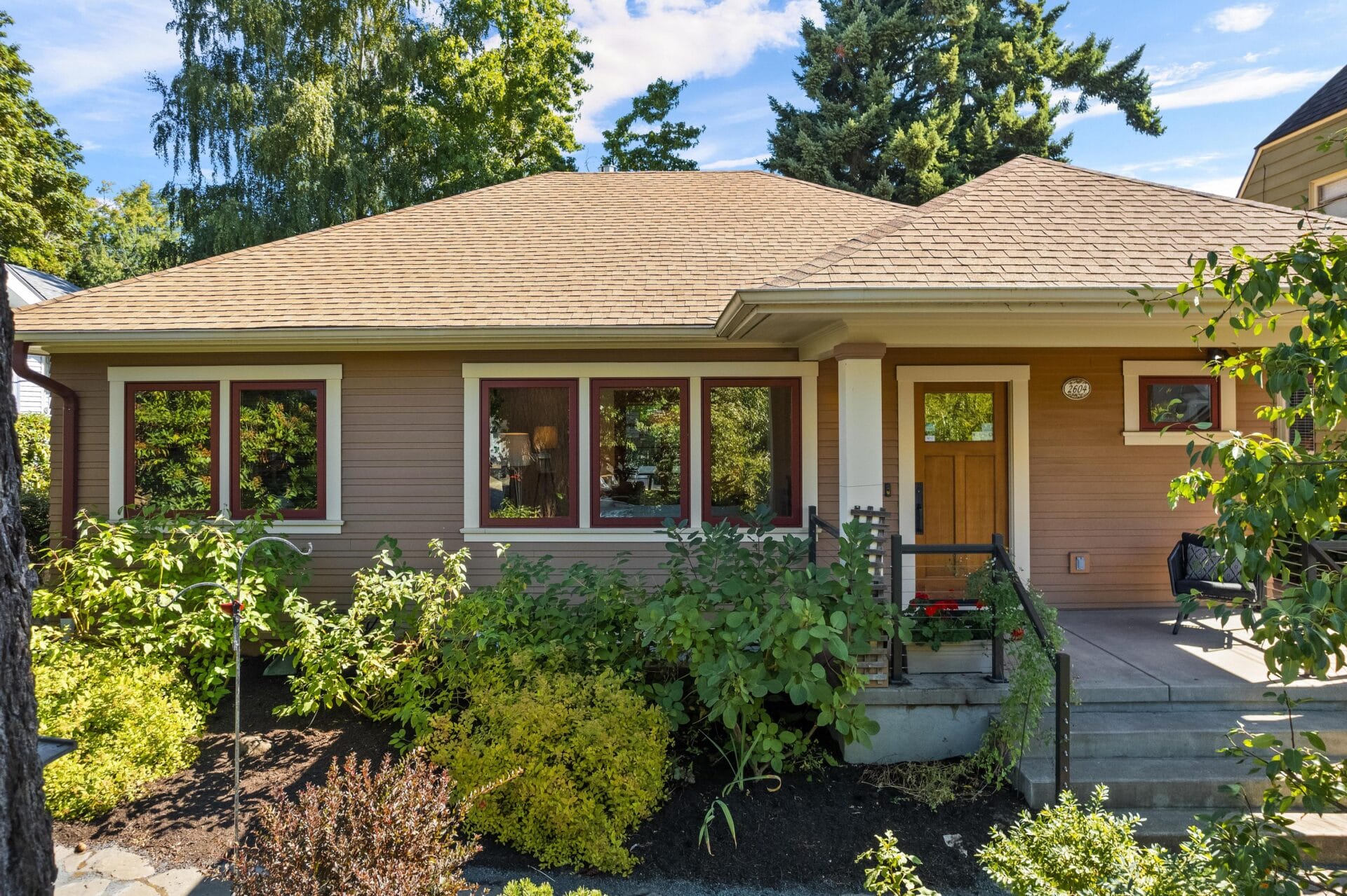 Originally built in 1923, this incredible Grant Park bungalow stands a century later as one of the best renovations in northeast Portland. We rarely see a home so thoughtfully rebuilt with such loving attention to detail and a spacious main-level floor plan and primary suite. As you approach the home, you will see multiple cascading hip roof gables that extend generously beyond the home’s footprint to create its trademark Prairie-style soffits. The soffits feature tongue and groove cedar paneling and a continuous soffit vent. New cedar siding with an alternating reveal complements the remarkable soffit details and reflects the same finishes found in Portland’s most noteworthy Craftsman homes. Stunning new clad-wood windows and custom wood doors round out the completely redesigned envelope.