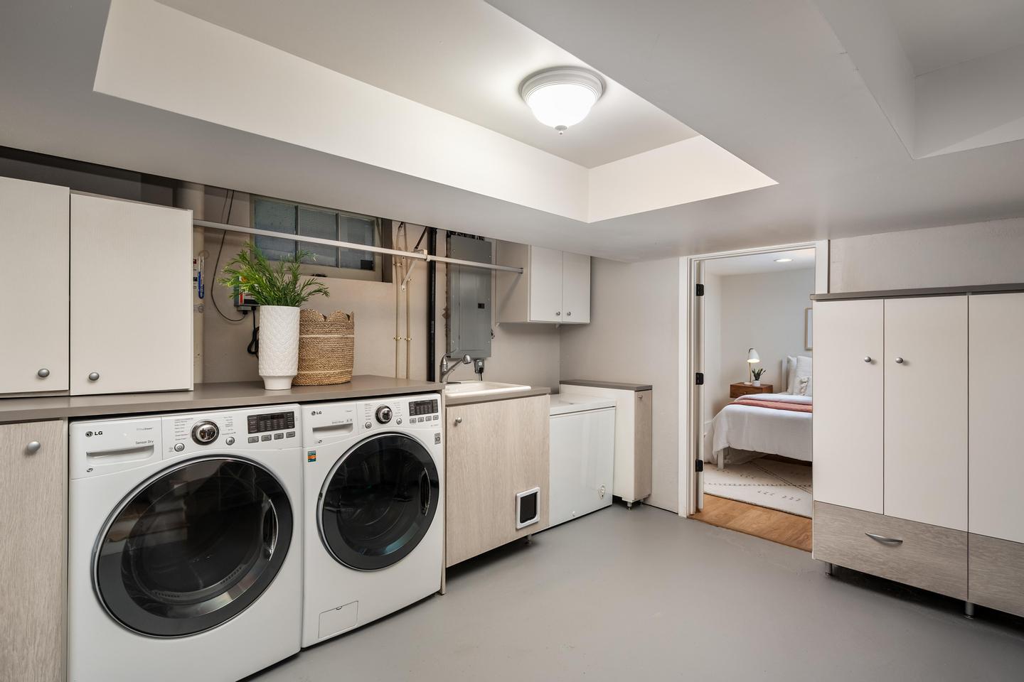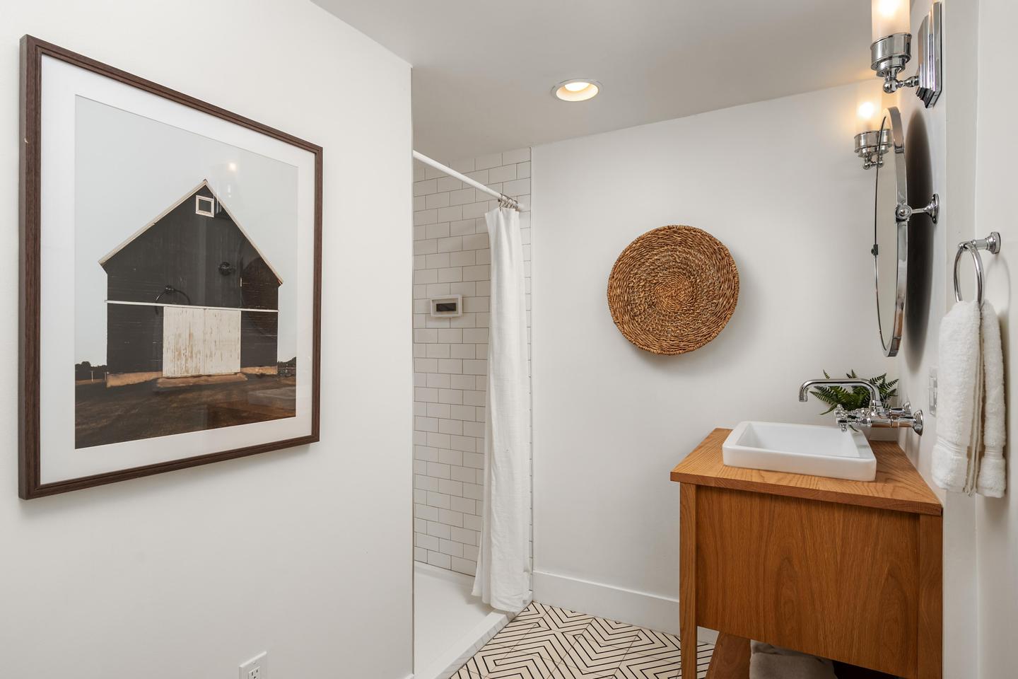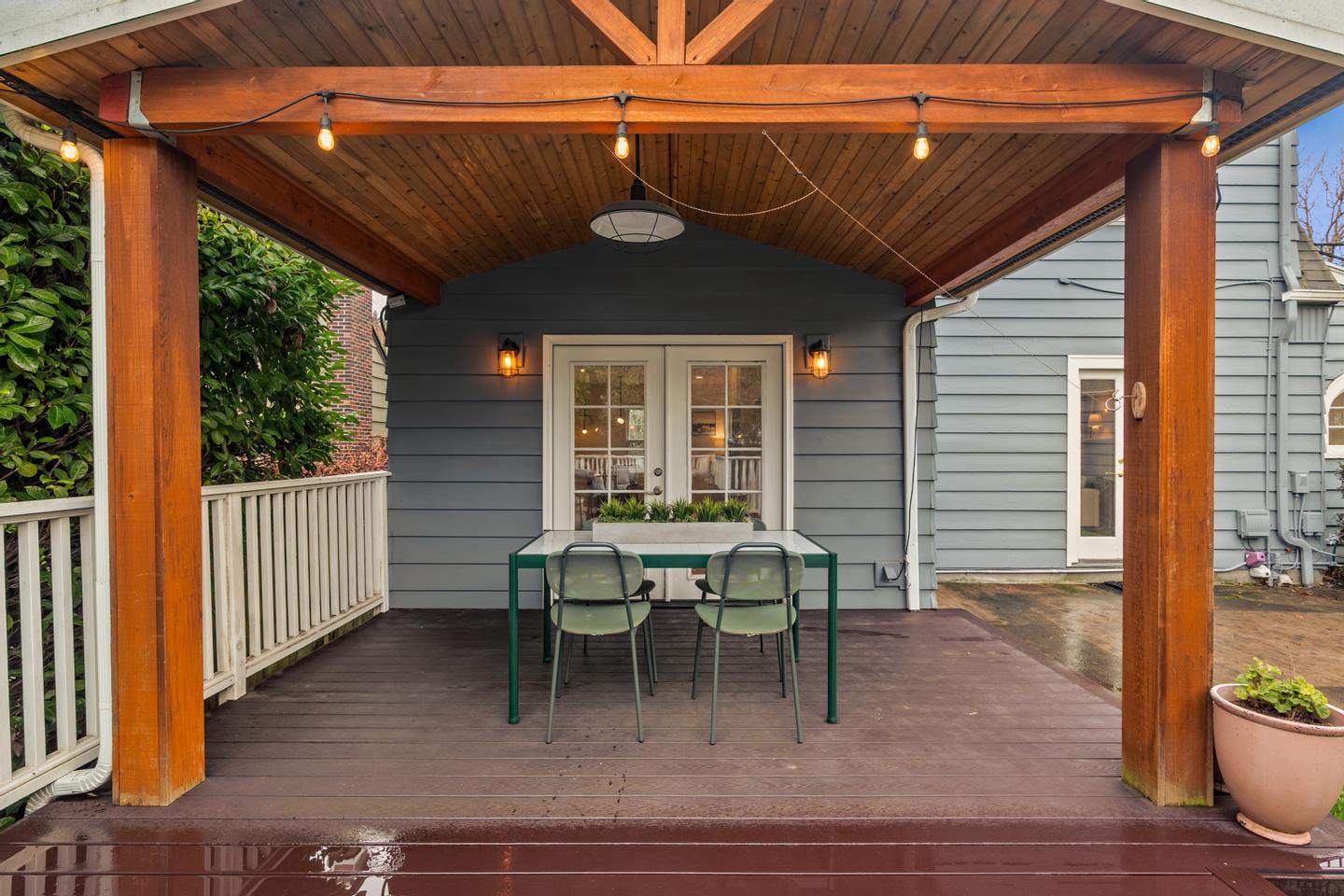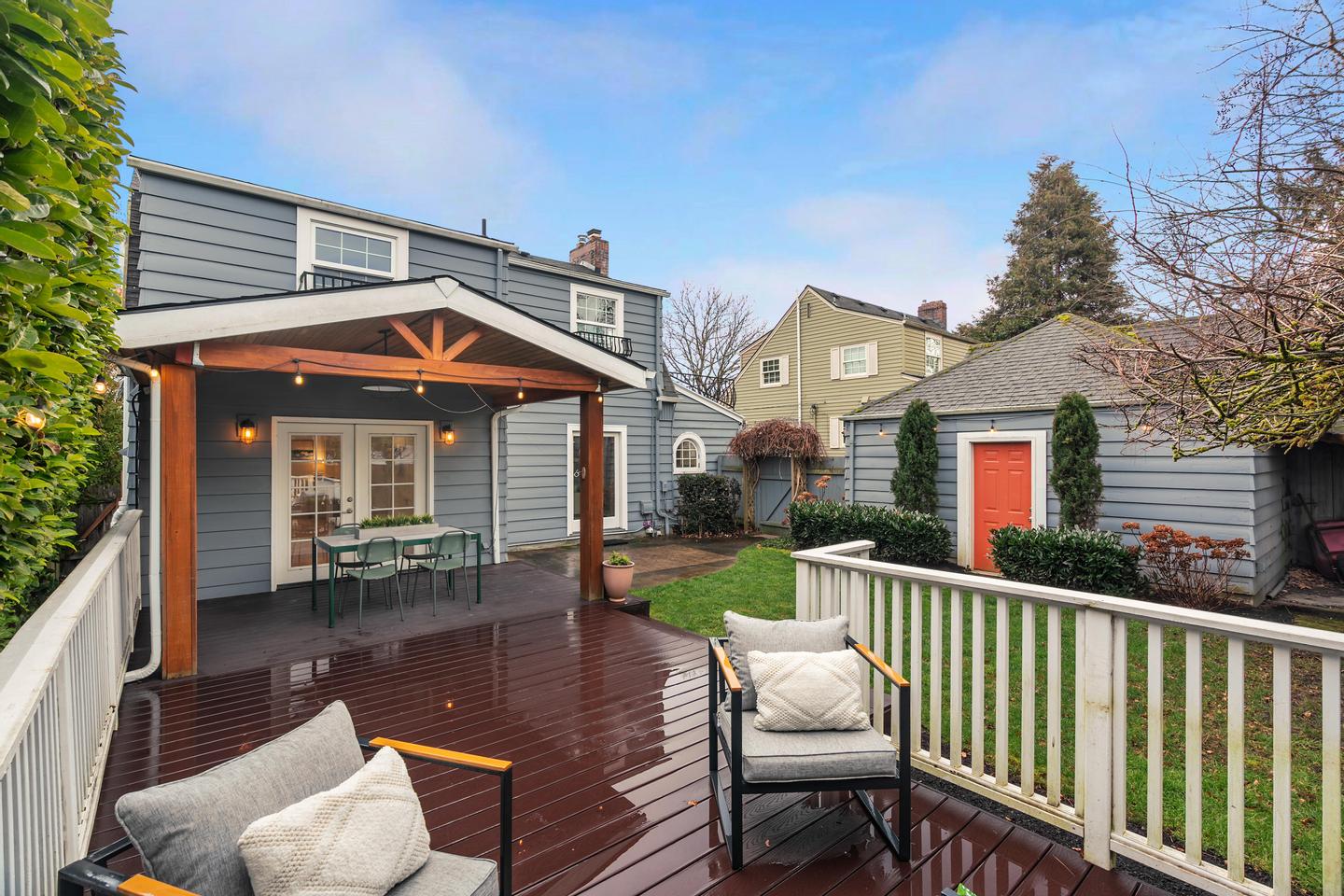 Originally built in 1928, this stunning Alameda cottage sits perfectly on NE 23rd, perched above one of the neighborhood's most beautiful tree lined streets. As you approach the home, its gorgeous color scheme, terraced grounds and classic gambrel roofline welcome you to the property. Entering the home you will immediately notice its expansive spaces and abundance of natural light. The living room features gorgeous oak hardwoods, a stately fireplace and double doors to the backyard. A large den / office to the south offers countless configuration options while a magazine-worthy, six figure kitchen bookends the living room to the north. A custom walnut built-in bench highlights the noteworthy finishes at the east end of the kitchen / dining area, while stunning Carrara marble counters, beautiful shaker inset cabinets, a 36 inch Bertazzoni range and period perfect fixtures round out the remainder of kitchen. French doors give you access to a gorgeous, open gable, covered deck, a sweet half bath sits just off the SW corner and clever cabinet doors in the middle of the kitchen give you access to the finished basement. With over 700 square feet, the lower level boasts a bedroom, updated bathroom, cozy family room and large laundry room with designer built-ins. Moving back upstairs to the second floor you will find three bedrooms and a second full bathroom. The bedrooms feature oak hardwoods, vinyl windows, designer colors and great vantage points at almost every angle. The upstairs bathroom has classic hex tile, a cast iron tub / shower, built-ins and a picture perfect window seat. With over 2500 square feet across three floors, the stewardship applied to the interior is also reflected on the exterior where gorgeous manicured grounds and established plantings highlight both the front and backyards. With an epic location just across from the Madeleine Field and a block to Guilder and Lucca you don't want to miss this turn-key Alameda home!