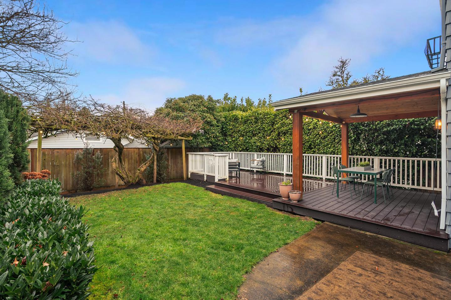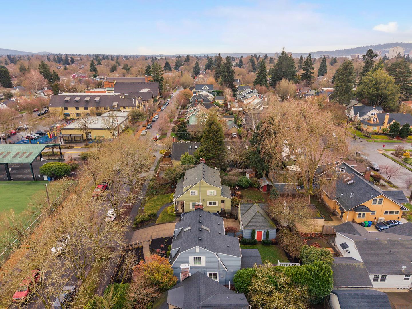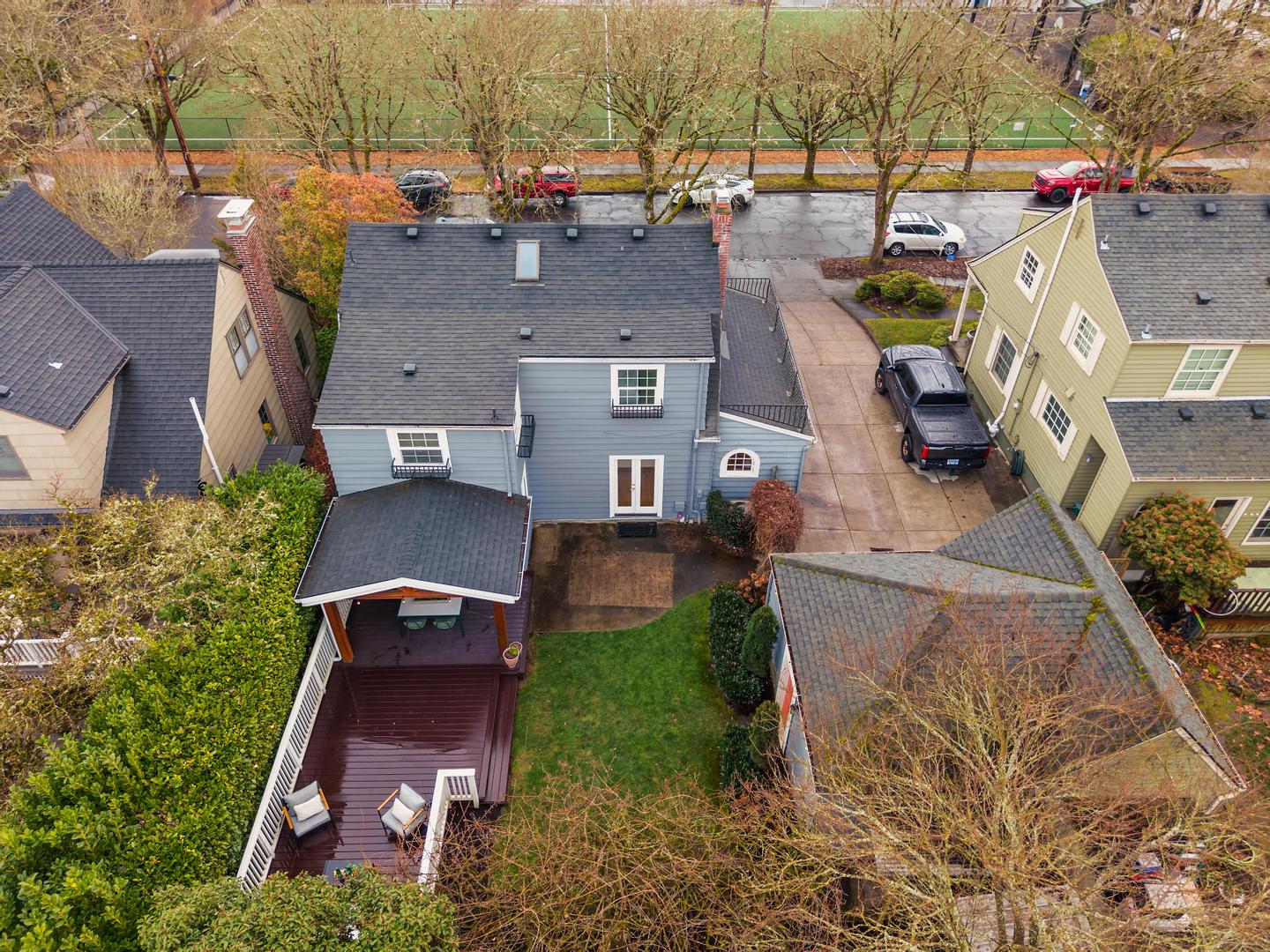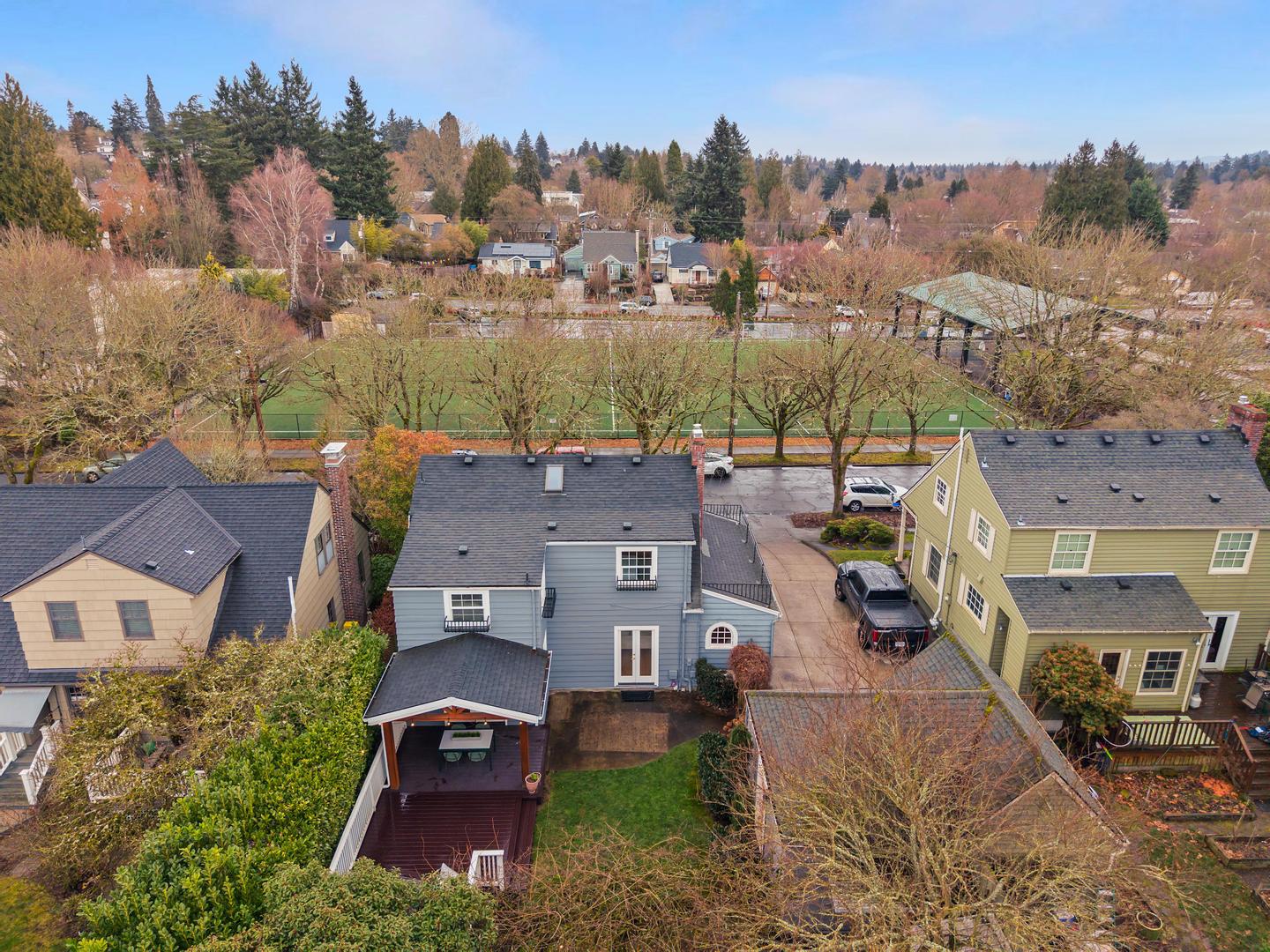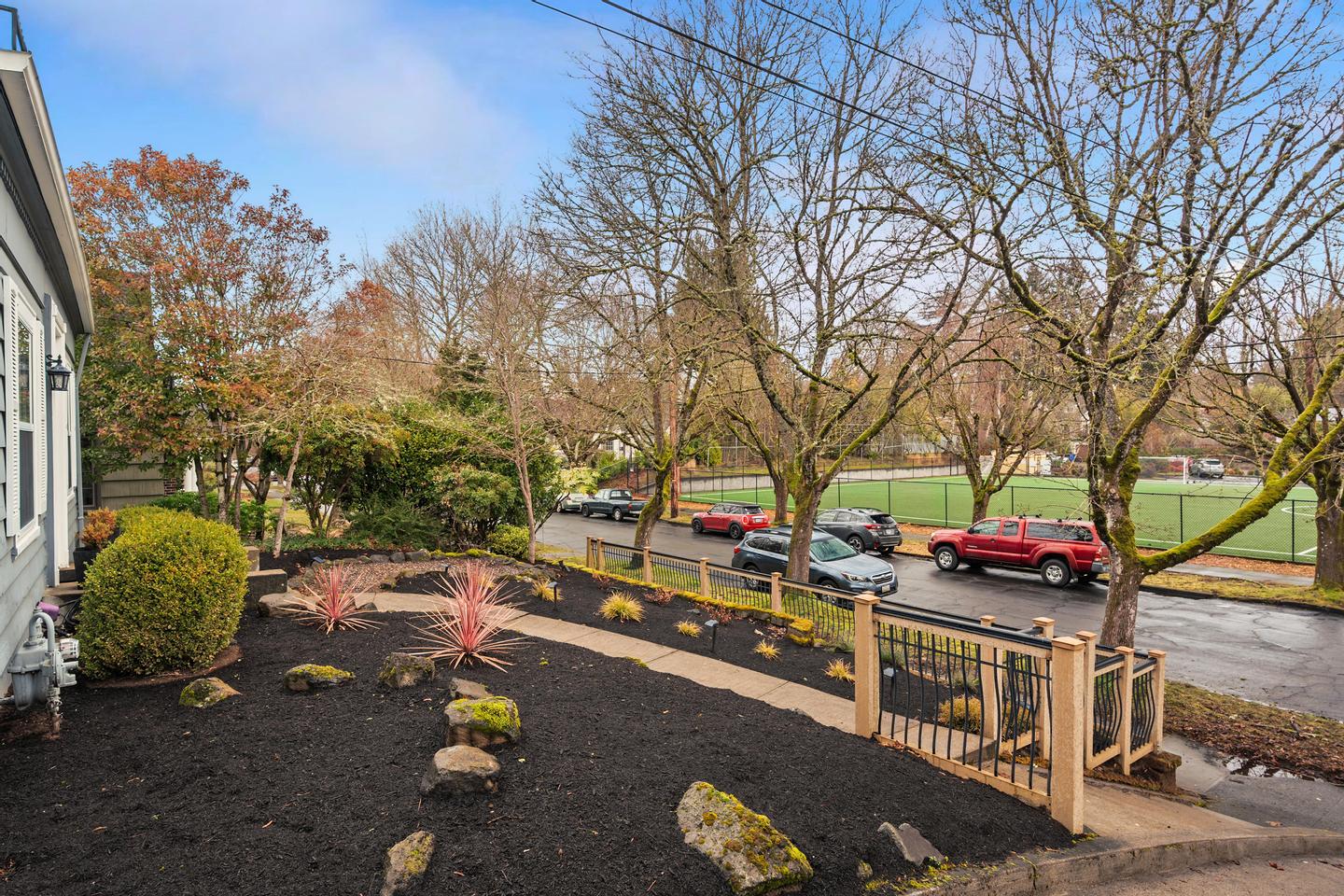 Originally built in 1928, this stunning Alameda cottage sits perfectly on NE 23rd, perched above one of the neighborhood's most beautiful tree lined streets. As you approach the home, its gorgeous color scheme, terraced grounds and classic gambrel roofline welcome you to the property. Entering the home you will immediately notice its expansive spaces and abundance of natural light. The living room features gorgeous oak hardwoods, a stately fireplace and double doors to the backyard. A large den / office to the south offers countless configuration options while a magazine-worthy, six figure kitchen bookends the living room to the north. A custom walnut built-in bench highlights the noteworthy finishes at the east end of the kitchen / dining area, while stunning Carrara marble counters, beautiful shaker inset cabinets, a 36 inch Bertazzoni range and period perfect fixtures round out the remainder of kitchen. French doors give you access to a gorgeous, open gable, covered deck, a sweet half bath sits just off the SW corner and clever cabinet doors in the middle of the kitchen give you access to the finished basement. With over 700 square feet, the lower level boasts a bedroom, updated bathroom, cozy family room and large laundry room with designer built-ins. Moving back upstairs to the second floor you will find three bedrooms and a second full bathroom. The bedrooms feature oak hardwoods, vinyl windows, designer colors and great vantage points at almost every angle. The upstairs bathroom has classic hex tile, a cast iron tub / shower, built-ins and a picture perfect window seat. With over 2500 square feet across three floors, the stewardship applied to the interior is also reflected on the exterior where gorgeous manicured grounds and established plantings highlight both the front and backyards. With an epic location just across from the Madeleine Field and a block to Guilder and Lucca you don't want to miss this turn-key Alameda home!
