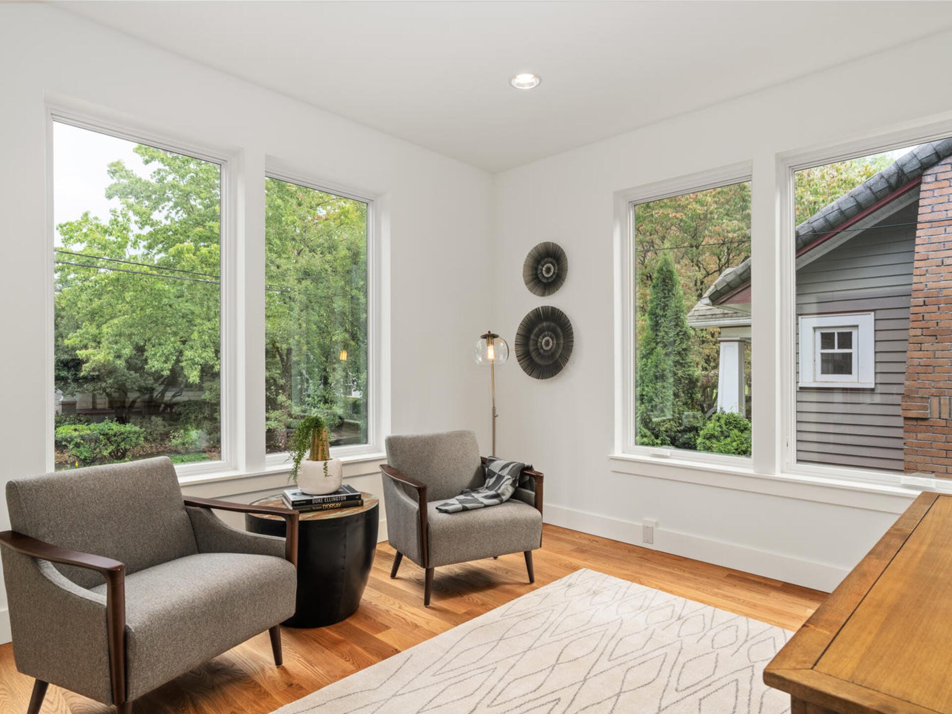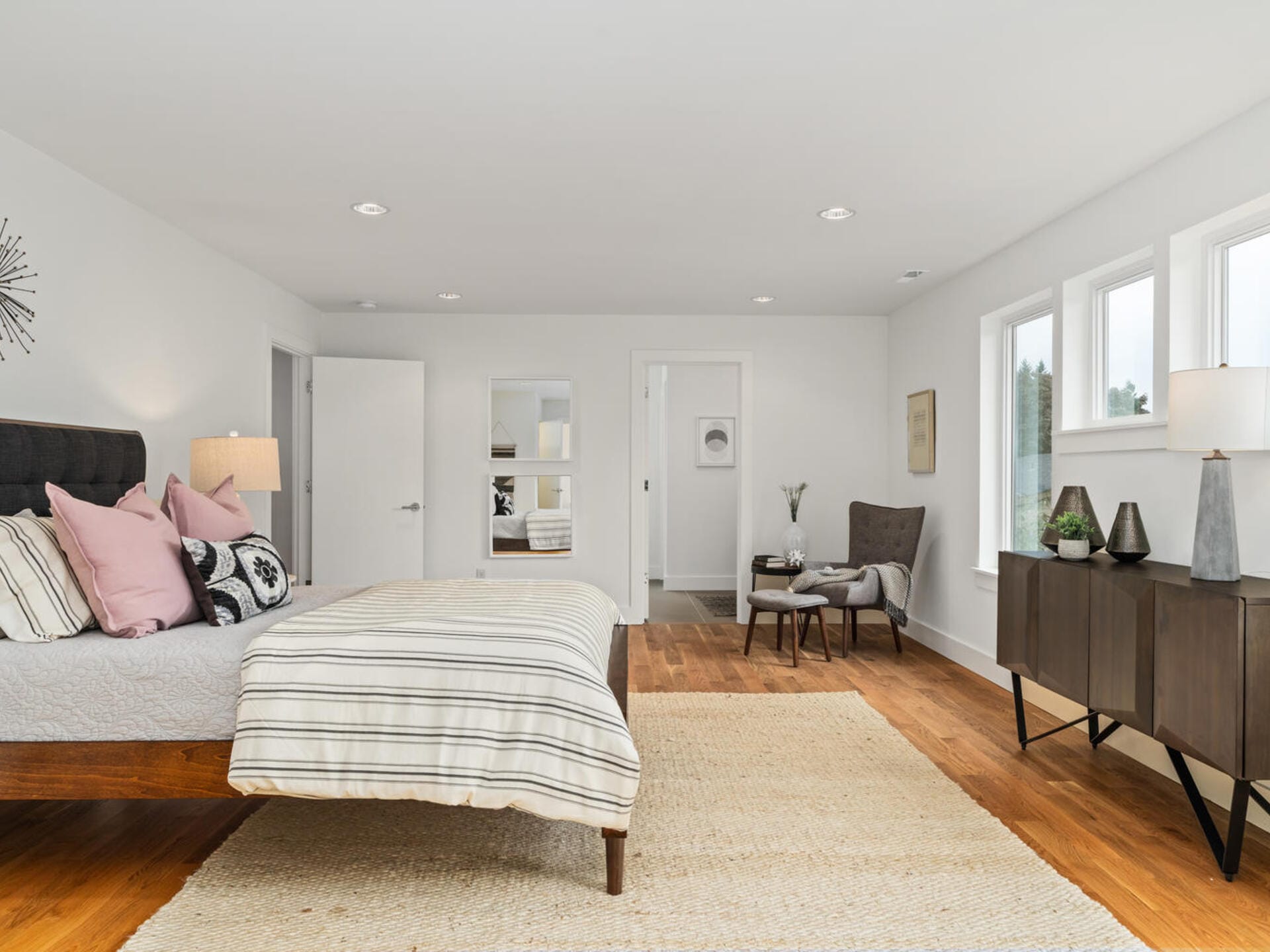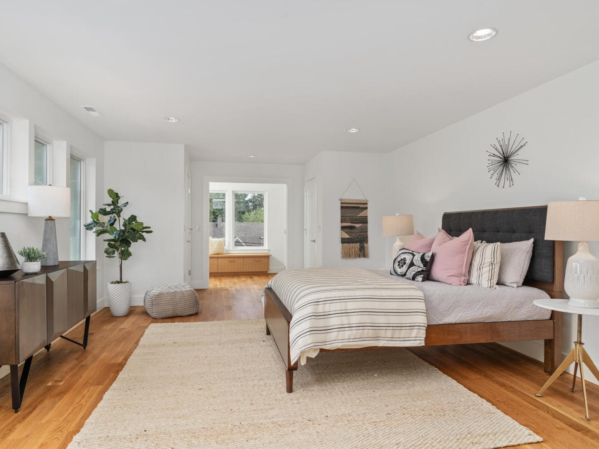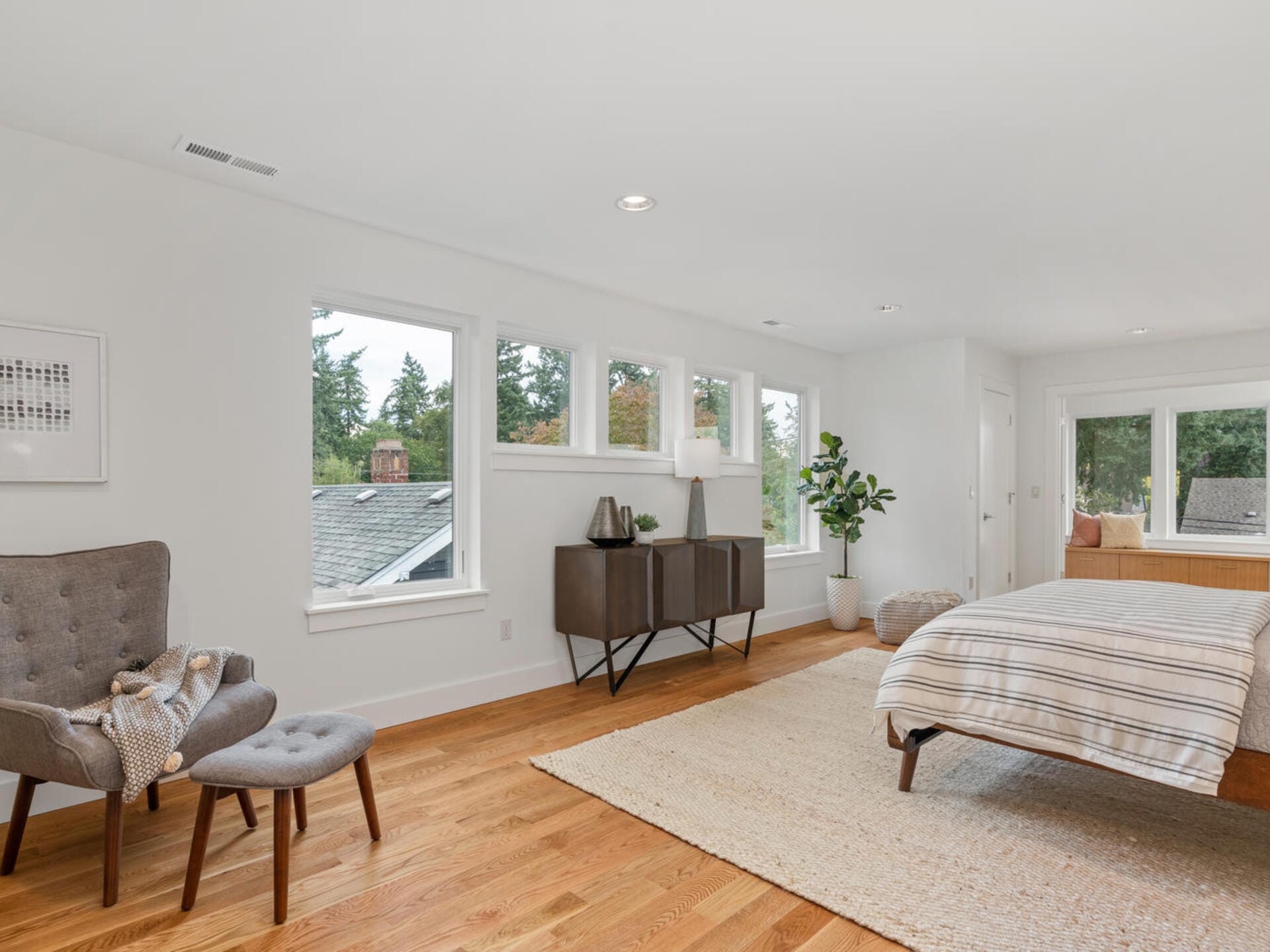 The main floor boasts an open living room and dining room with tall ceilings, tons of natural light and a main floor study or guest room tucked nicely in the SE corner. You can enter the great room / kitchen via a central hallway or through the open dining room where oak hardwoods are paired with rift white oak cabinetry and classic surface treatments. Cedar and Moss lighting, built-in bookshelves, and Ann Sacks swiss cross tiling on the fireplace speak to some of the high end finishes that compliment one of the finest kitchen / great rooms you will see on the Eastside. Rounding out the main floor is a full bathroom, which paired with the main floor office / bedroom makes a compelling statement, complimented by assets like the covered back porch which you reach through an expansive three panel door.