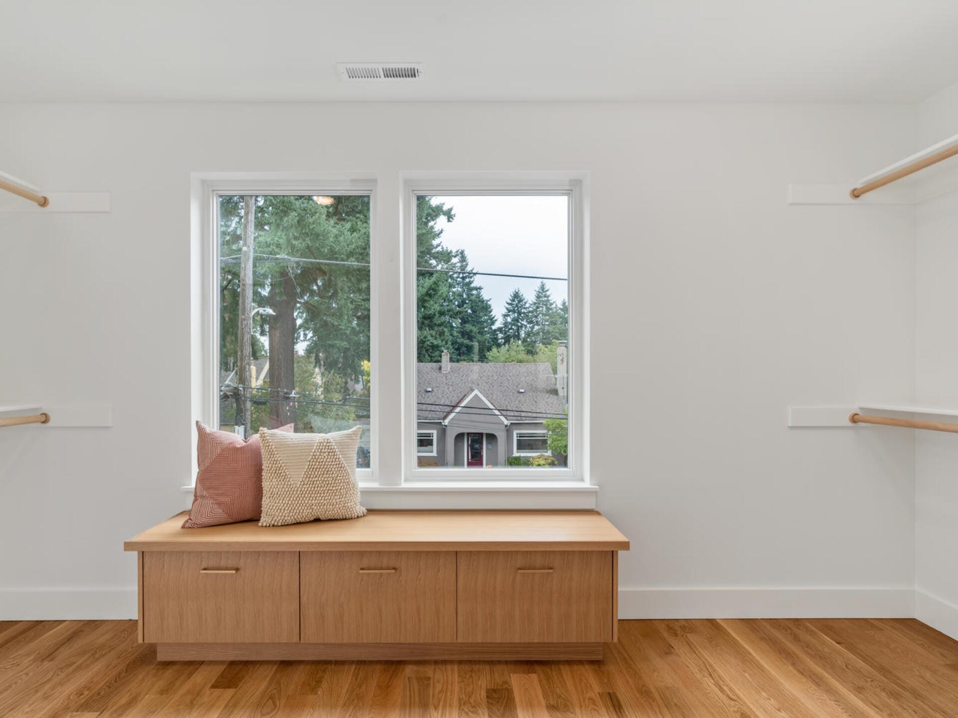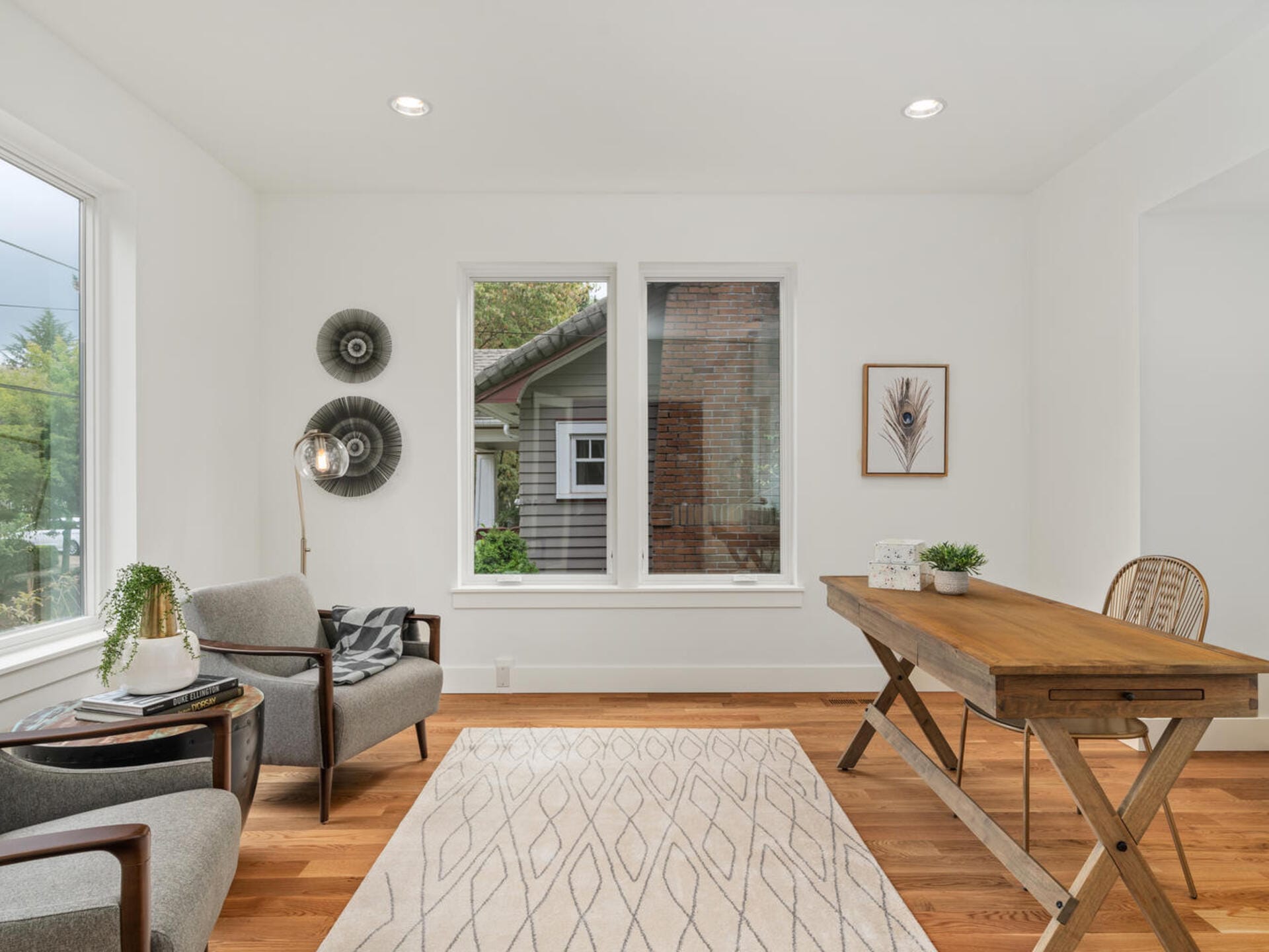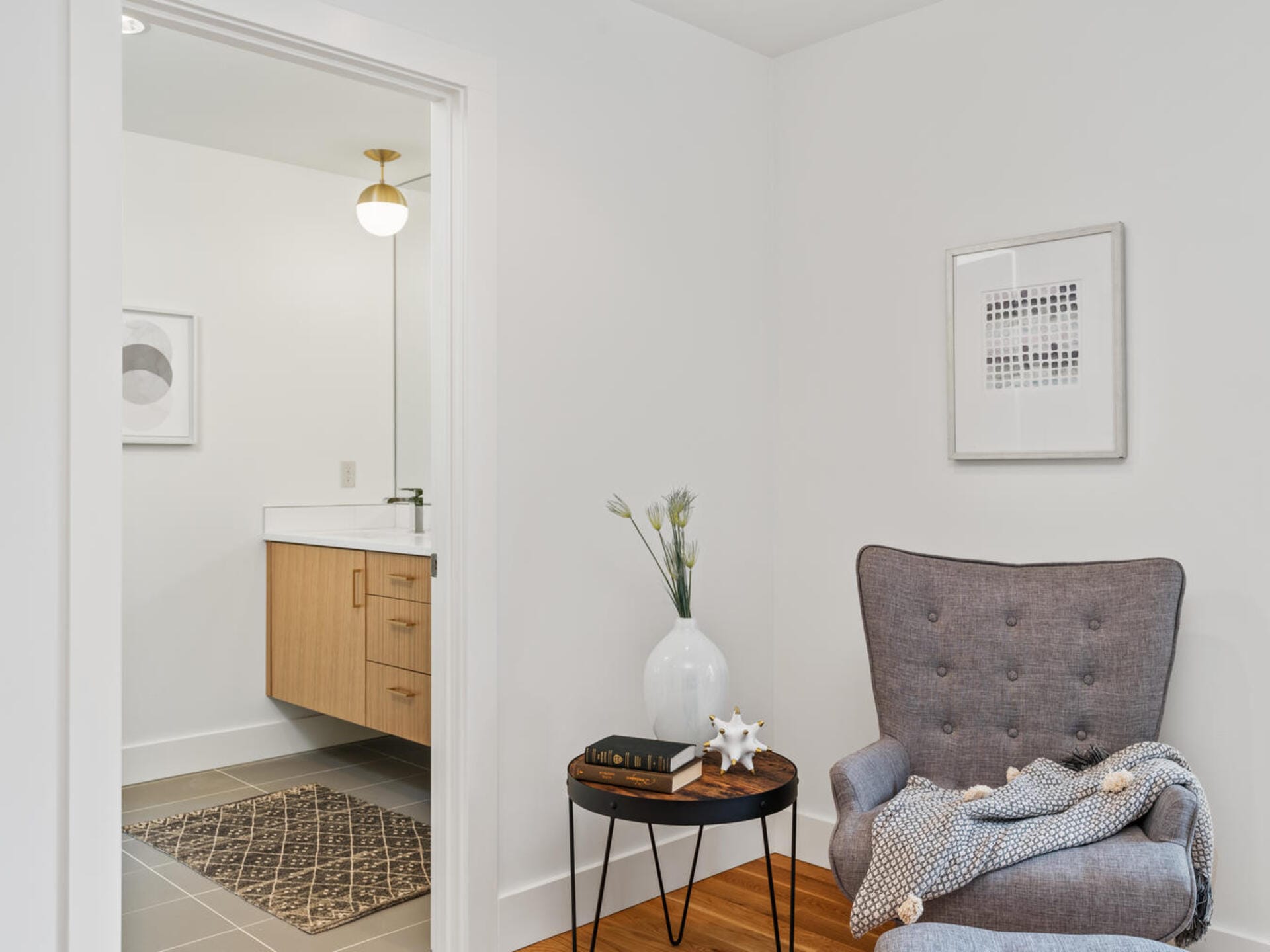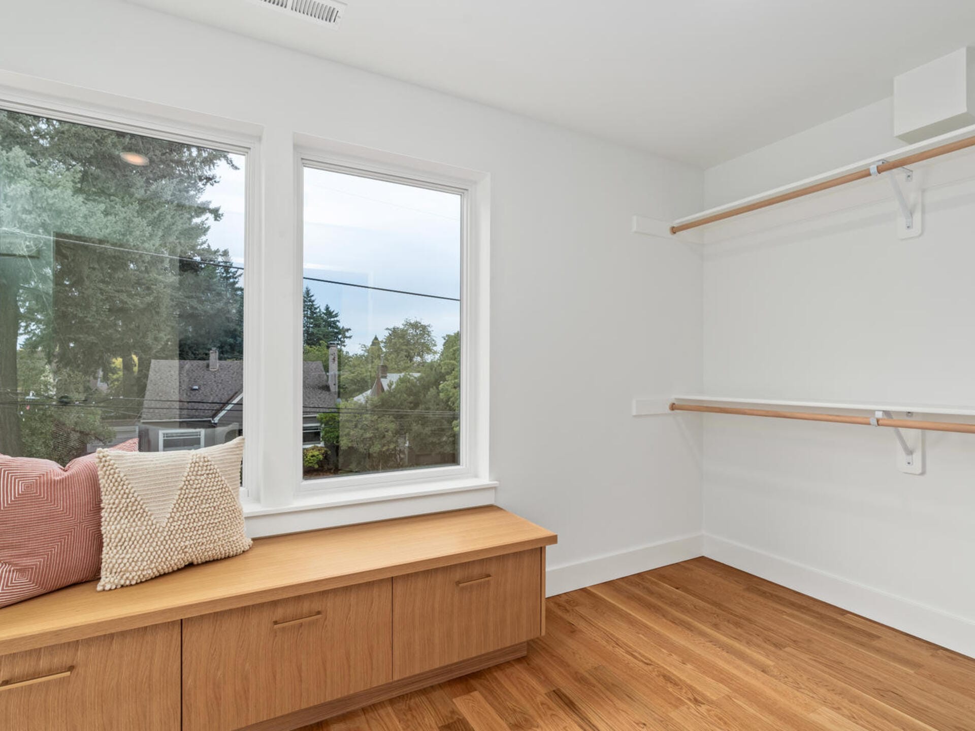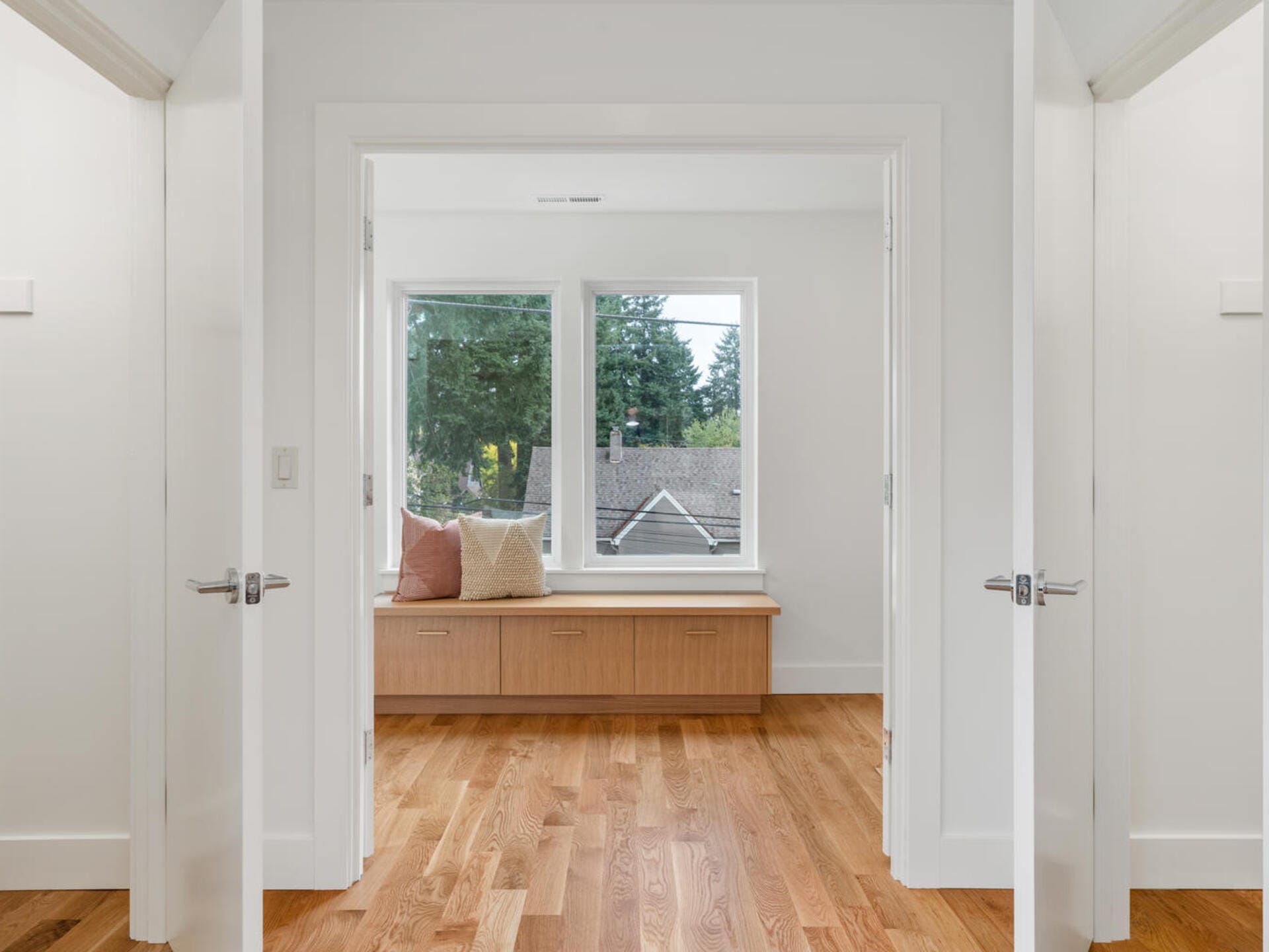 The main floor boasts an open living room and dining room with tall ceilings, tons of natural light and a main floor study or guest room tucked nicely in the SE corner. You can enter the great room / kitchen via a central hallway or through the open dining room where oak hardwoods are paired with rift white oak cabinetry and classic surface treatments. Cedar and Moss lighting, built-in bookshelves, and Ann Sacks swiss cross tiling on the fireplace speak to some of the high end finishes that compliment one of the finest kitchen / great rooms you will see on the Eastside. Rounding out the main floor is a full bathroom, which paired with the main floor office / bedroom makes a compelling statement, complimented by assets like the covered back porch which you reach through an expansive three panel door.