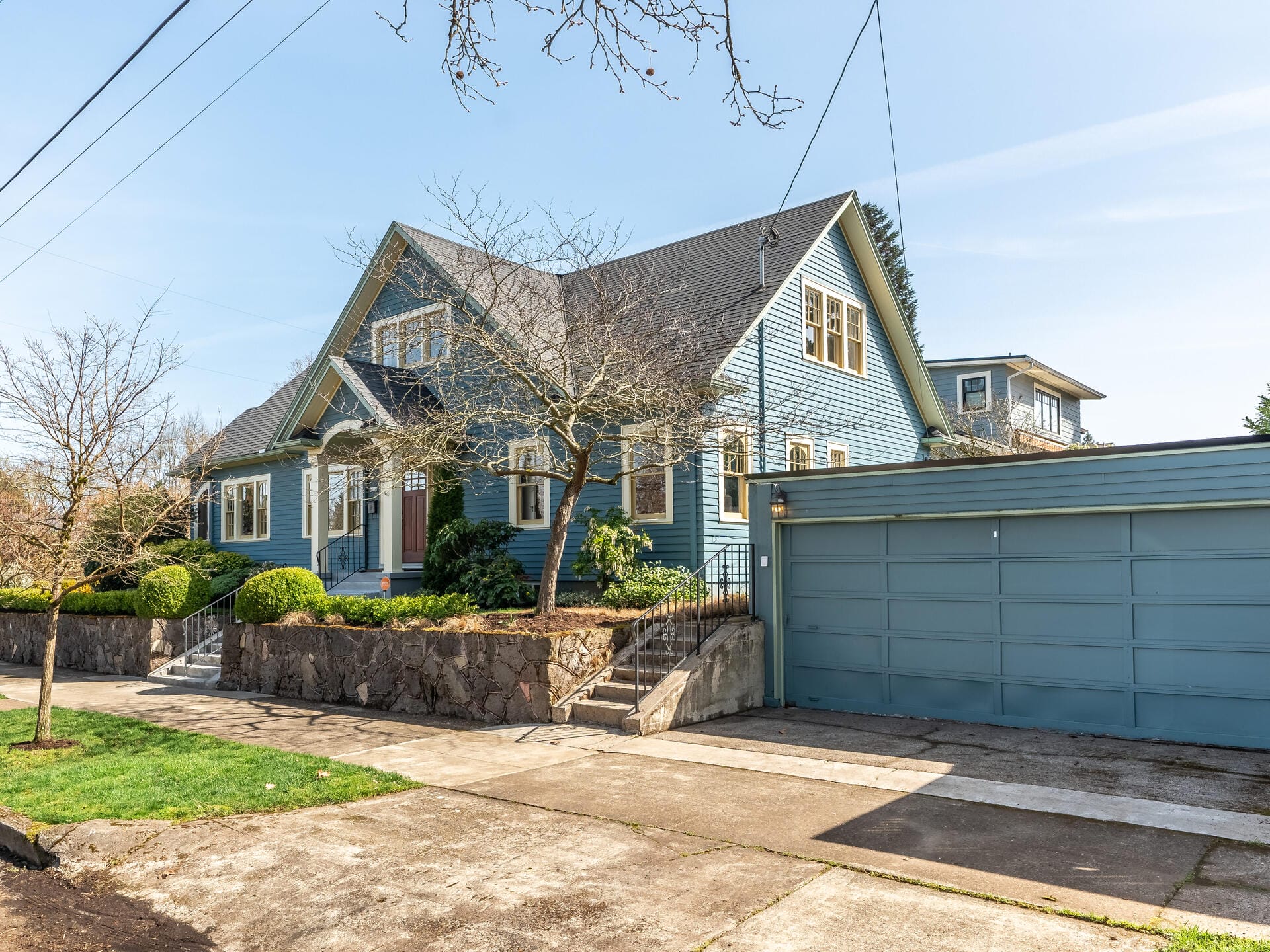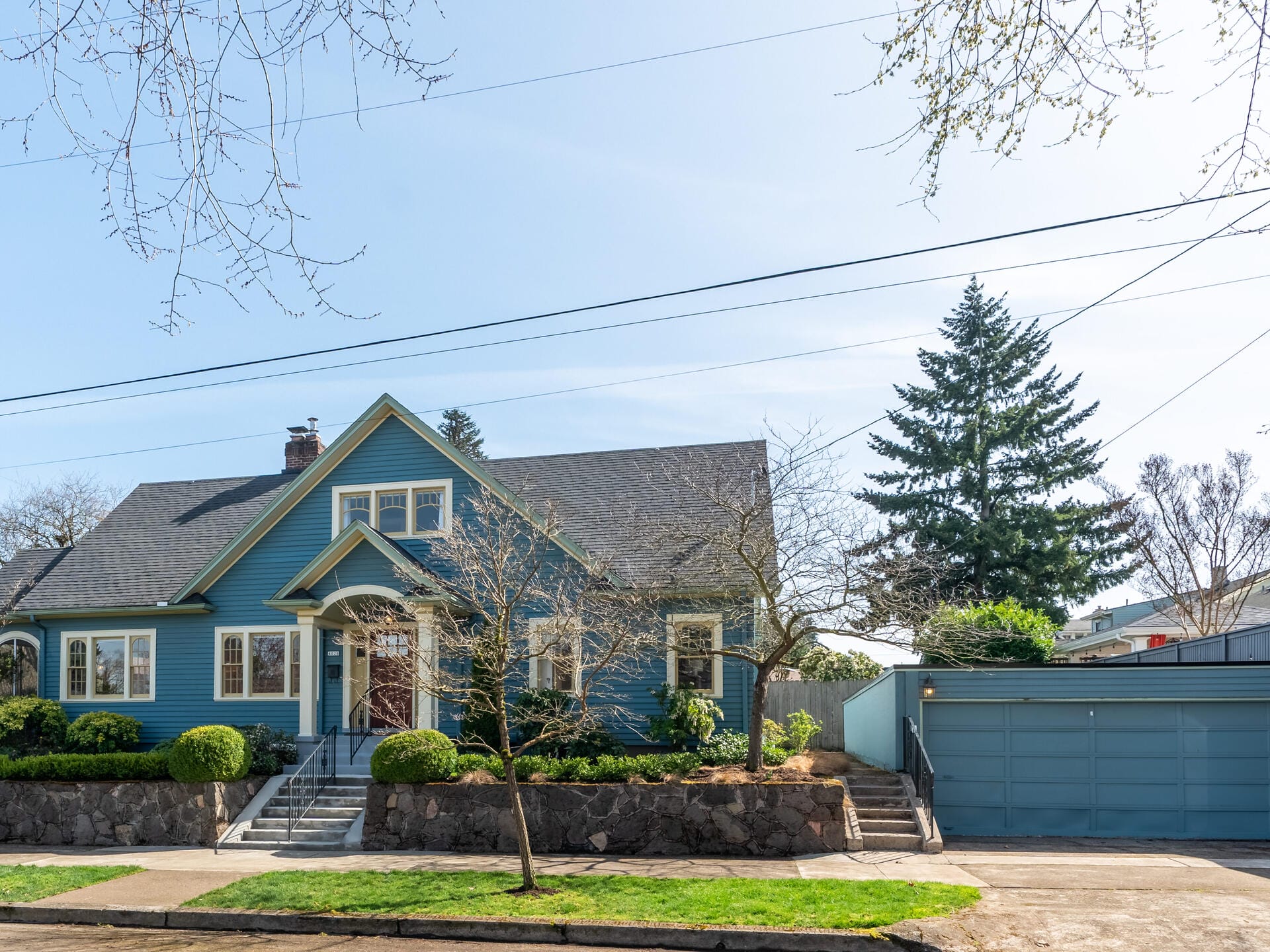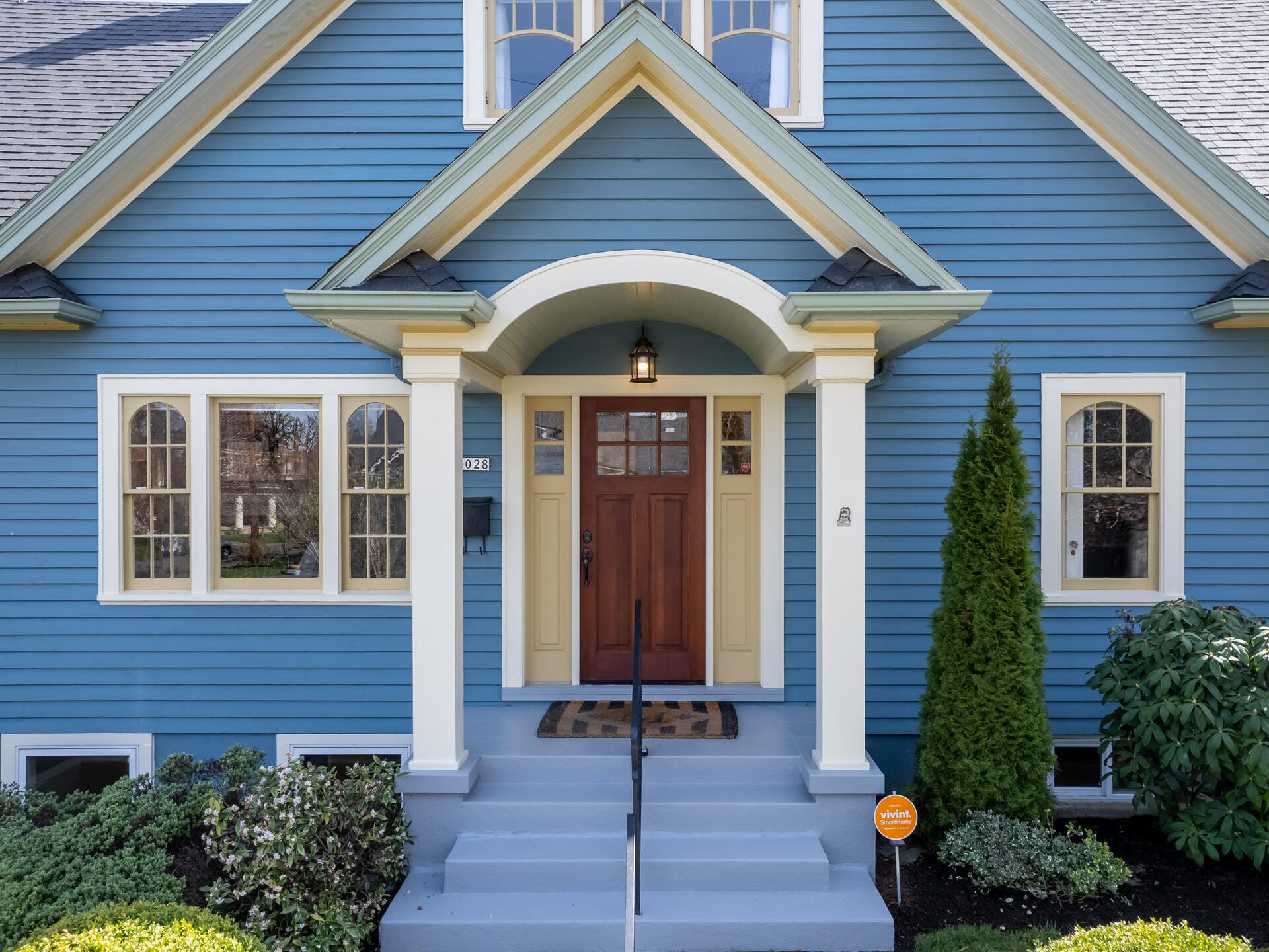A detailed pen drawing of a two-story house with a gabled roof, centered entrance with stairs, and symmetrical windows. It features a stone retaining wall, surrounded by trees and shrubs.