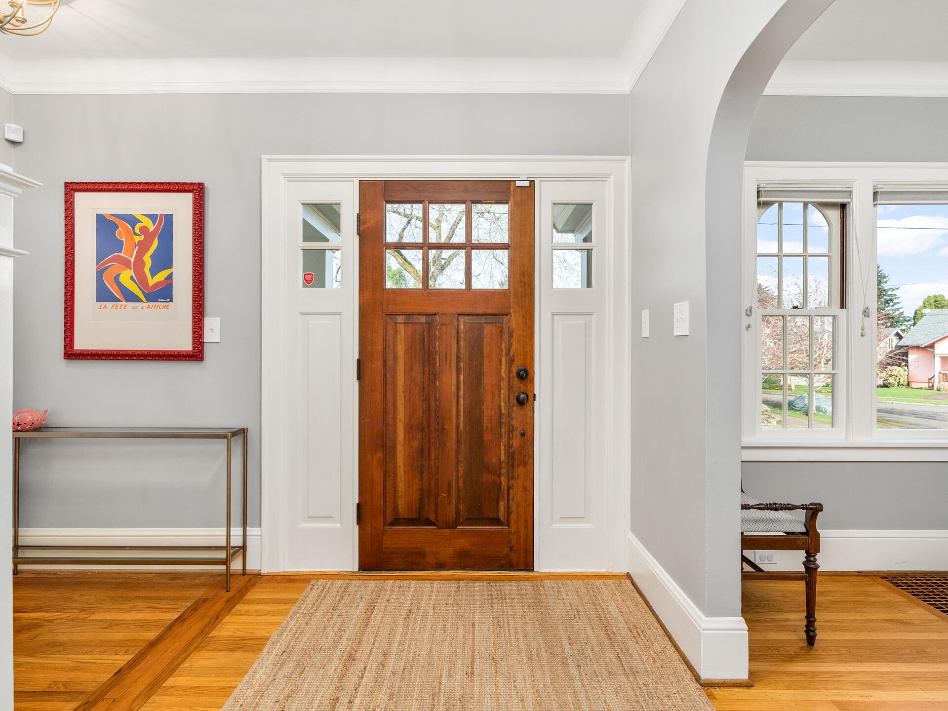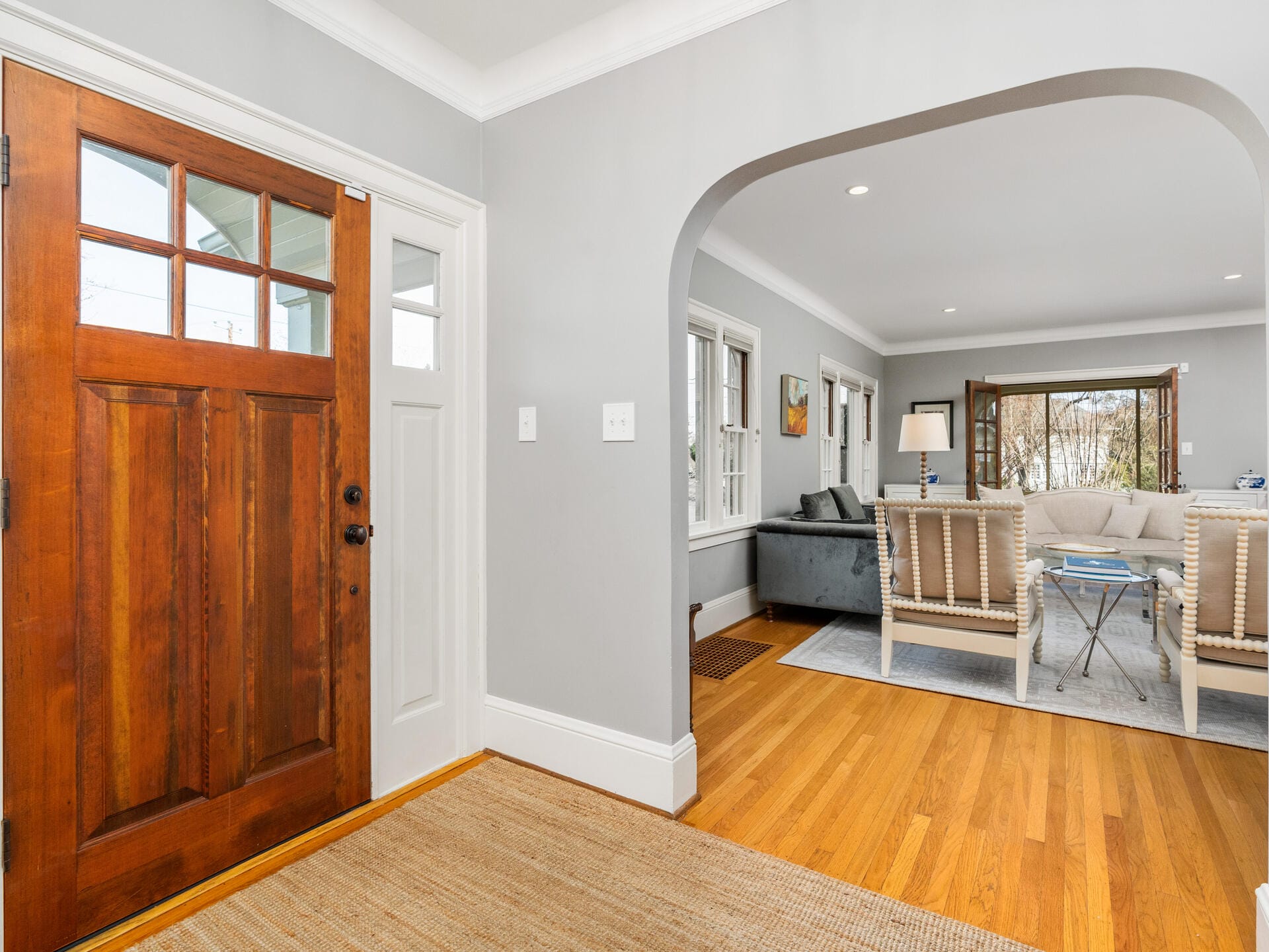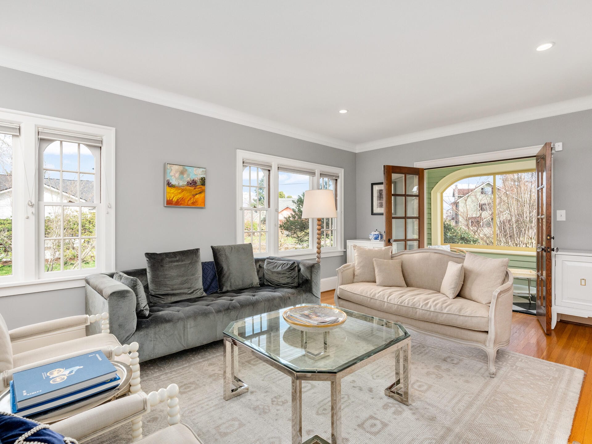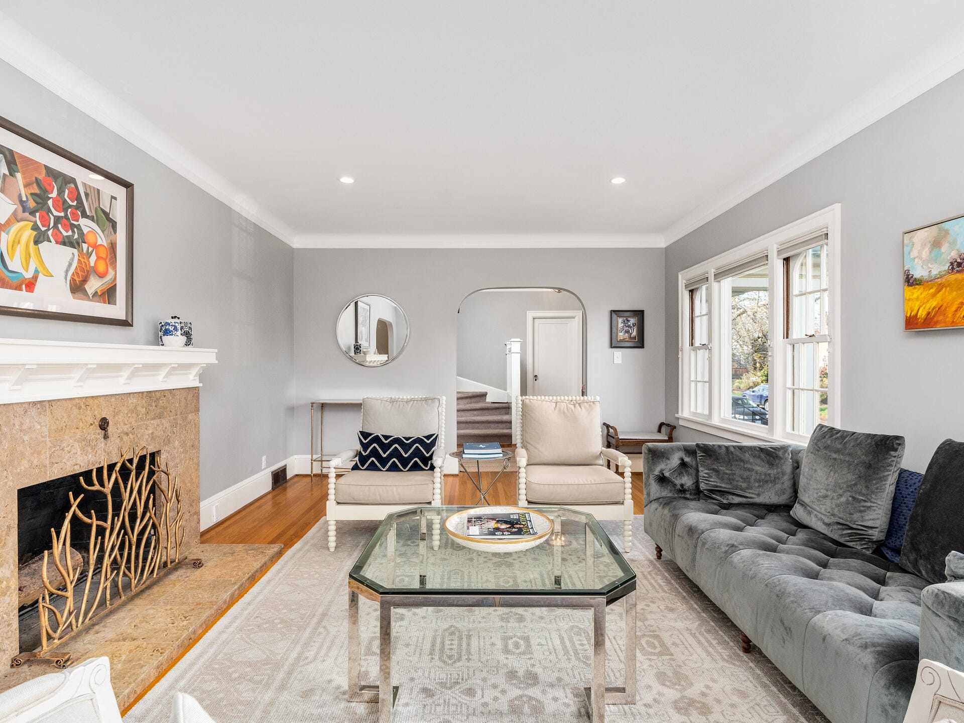 A detailed pen drawing of a two-story house with a gabled roof, centered entrance with stairs, and symmetrical windows. It features a stone retaining wall, surrounded by trees and shrubs.