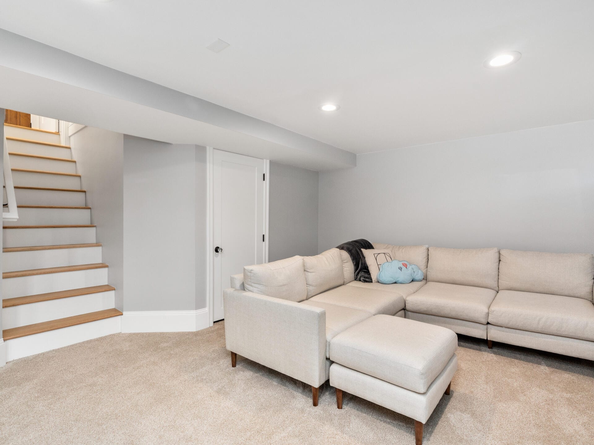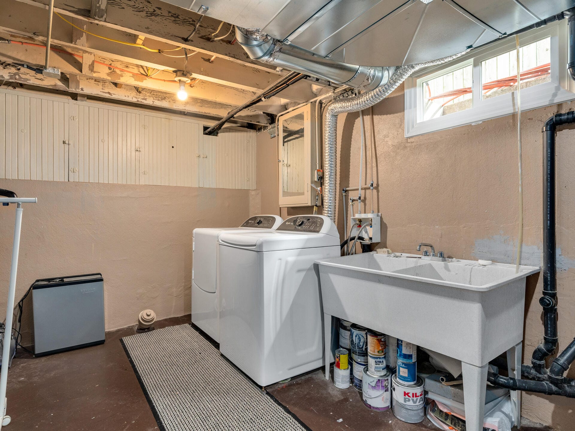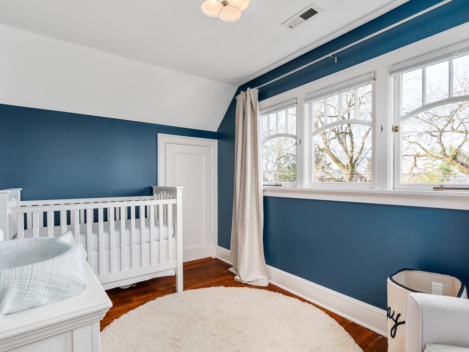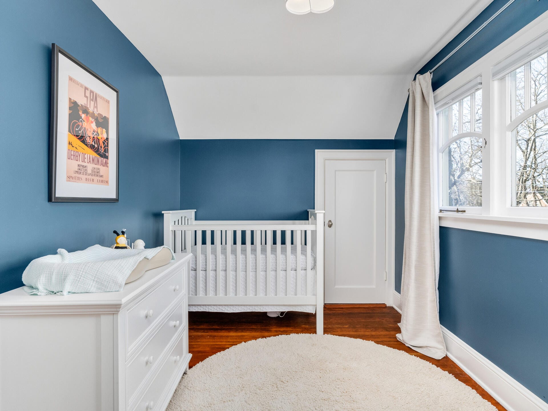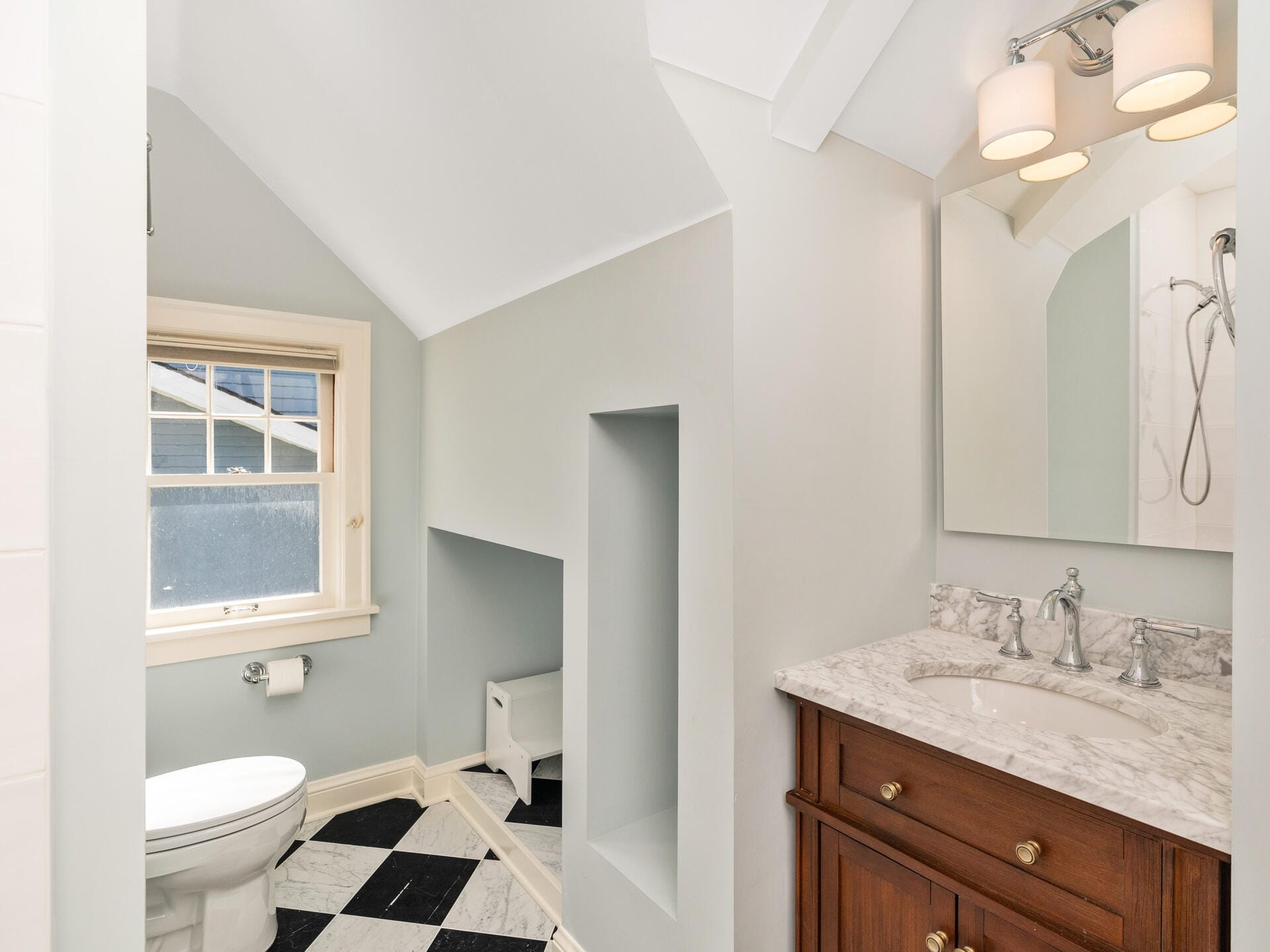A detailed pen drawing of a two-story house with a gabled roof, centered entrance with stairs, and symmetrical windows. It features a stone retaining wall, surrounded by trees and shrubs.