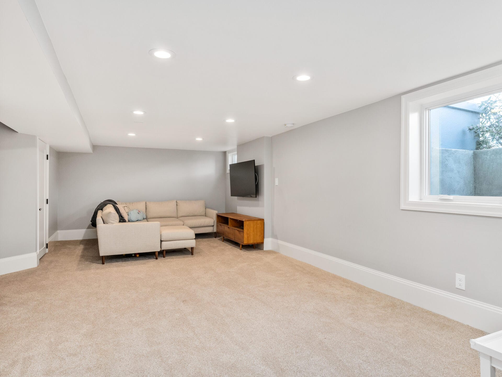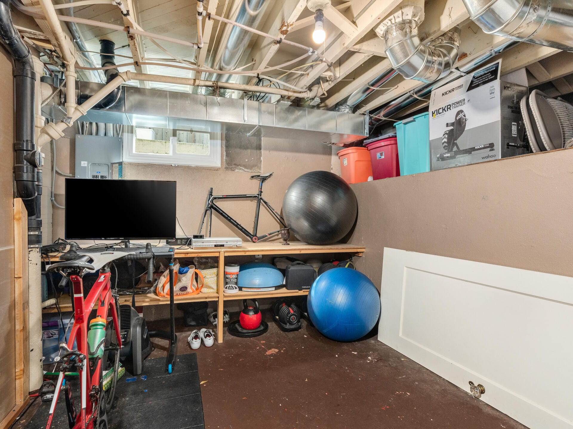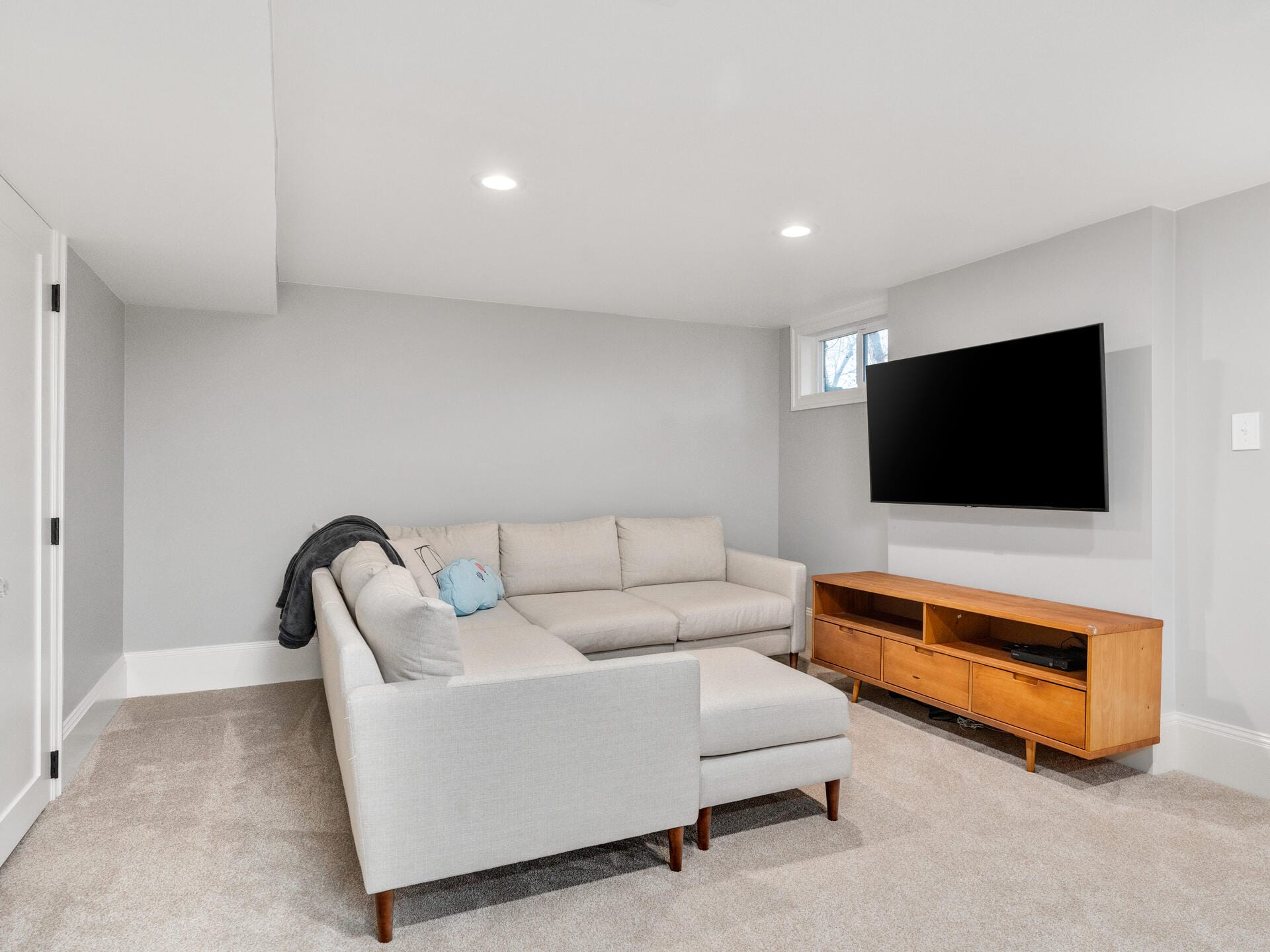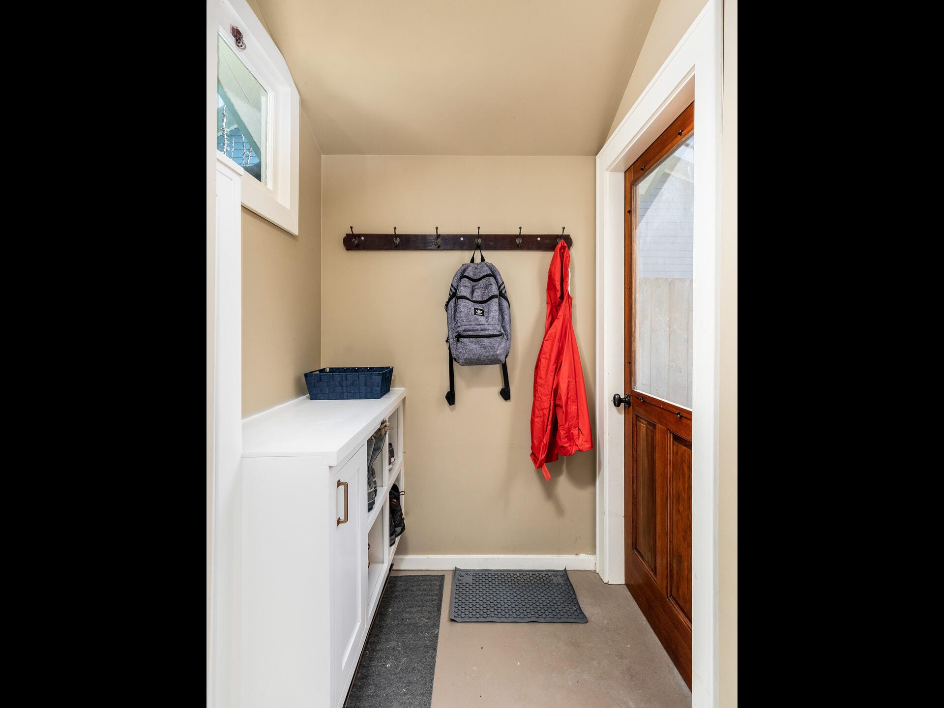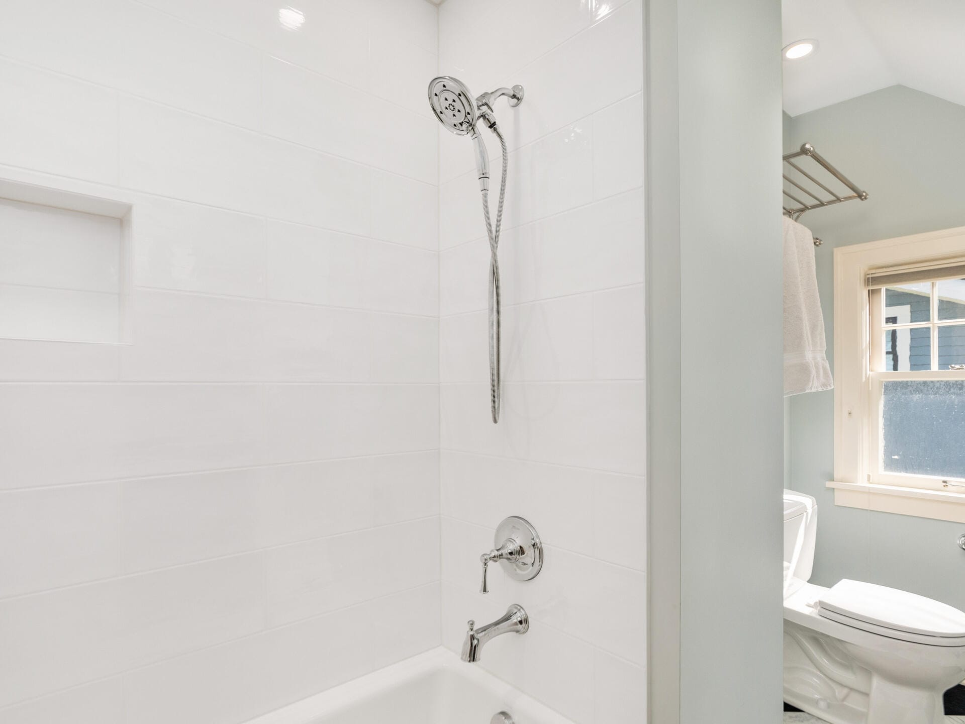 A detailed pen drawing of a two-story house with a gabled roof, centered entrance with stairs, and symmetrical windows. It features a stone retaining wall, surrounded by trees and shrubs.