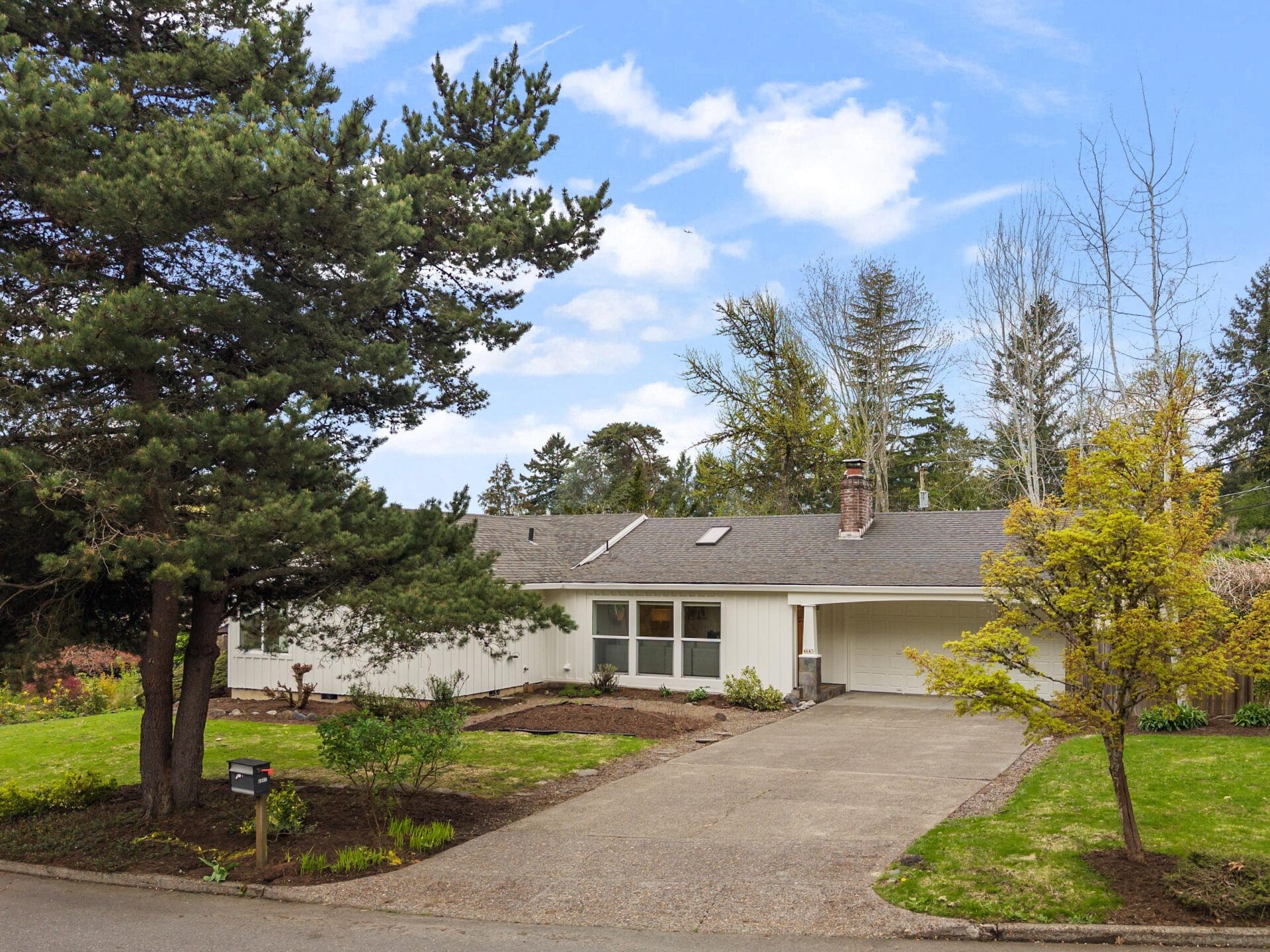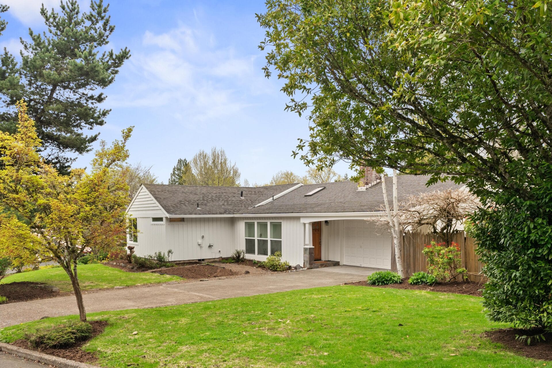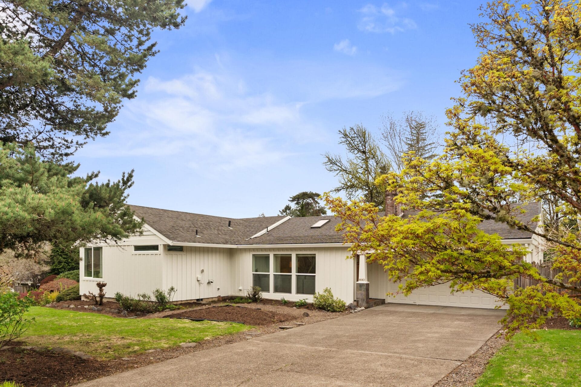 Originally built in 1956, this stunning mid-century stands prominently today on one of Bridlemile's classic southwest streets. The home's expansive footprint is evident from the moment you witness the gorgeous east facing elevation. Upon entering the home, you find yourself in its trademark great room. East facing windows standing in soldier fashion alongside a perfectly positioned skylight introduce natural light to the space, while oak hardwoods, a stately wood burning fireplace and designer colors round out the gorgeous finish palette. Seamlessly tied to the kitchen and dining room, this home features one of the single most sought after floor plan elements in today's market. The kitchen is highlighted by a large cook's island, updated counters and cabinetry as well as a set of sliding doors that give you the perfect flow and perspective of the backyard. As a testament to mid-century architecture, this home has a simple delineation of its formal spaces from its bedrooms. A primary hallway takes you from the great room down an L shaped wing of the home that boasts four bedrooms and two full bathrooms. Oak hardwoods run throughout three of the bedrooms while wall to wall carpet graces the floor of the primary suite. Anchoring the SE corner of the home, the primary bedroom boasts vaulted ceilings, a walk-in closet and an updated en suite bathroom. The bathroom features a tile set shower surround, single vanity and classic finish details. Like the interior, the stewards of this home have paid careful attention to the grounds and envelope, updating details at every turn. The backyard features an expansive cedar deck, tree house, established trees and a separate south facing garden area. Recently repainted, the classic white, board and batten envelope coupled with updated, white, dual paned vinyl windows and a solid stained cedar front door make this home stand out on a street with numerous other noteworthy mid century ranch homes. You don't want to miss this gorgeous Bridlemile property with an address just a short distance from multiple parks, the elementary school and countless shops!