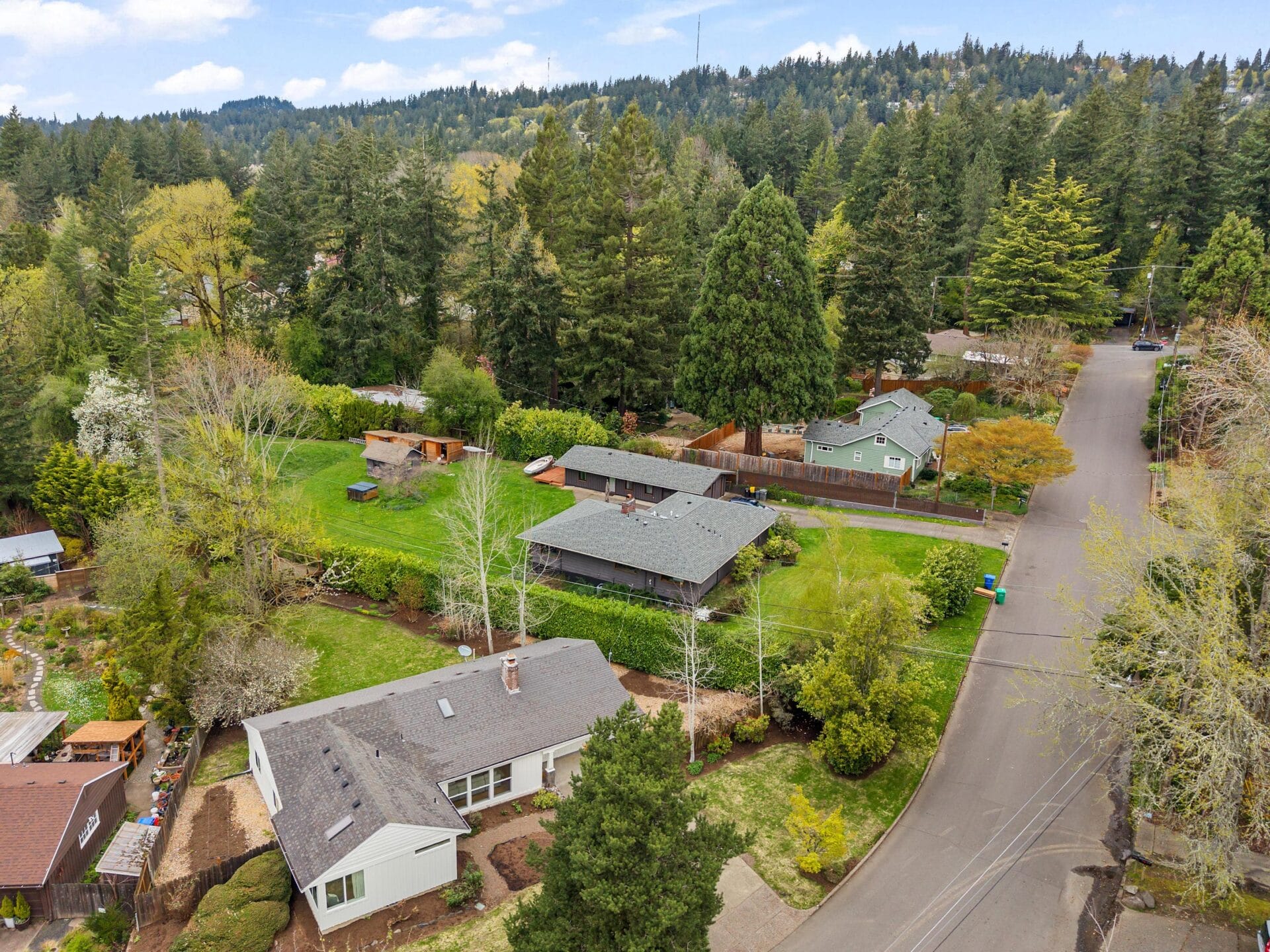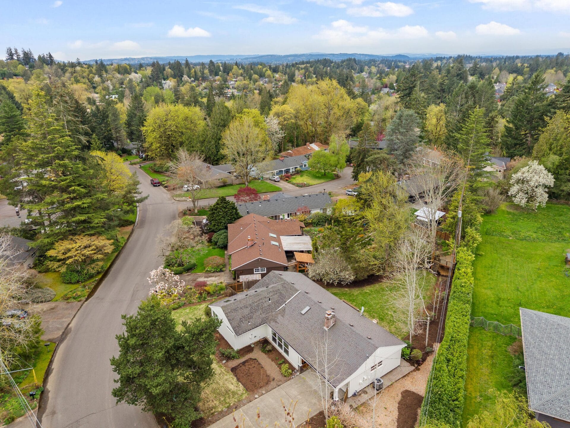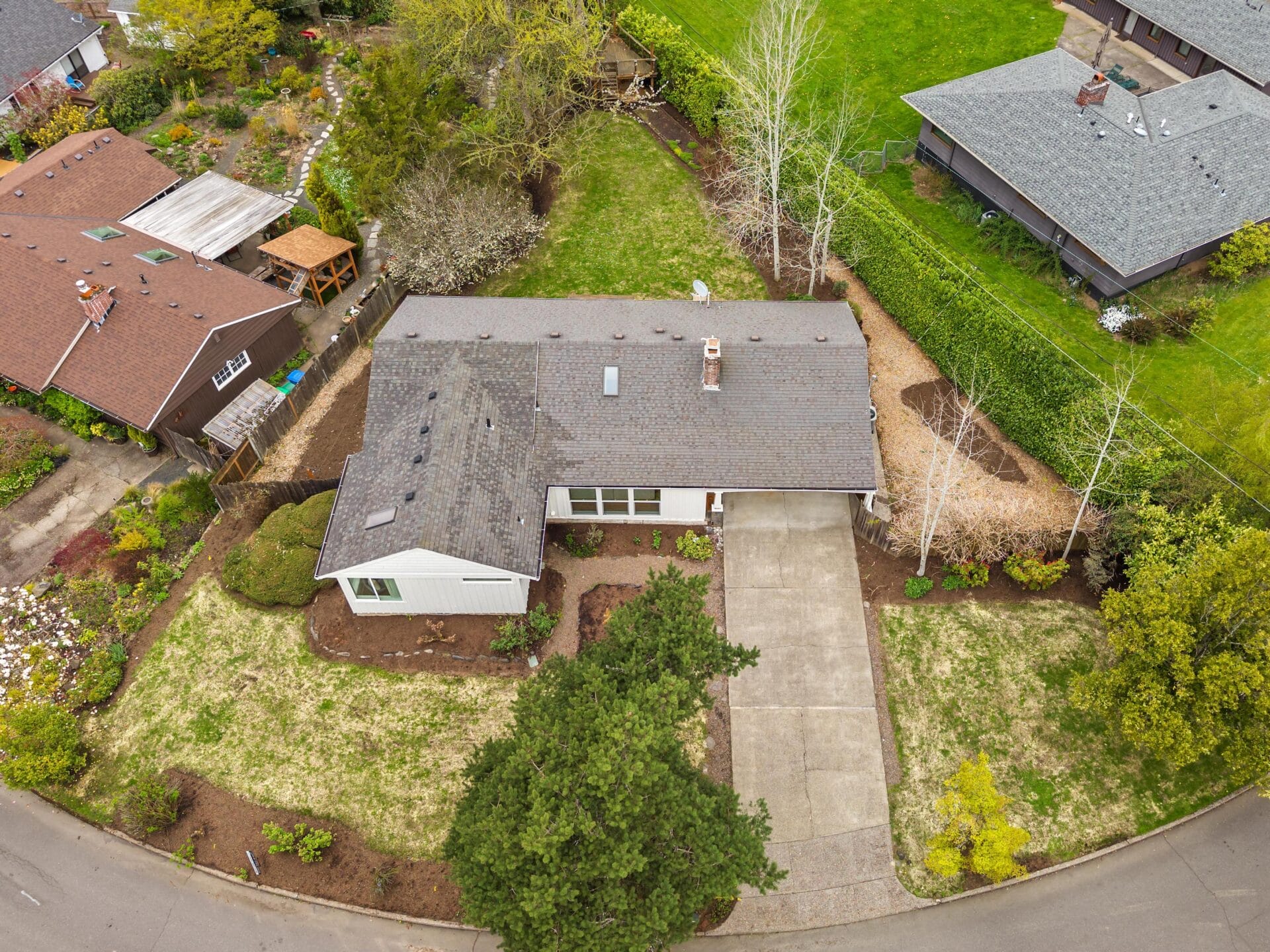 Originally built in 1956, this stunning mid-century stands prominently today on one of Bridlemile's classic southwest streets. The home's expansive footprint is evident from the moment you witness the gorgeous east facing elevation. Upon entering the home, you find yourself in its trademark great room. East facing windows standing in soldier fashion alongside a perfectly positioned skylight introduce natural light to the space, while oak hardwoods, a stately wood burning fireplace and designer colors round out the gorgeous finish palette. Seamlessly tied to the kitchen and dining room, this home features one of the single most sought after floor plan elements in today's market. The kitchen is highlighted by a large cook's island, updated counters and cabinetry as well as a set of sliding doors that give you the perfect flow and perspective of the backyard. As a testament to mid-century architecture, this home has a simple delineation of its formal spaces from its bedrooms. A primary hallway takes you from the great room down an L shaped wing of the home that boasts four bedrooms and two full bathrooms. Oak hardwoods run throughout three of the bedrooms while wall to wall carpet graces the floor of the primary suite. Anchoring the SE corner of the home, the primary bedroom boasts vaulted ceilings, a walk-in closet and an updated en suite bathroom. The bathroom features a tile set shower surround, single vanity and classic finish details. Like the interior, the stewards of this home have paid careful attention to the grounds and envelope, updating details at every turn. The backyard features an expansive cedar deck, tree house, established trees and a separate south facing garden area. Recently repainted, the classic white, board and batten envelope coupled with updated, white, dual paned vinyl windows and a solid stained cedar front door make this home stand out on a street with numerous other noteworthy mid century ranch homes. You don't want to miss this gorgeous Bridlemile property with an address just a short distance from multiple parks, the elementary school and countless shops!