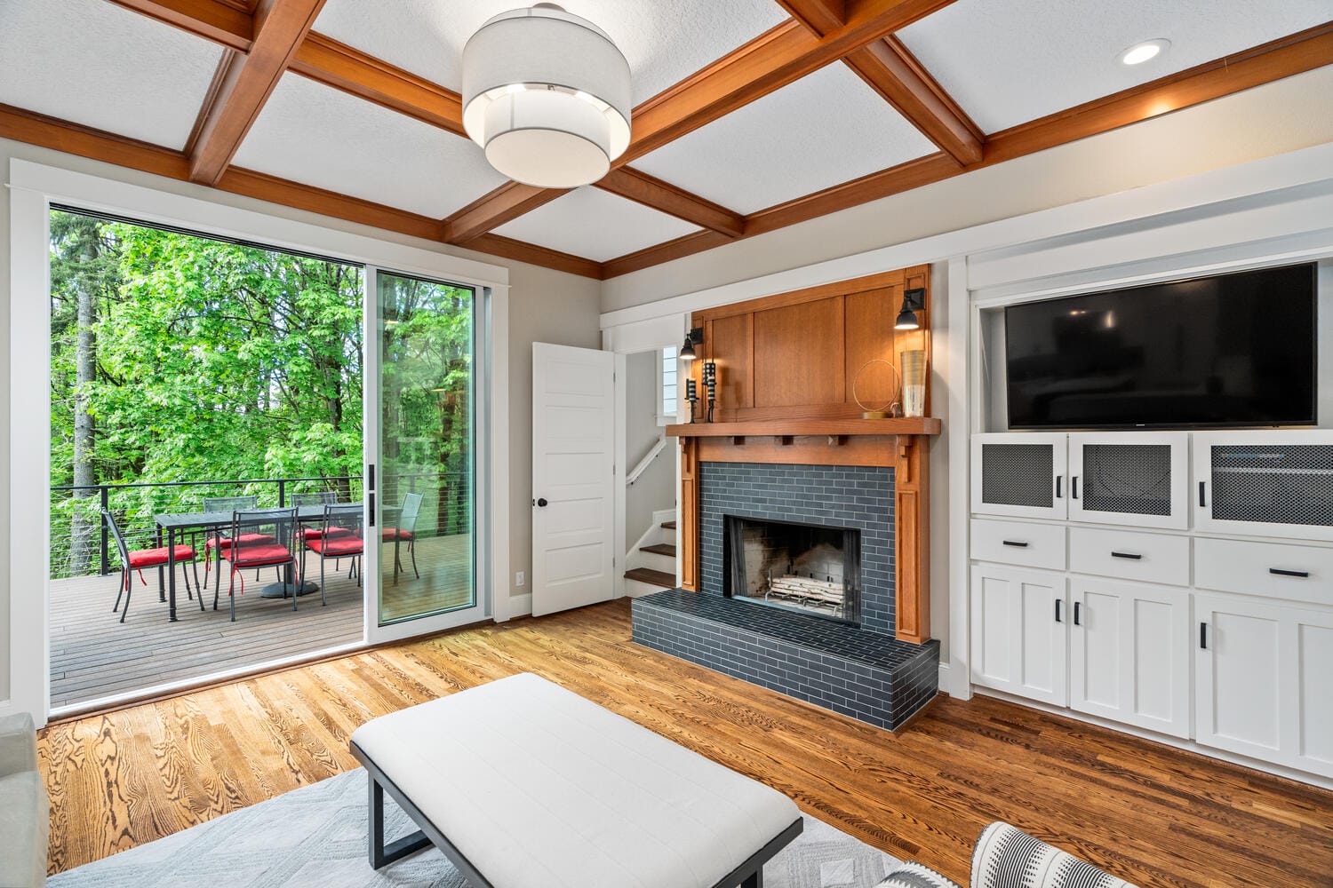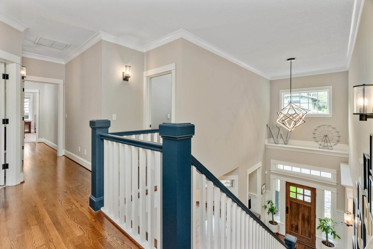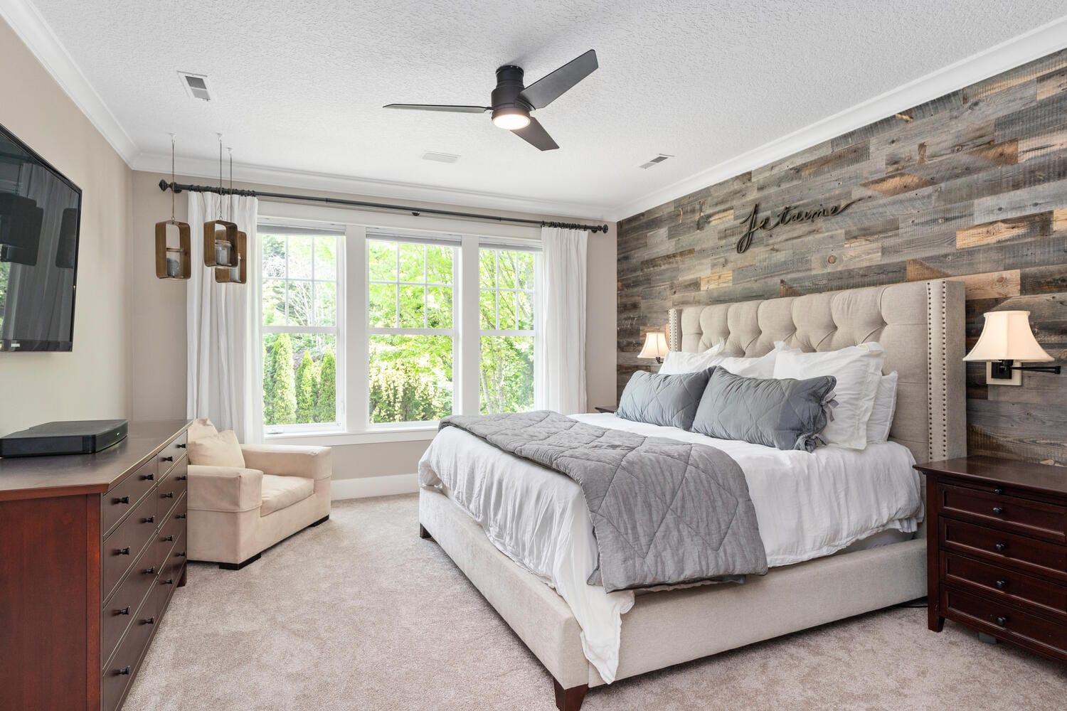 Black and white drawing of a two-story house with a front porch, multiple windows, and a two-car garage. The house features a gabled roof and landscaped front yard.