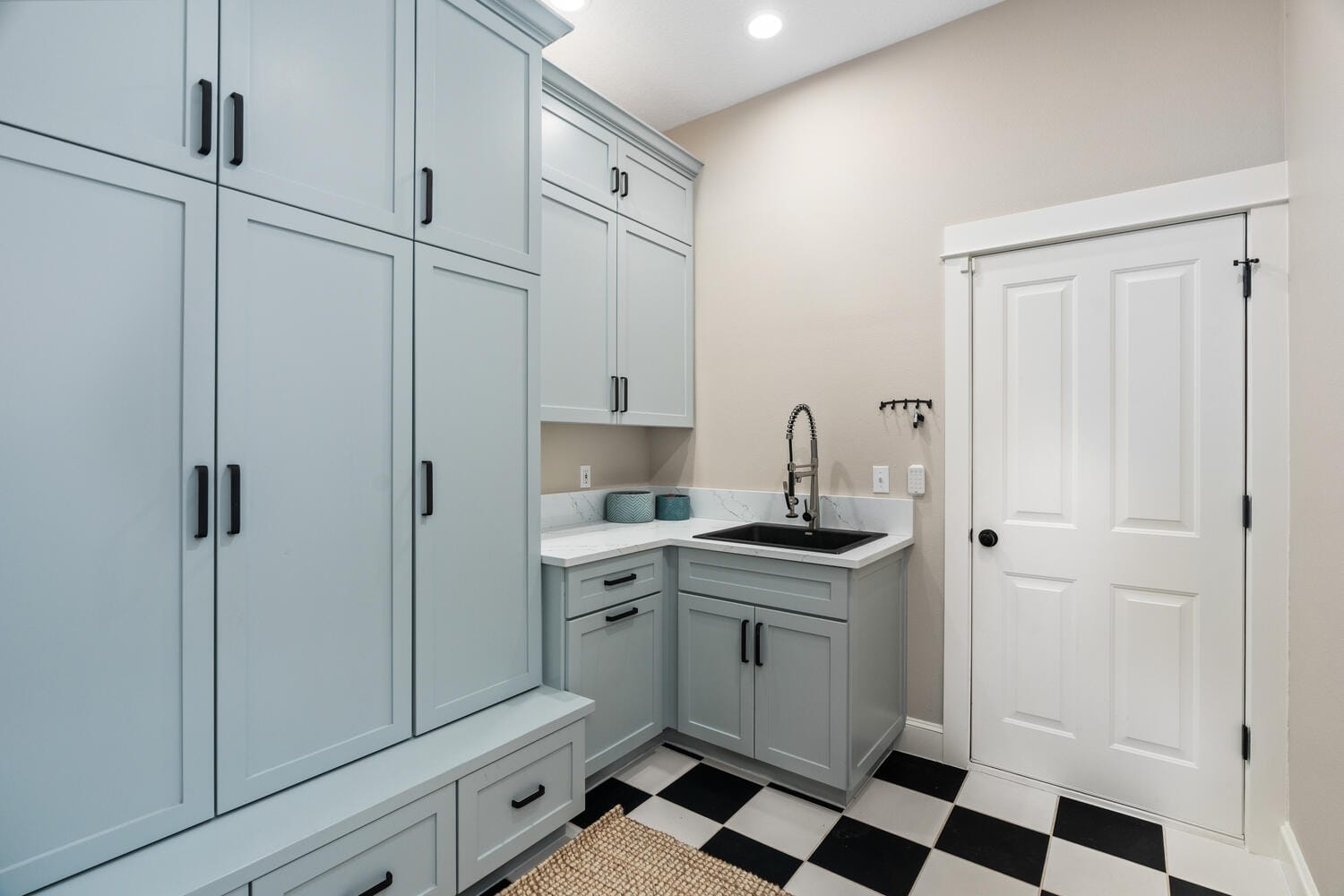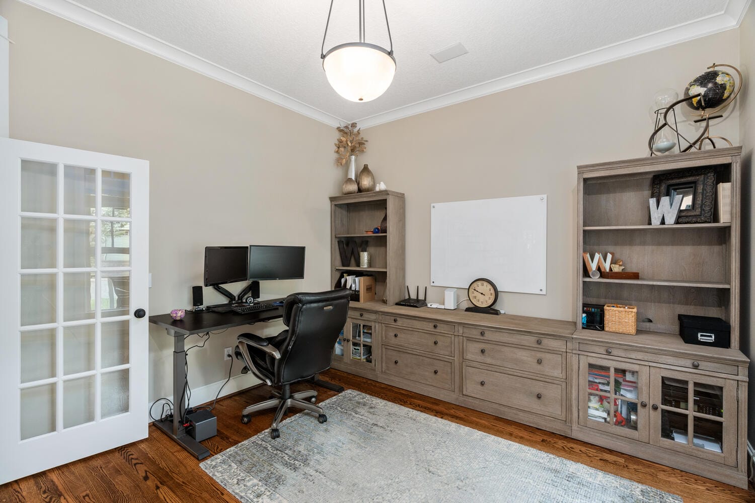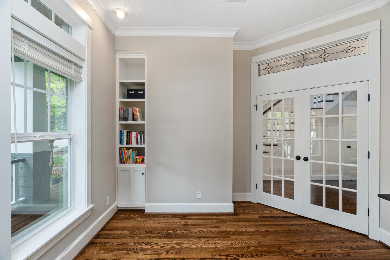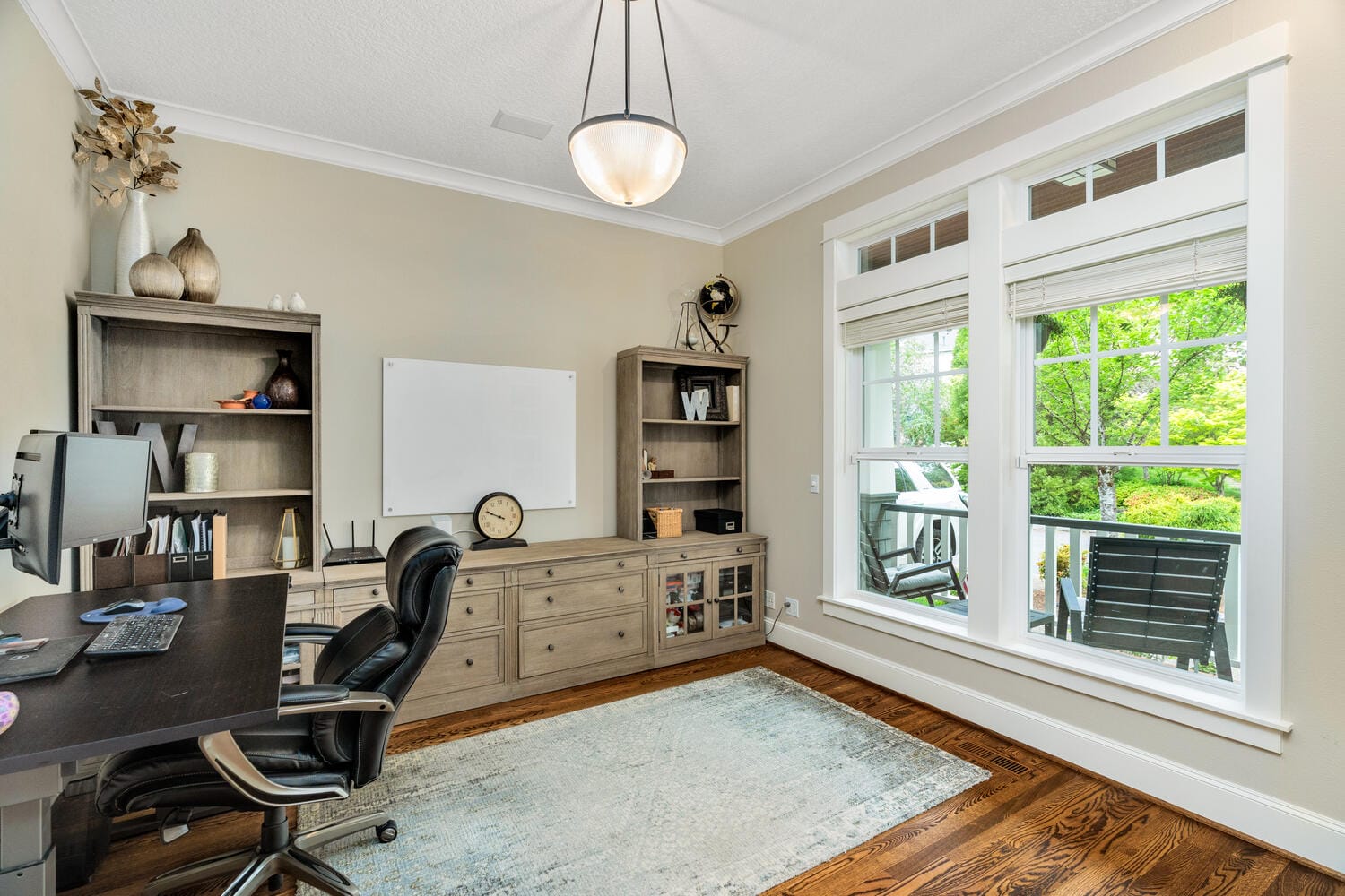 Black and white drawing of a two-story house with a front porch, multiple windows, and a two-car garage. The house features a gabled roof and landscaped front yard.