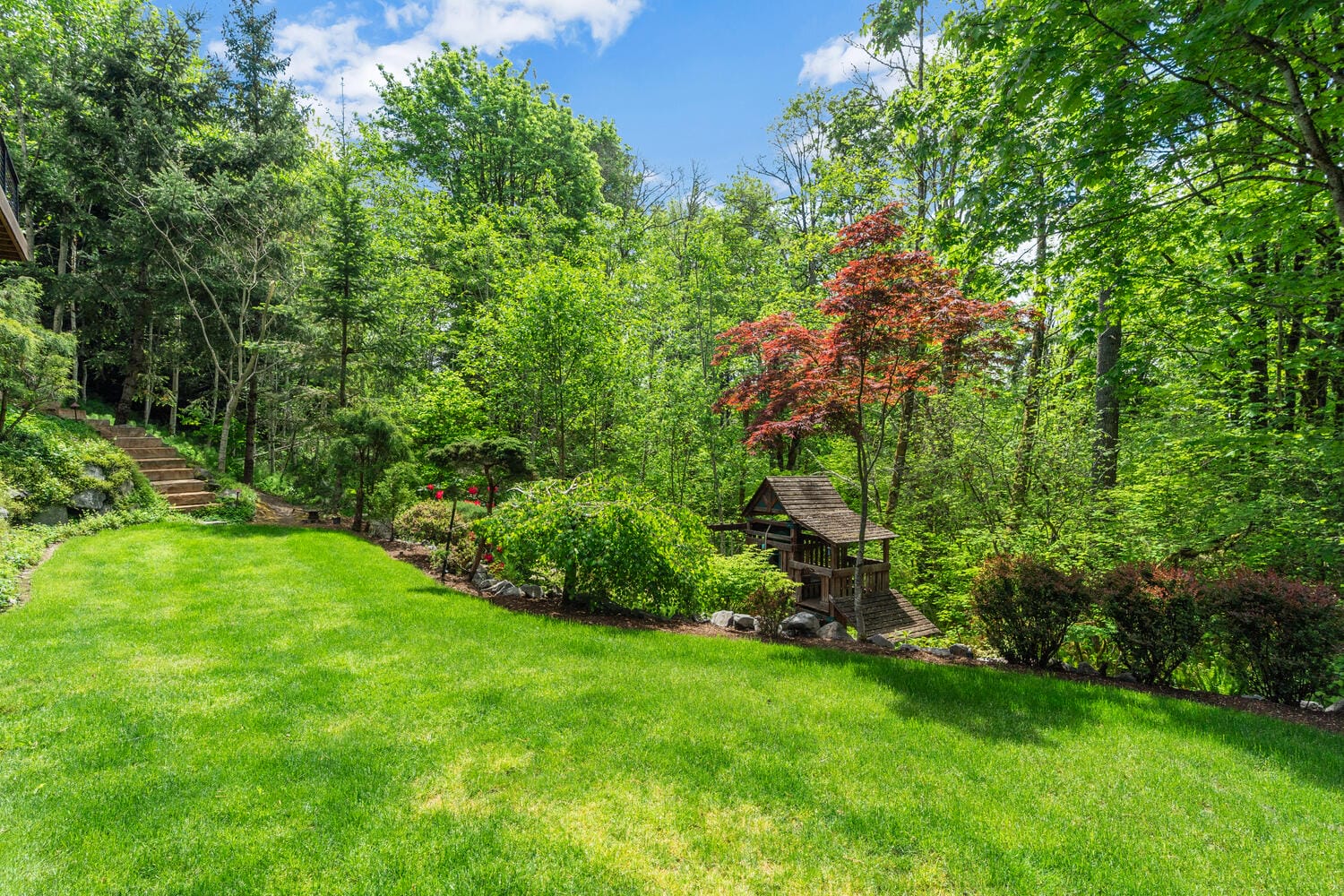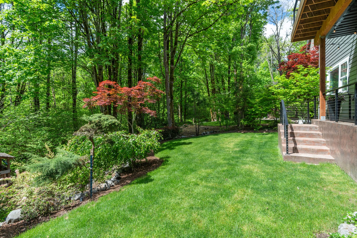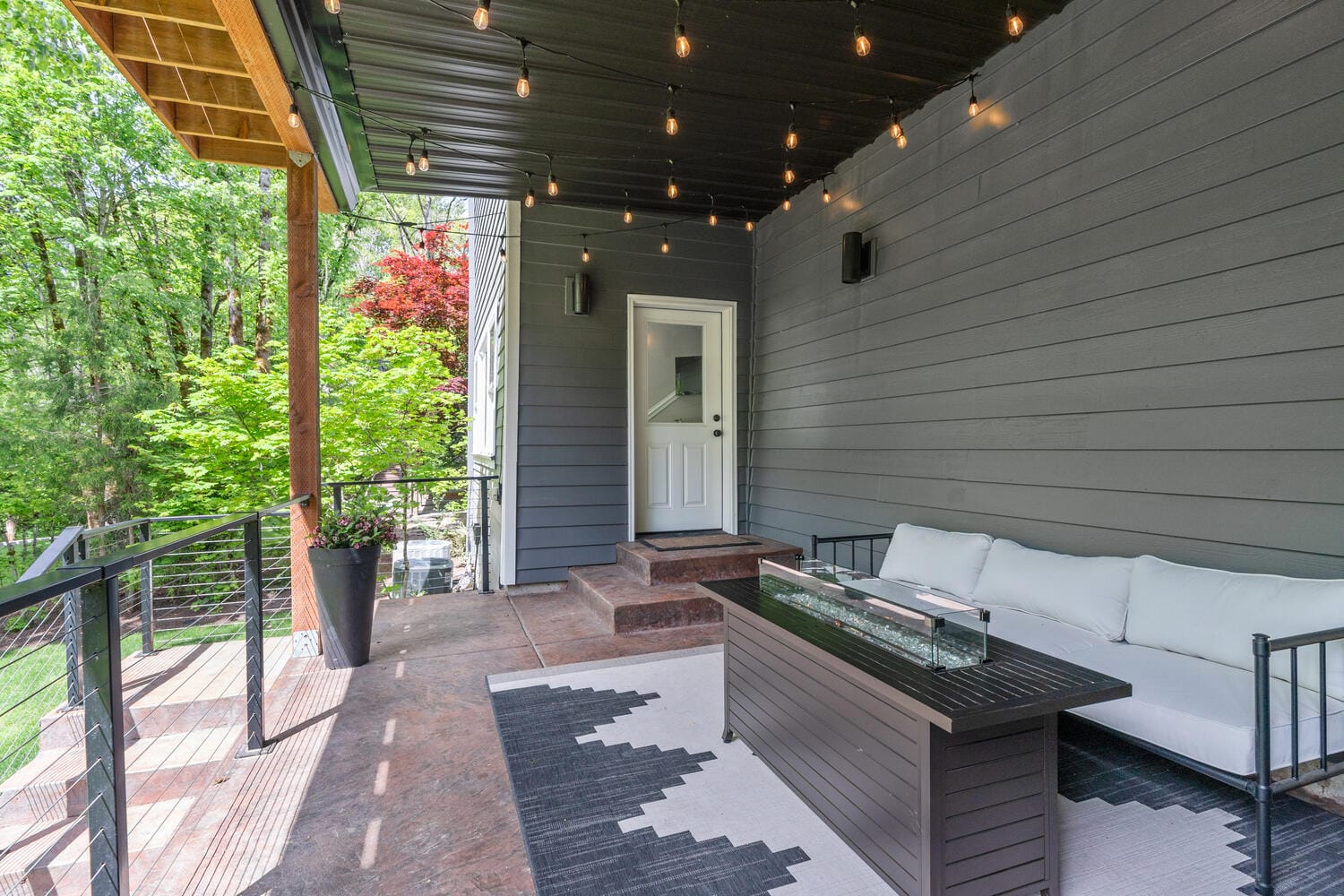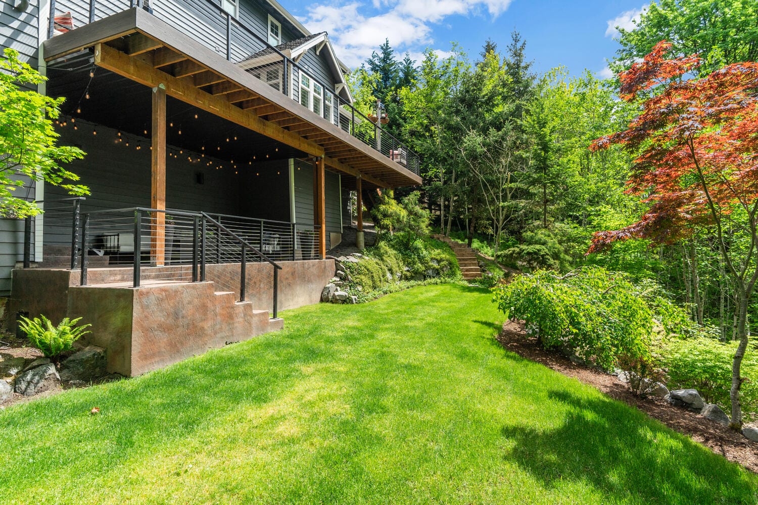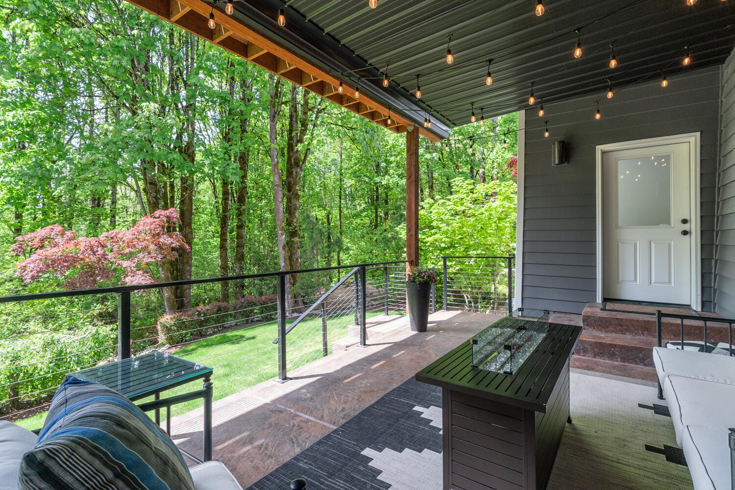 Black and white drawing of a two-story house with a front porch, multiple windows, and a two-car garage. The house features a gabled roof and landscaped front yard.