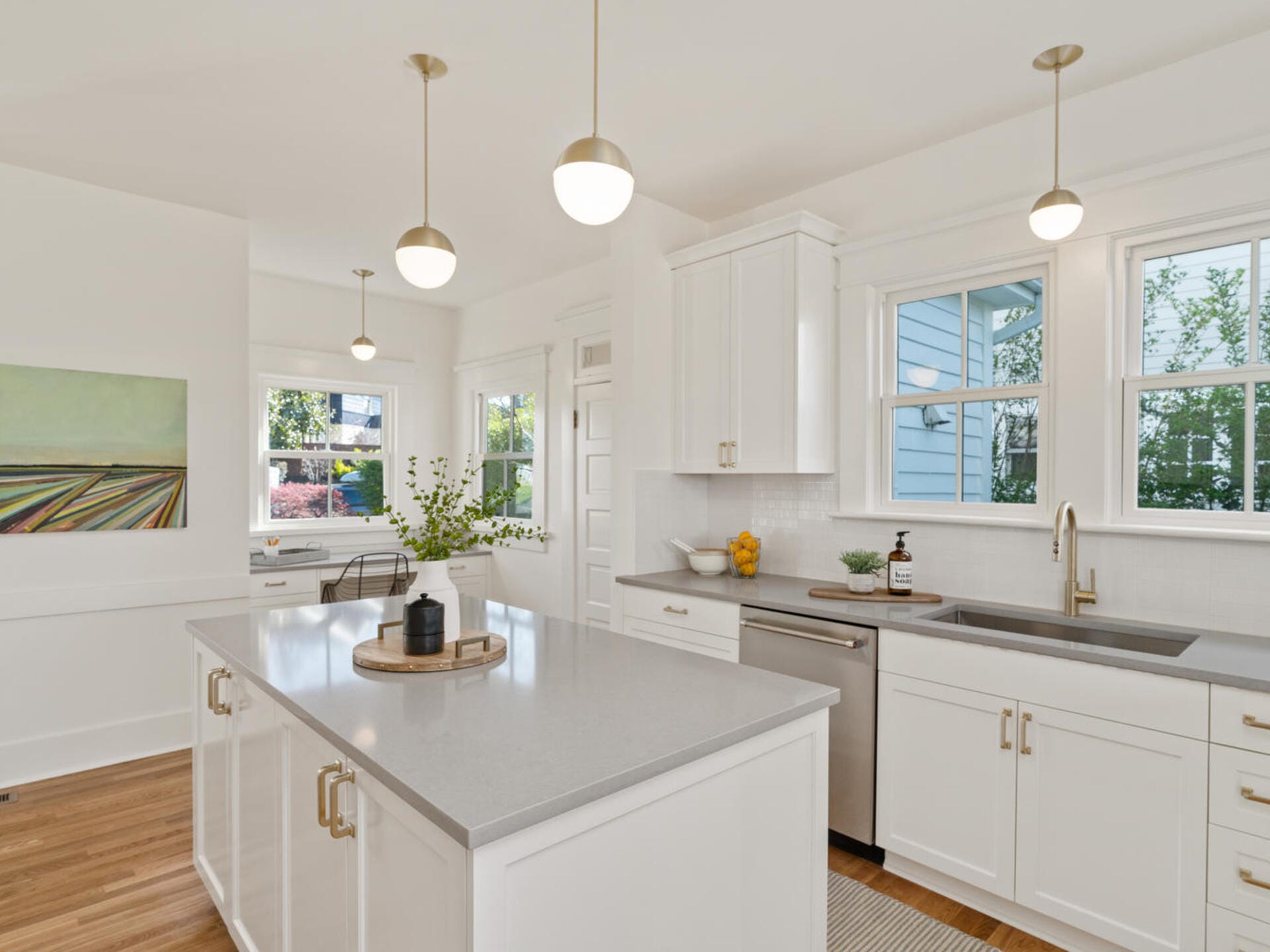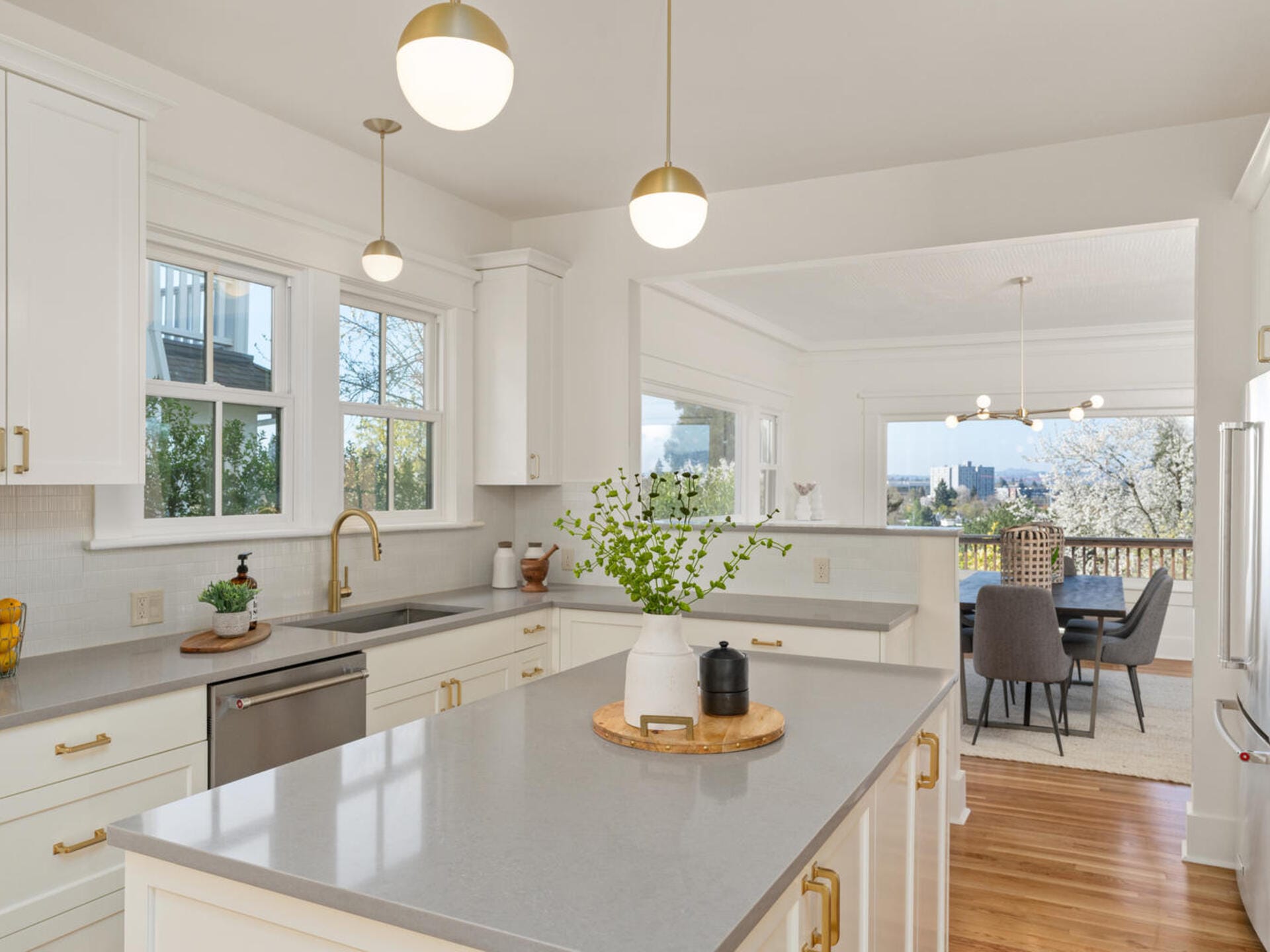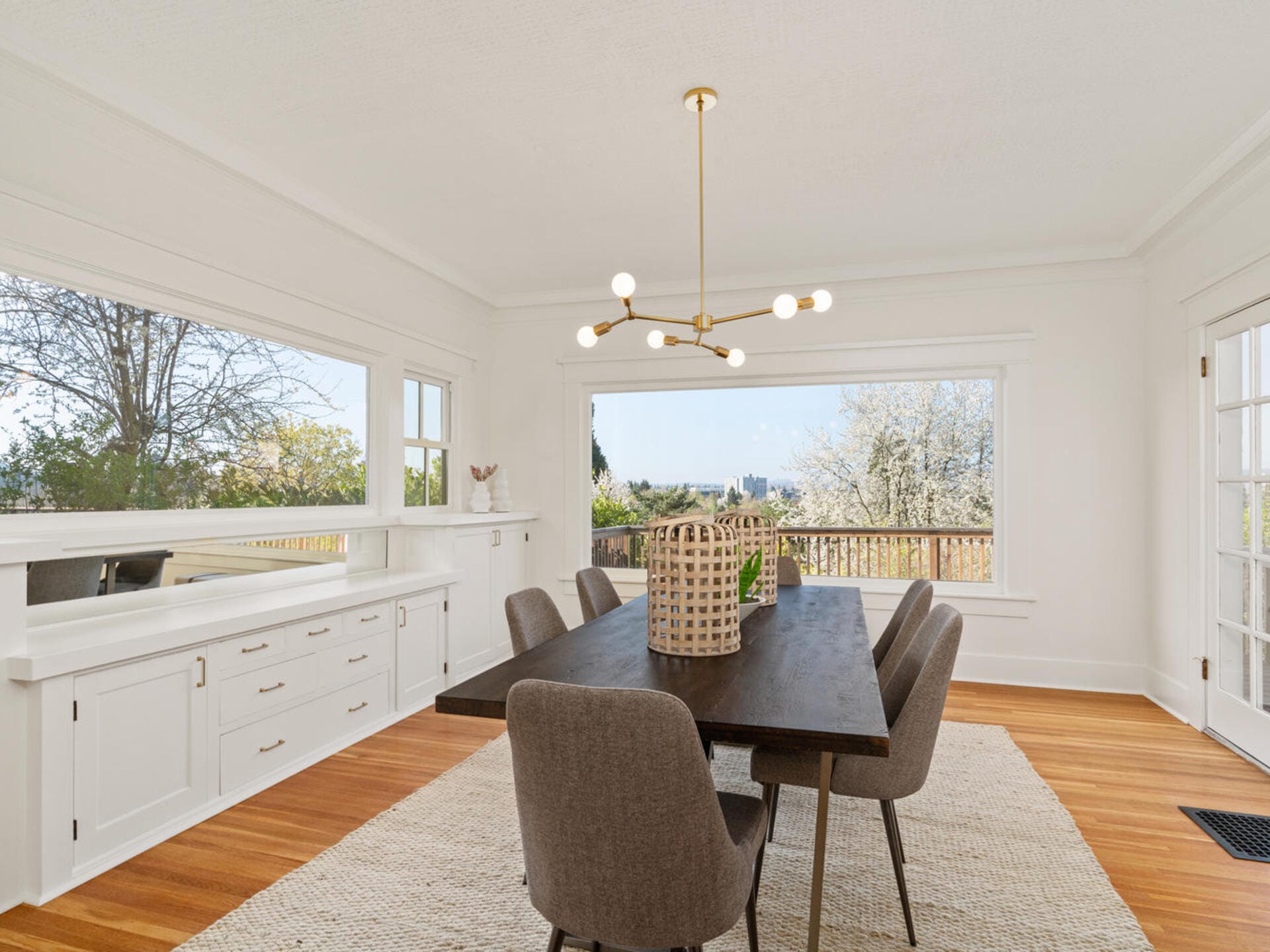 Originally built in 1917, 5114 NE Wisteria stands proudly on one of Northeast Portland's most premier lots, anchoring one of the community's most cherished cross streets. Perched on the Alameda Ridge, this stately colonial home has been renovated from top to bottom by Butler Redevelopment. With over 4500 square feet, each floor of this home boasts stunning new finishes, coupled with strong design elements from it's past. As you enter through the fluted columns of the front porch into the home, you find yourself greeted by a stunning foyer whose backdrop is a territorial view of Northeast Portland and downtown. A circular floor plan allows you to enter the main floor office, pass under the gorgeous stairwell to the kitchen or enter into the grand living room. With an abundance of natural light, the living room features tall ceilings, refinished hardwoods and an Ann Sacks tiled fireplace. The formal dining room is among the biggest you will see and features its own captivating views, direct access to a main level deck, Rejuvenation lighting and a broad shouldered built-in hutch. Butler has opened up the wall between the dining room and the kitchen to allow the kitchen its own views, increased natural light and an elegant visual flow. With a 36" Wolf range, quartz counters, new custom cabinetry, Cedar and Moss lighting, Ann Sacks tile, a walk in pantry and adjacent powder room this kitchen is among the most noteworthy in the neighborhood. Rounding out the main floor is a rare main floor master suite with an expansive walk-in closet and stunning en suite bathroom which has been remodeled with Ann Sacks tile, new fixtures and a custom vanity.