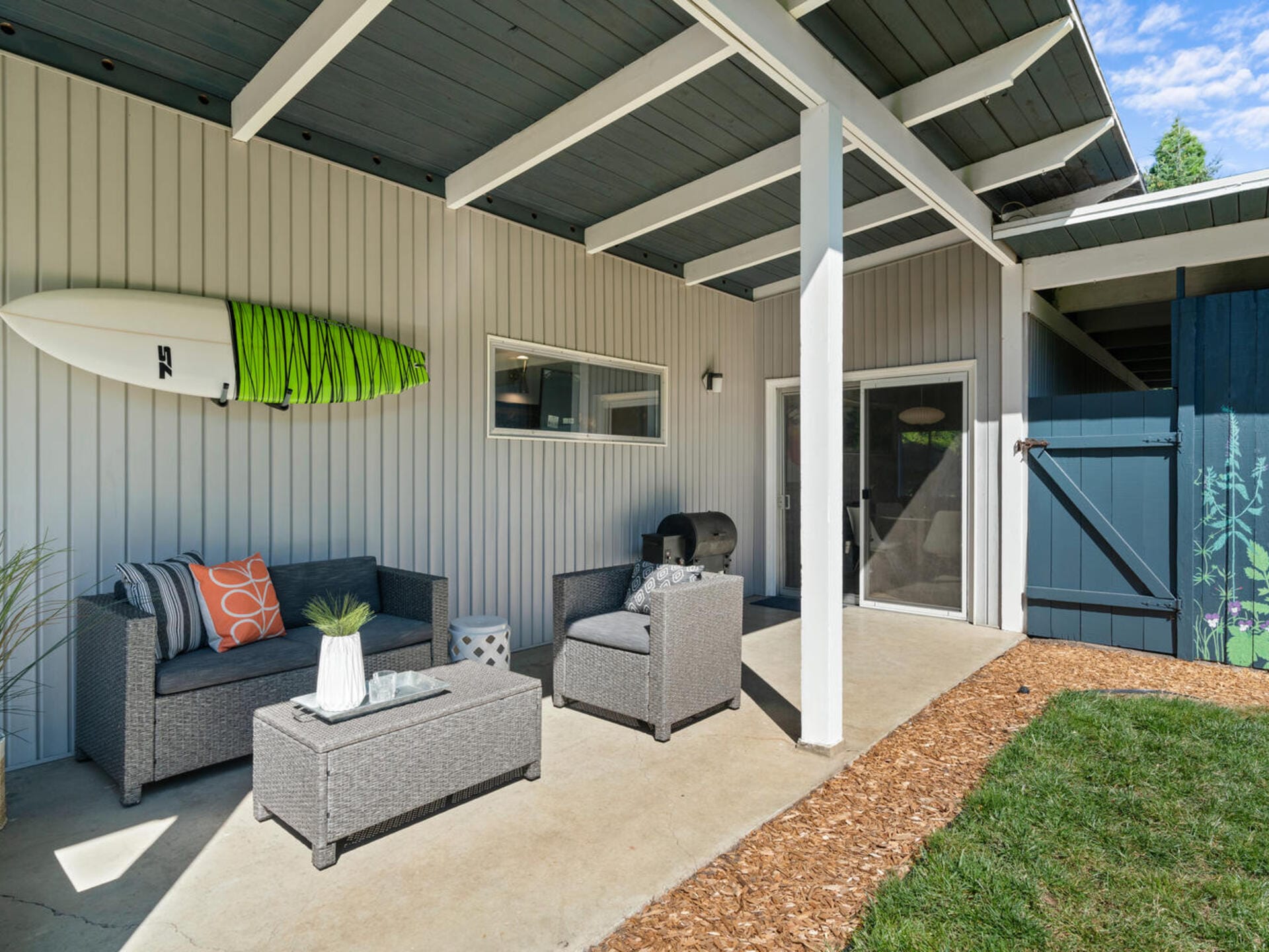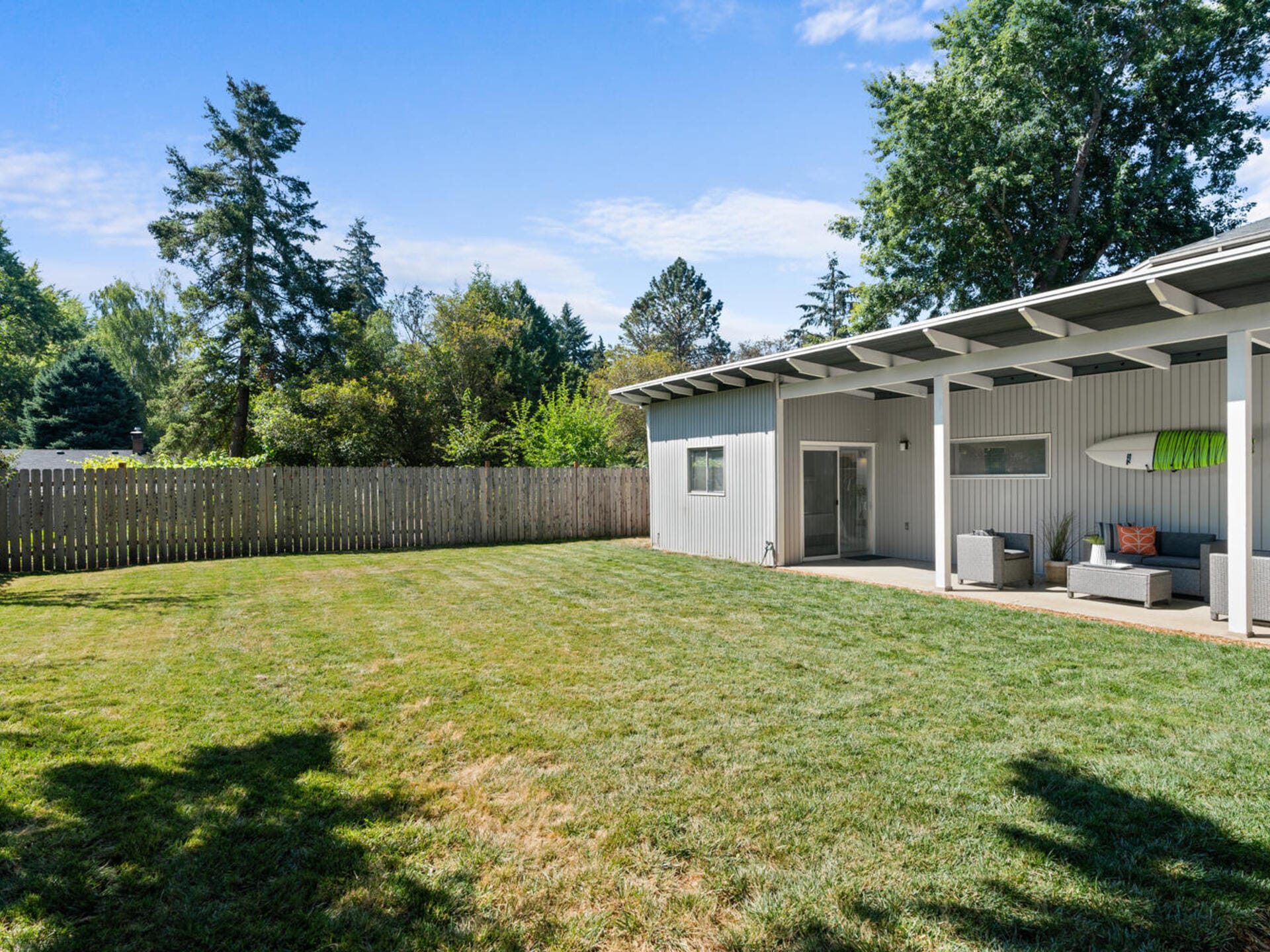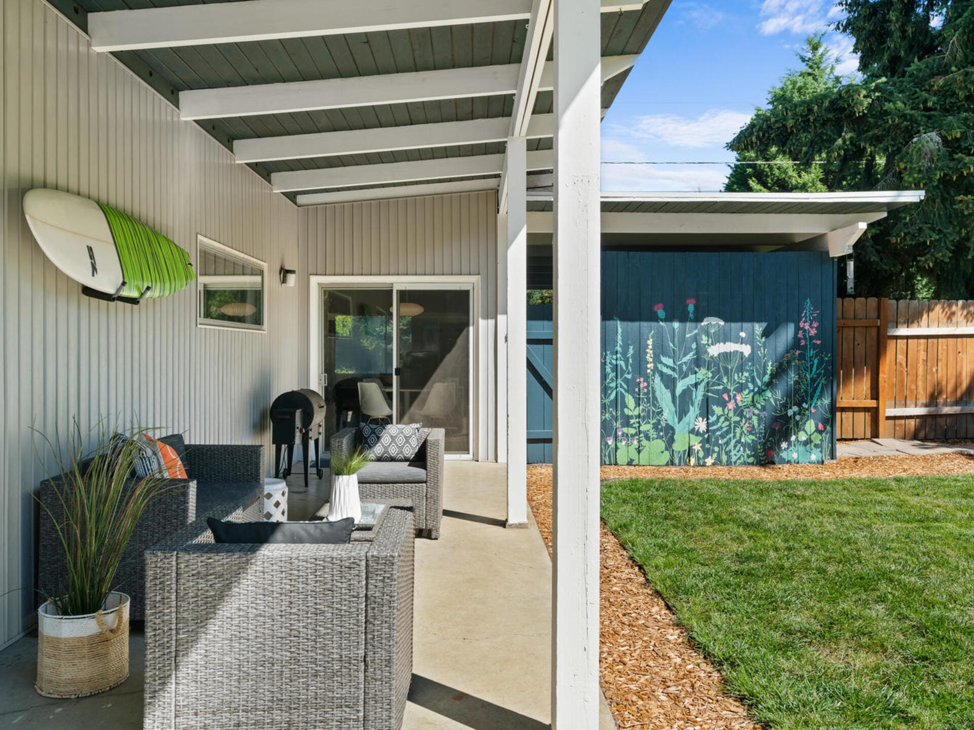 Built in 1959, this amazing southwest mid-century highlights the beauty of post and beam architecture coupled with a local designer's finishing touches. As you approach this home you are greeted by a classic open beam carport that draws you into the entry and expansive living room. With an absolutely stunning floor plan spanning over 1500 square feet across one level, the layout seamlessly ties the open formal spaces at the north end of the home with the bedrooms at the south end. This dynamic is created through an open kitchen that serves as an axis point to both ends of the home in addition to the incredible outdoor patio which ties both together on the exterior. The master suite and dining room bookend the patio which visually connects these spaces through expansive sliding doors at each end, while sheltering you under an incredible post and beam shed roof. The expansive ceilings are reflective of the massive roof line which creates a captivating sense of volume in the living room, dining room and master bedroom whose ceilings soar eastward. Complimenting the ceiling design is a stout brick wall with a wood burning fireplace that is a dramatic backdrop to the living room and kitchen. The kitchen itself features updated slab cabinetry, quartz countertops, stainless appliances and an adjacent laundry room with direct access to the west side of the property. The bathrooms have both been updated with custom tile, designer colors, gorgeous fixtures and cabinet hardware, while the bedrooms feature new carpet and beautiful two tier color patterns. Beyond the 3 bedrooms and 2 bathrooms is an expansive backyard with perfect southern exposure and a sense of privacy created by an amazing custom mural, cedar fencing and the iconic west elevation which highlights the scale of the adjacent patio and cascading mid-century beams that make this home so special. With a sought after southwest location close to Garden Home shops, grocery, the recreation center and Old Market Pub and Brewery this home is a noteworthy address that you won't want to miss.