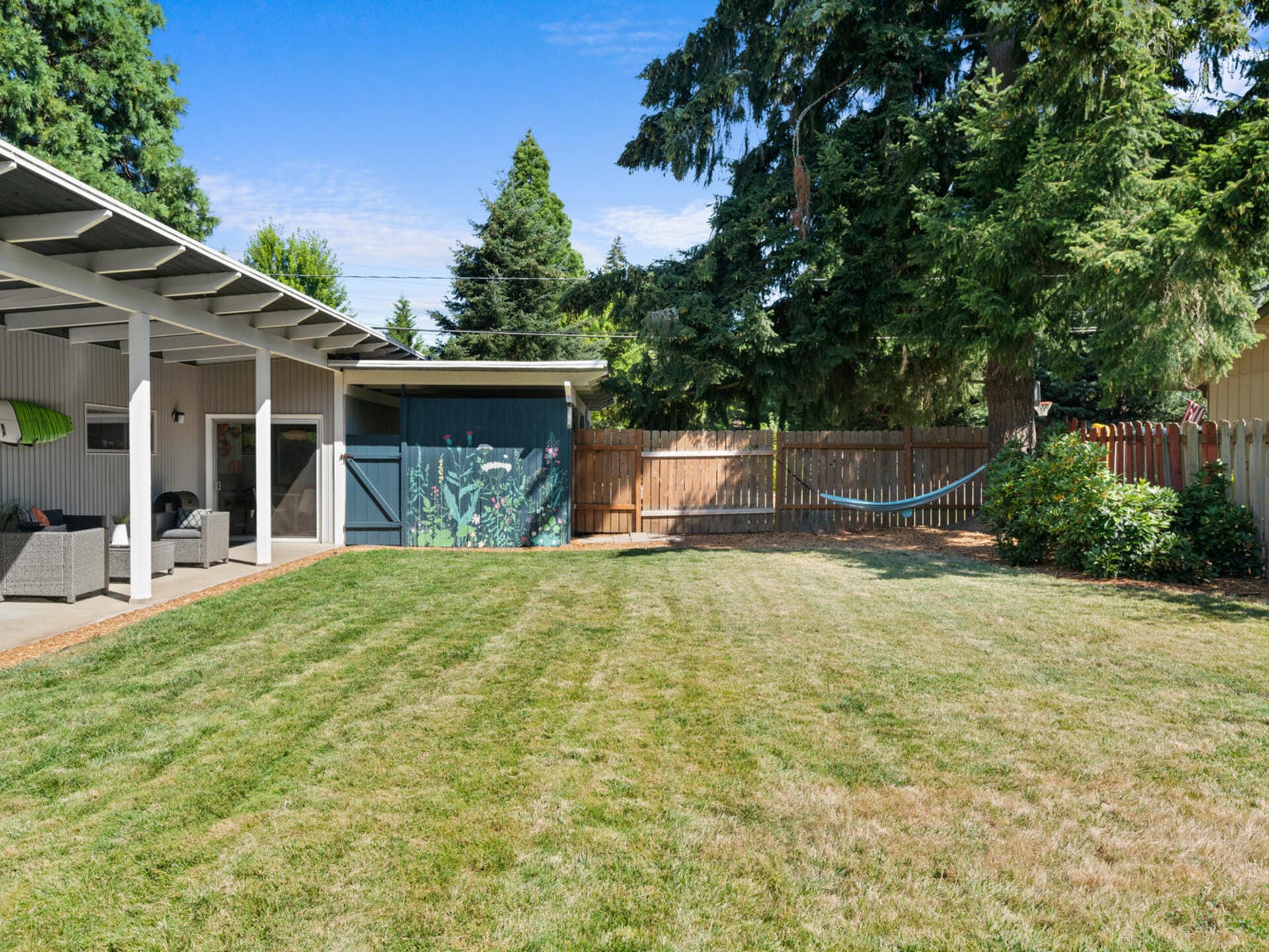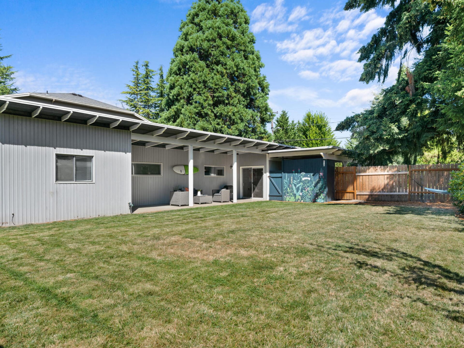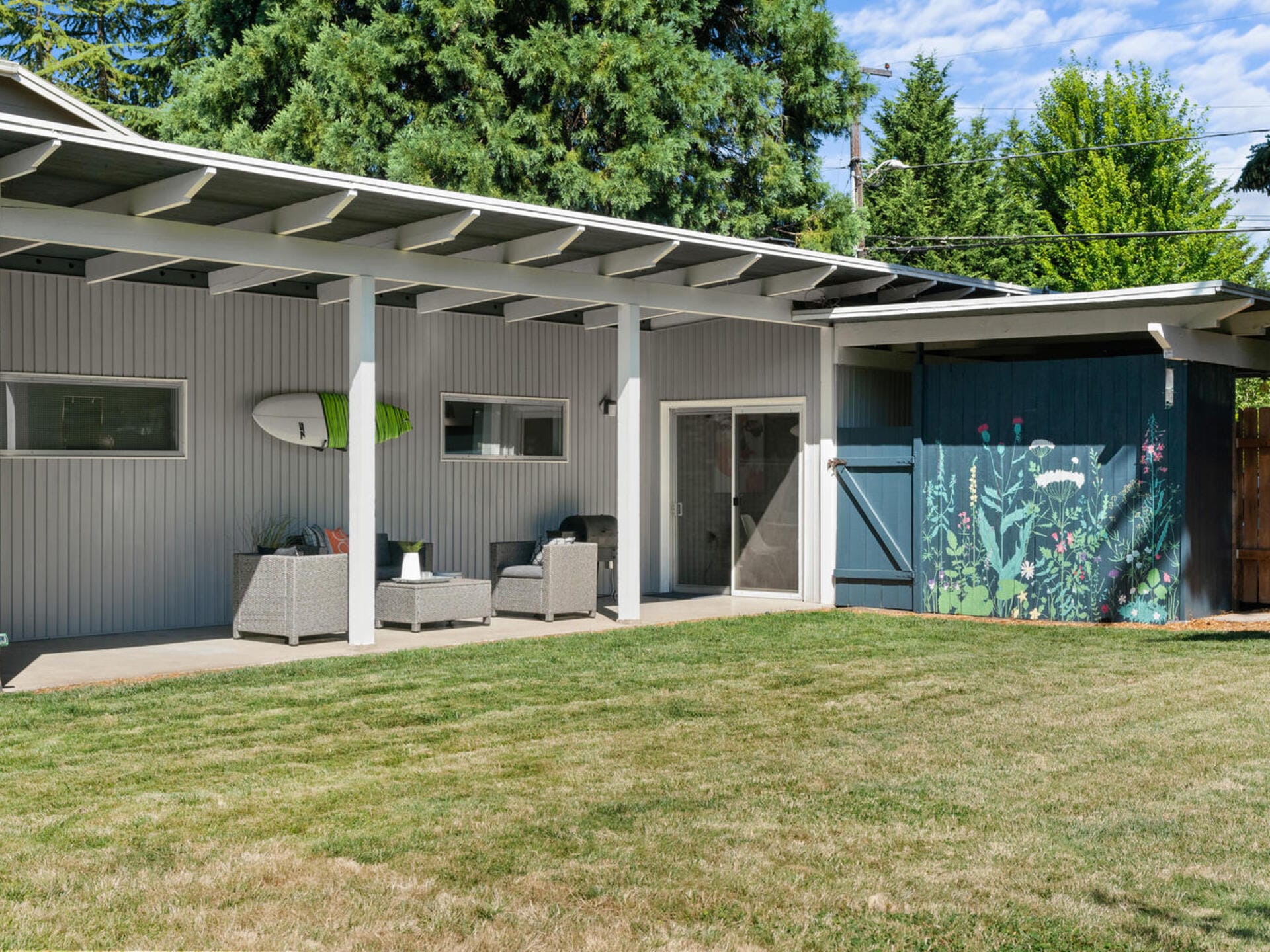 Built in 1959, this amazing southwest mid-century highlights the beauty of post and beam architecture coupled with a local designer's finishing touches. As you approach this home you are greeted by a classic open beam carport that draws you into the entry and expansive living room. With an absolutely stunning floor plan spanning over 1500 square feet across one level, the layout seamlessly ties the open formal spaces at the north end of the home with the bedrooms at the south end. This dynamic is created through an open kitchen that serves as an axis point to both ends of the home in addition to the incredible outdoor patio which ties both together on the exterior. The master suite and dining room bookend the patio which visually connects these spaces through expansive sliding doors at each end, while sheltering you under an incredible post and beam shed roof. The expansive ceilings are reflective of the massive roof line which creates a captivating sense of volume in the living room, dining room and master bedroom whose ceilings soar eastward. Complimenting the ceiling design is a stout brick wall with a wood burning fireplace that is a dramatic backdrop to the living room and kitchen. The kitchen itself features updated slab cabinetry, quartz countertops, stainless appliances and an adjacent laundry room with direct access to the west side of the property. The bathrooms have both been updated with custom tile, designer colors, gorgeous fixtures and cabinet hardware, while the bedrooms feature new carpet and beautiful two tier color patterns. Beyond the 3 bedrooms and 2 bathrooms is an expansive backyard with perfect southern exposure and a sense of privacy created by an amazing custom mural, cedar fencing and the iconic west elevation which highlights the scale of the adjacent patio and cascading mid-century beams that make this home so special. With a sought after southwest location close to Garden Home shops, grocery, the recreation center and Old Market Pub and Brewery this home is a noteworthy address that you won't want to miss.