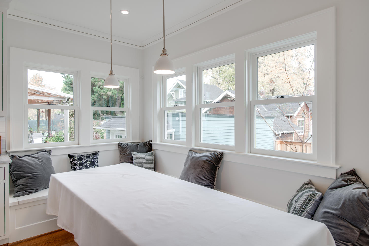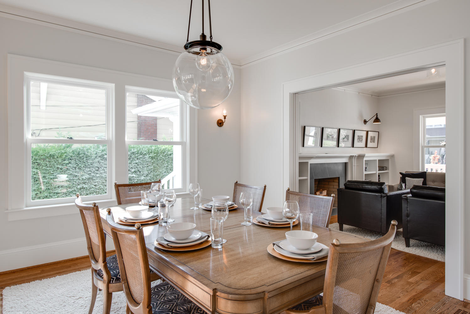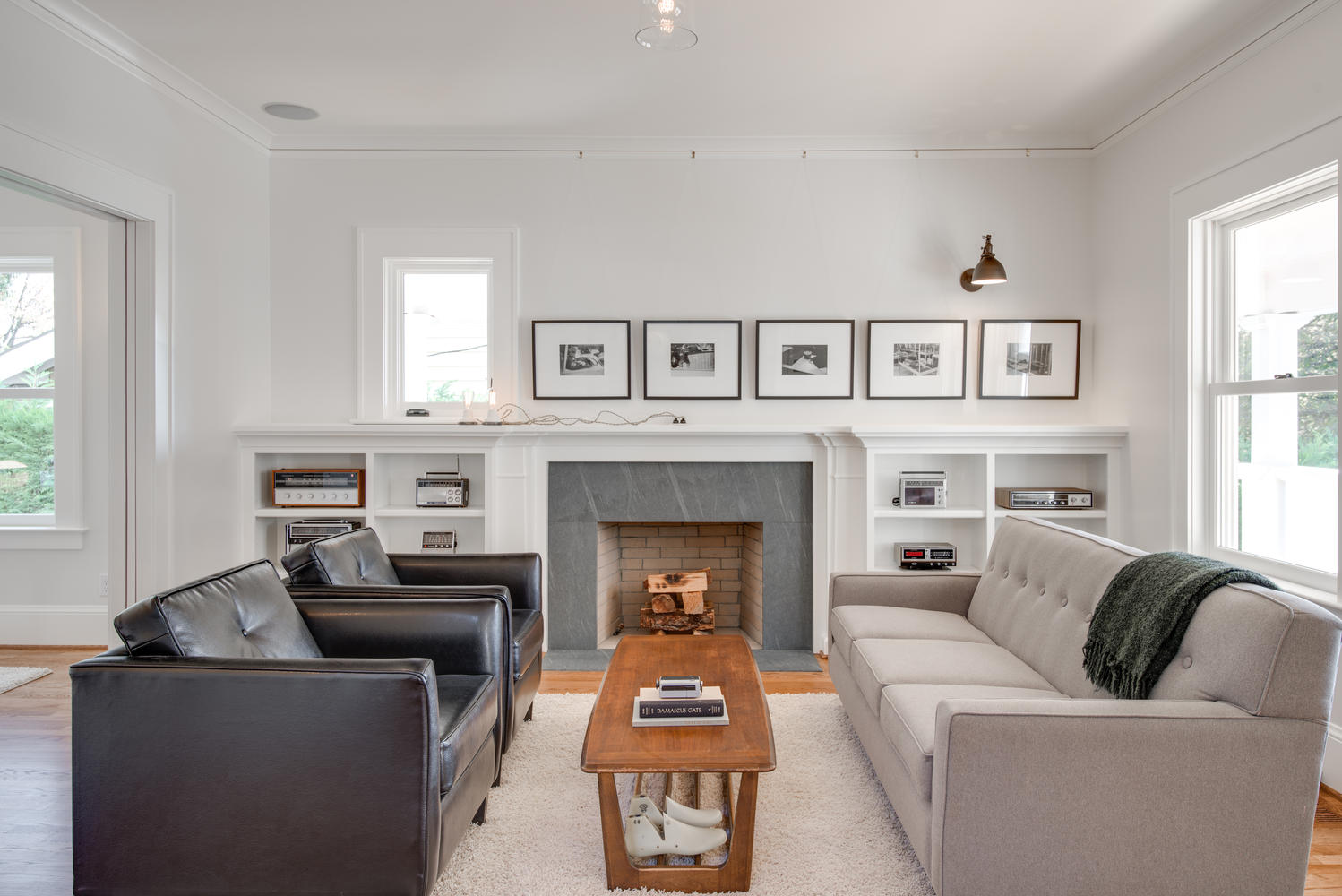 A detailed illustration of a two-story house in Portland, Oregon, showcases a covered porch, chimney, and front steps. The house features multiple windows on each level, surrounded by shrubs and bushes. The drawing is rendered in black and white.