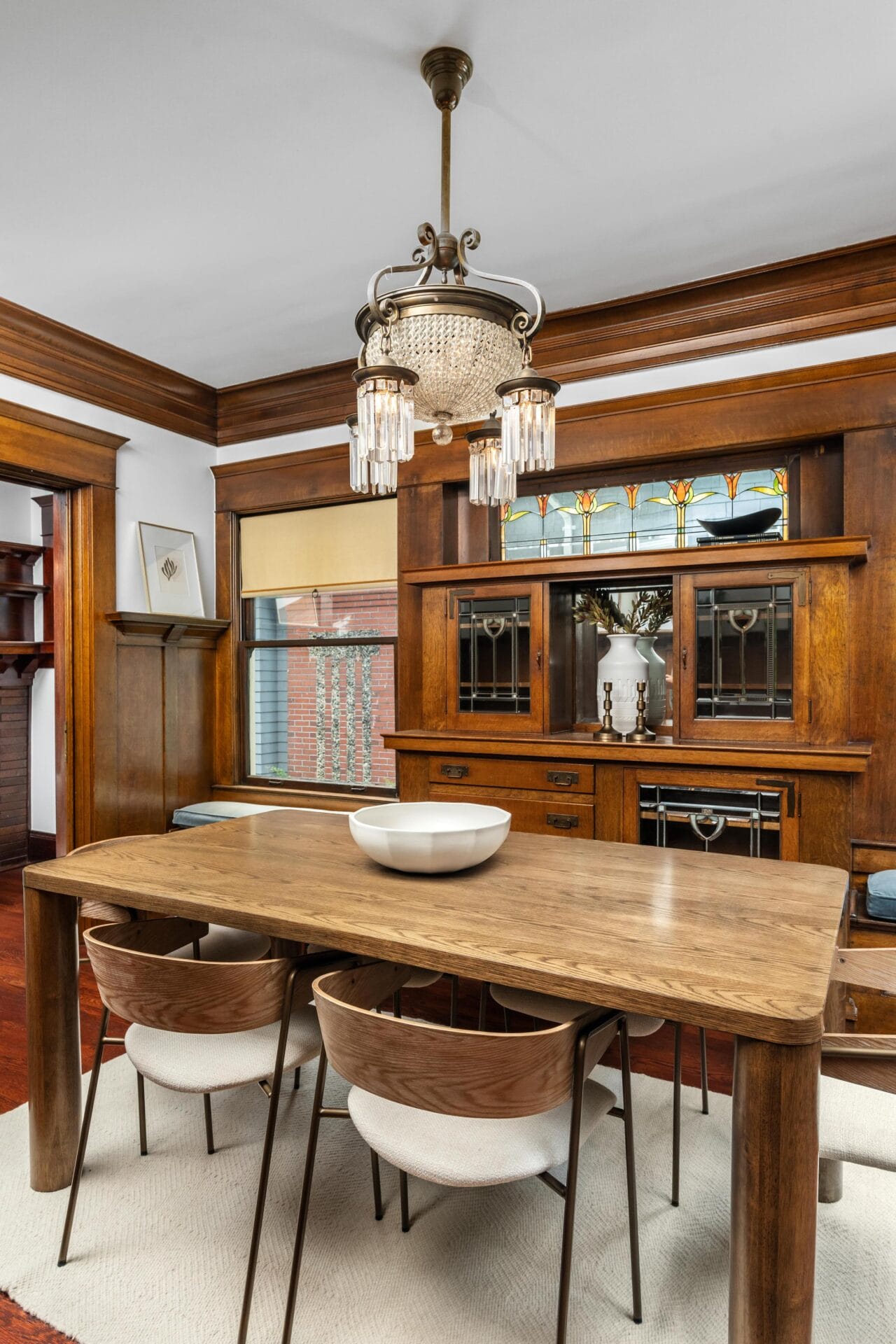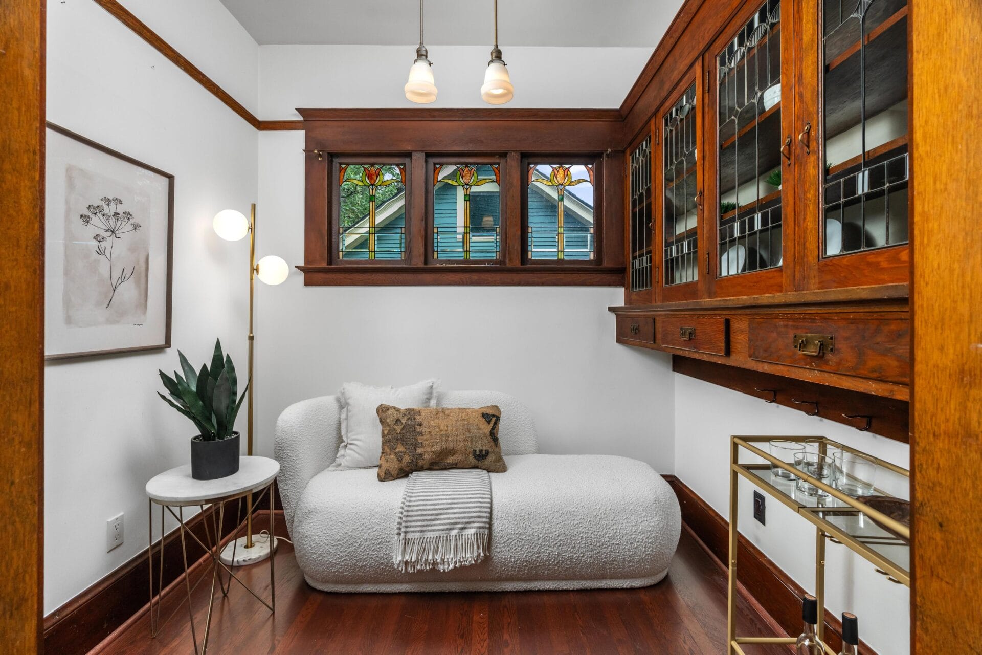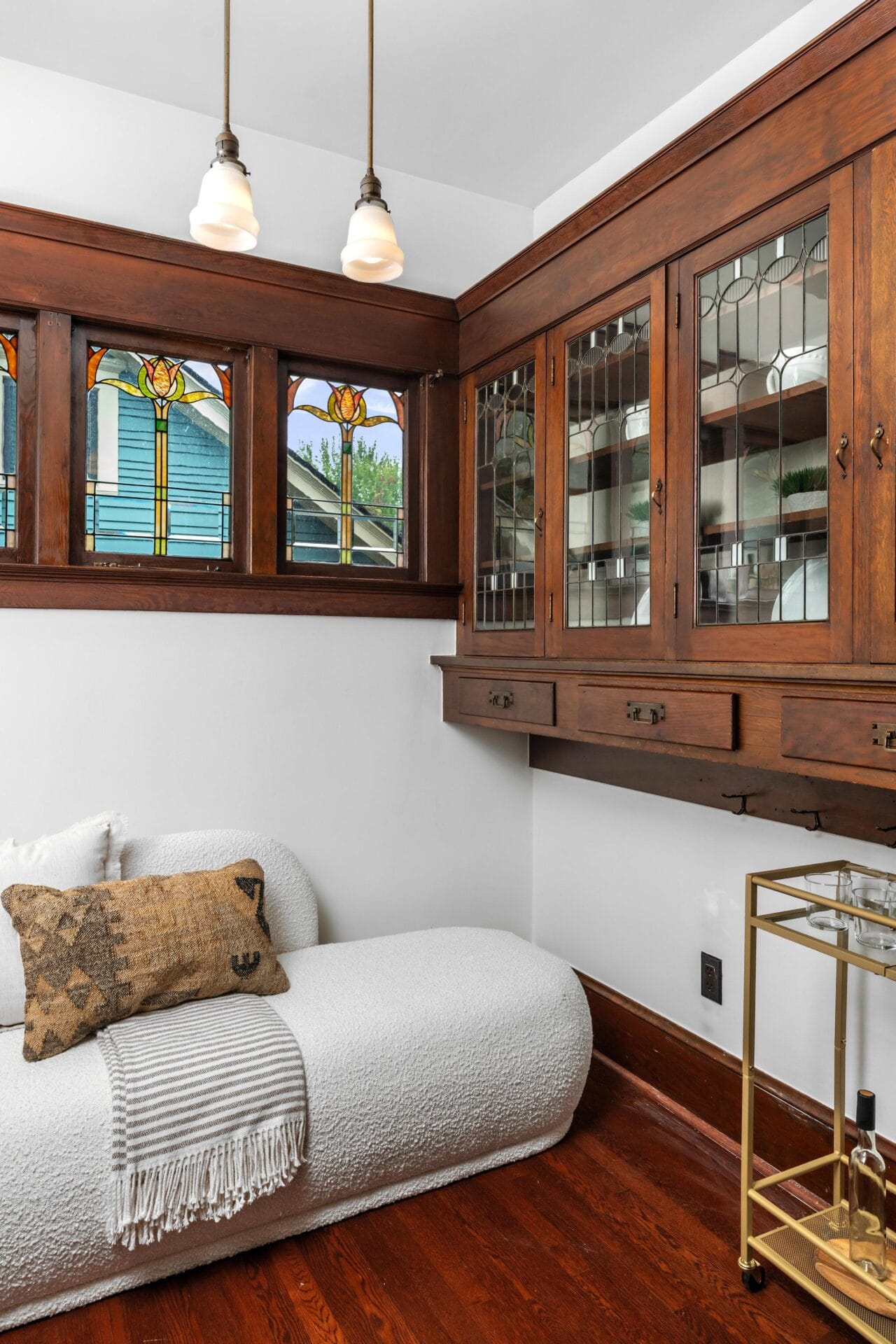 Stepping up to the front porch and through the main door you will immediately witness the same level of detail executed on the exterior on the interior. Incredible custom millwork surrounds the living room where a three tiered fireplace mantle, multi-layered crown moulding and an intricate stairwell showcase the incredible detail that went into this home over 100 years ago. Gorgeous oak hardwoods run underfoot while custom stained glass windows highlight almost every wall and run into the dining room where a custom hutch, dual window seats and stunning wainscoting highlight the space. Just off the dining room is a picture perfect office, sitting room or piano room with its own elevated china cabinet and custom window treatments. Anchoring the north end of the main floor is the perfect powder room and a remodeled eat-in kitchen with classic shaker cabinetry, a Viking range, gorgeous field tile and Schoolhouse lighting. Moving upstairs you will find three bedrooms and a stunning remodeled full bathroom complete with a claw foot tub, tile set shower and period details at every turn. The bedrooms each feature stain grade wood flooring, five panel doors, period lighting and noteworthy wood windows with gorgeous divided light patterns.