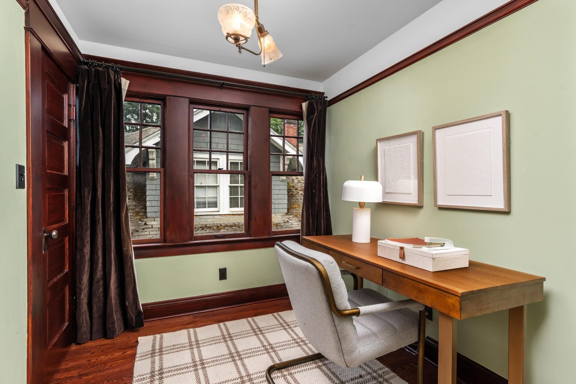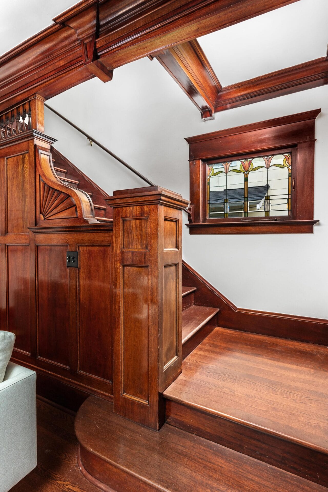 Stepping up to the front porch and through the main door you will immediately witness the same level of detail executed on the exterior on the interior. Incredible custom millwork surrounds the living room where a three tiered fireplace mantle, multi-layered crown moulding and an intricate stairwell showcase the incredible detail that went into this home over 100 years ago. Gorgeous oak hardwoods run underfoot while custom stained glass windows highlight almost every wall and run into the dining room where a custom hutch, dual window seats and stunning wainscoting highlight the space. Just off the dining room is a picture perfect office, sitting room or piano room with its own elevated china cabinet and custom window treatments. Anchoring the north end of the main floor is the perfect powder room and a remodeled eat-in kitchen with classic shaker cabinetry, a Viking range, gorgeous field tile and Schoolhouse lighting. Moving upstairs you will find three bedrooms and a stunning remodeled full bathroom complete with a claw foot tub, tile set shower and period details at every turn. The bedrooms each feature stain grade wood flooring, five panel doors, period lighting and noteworthy wood windows with gorgeous divided light patterns.