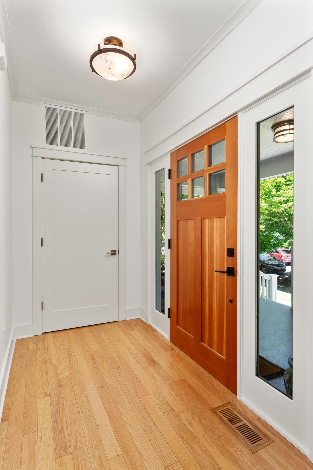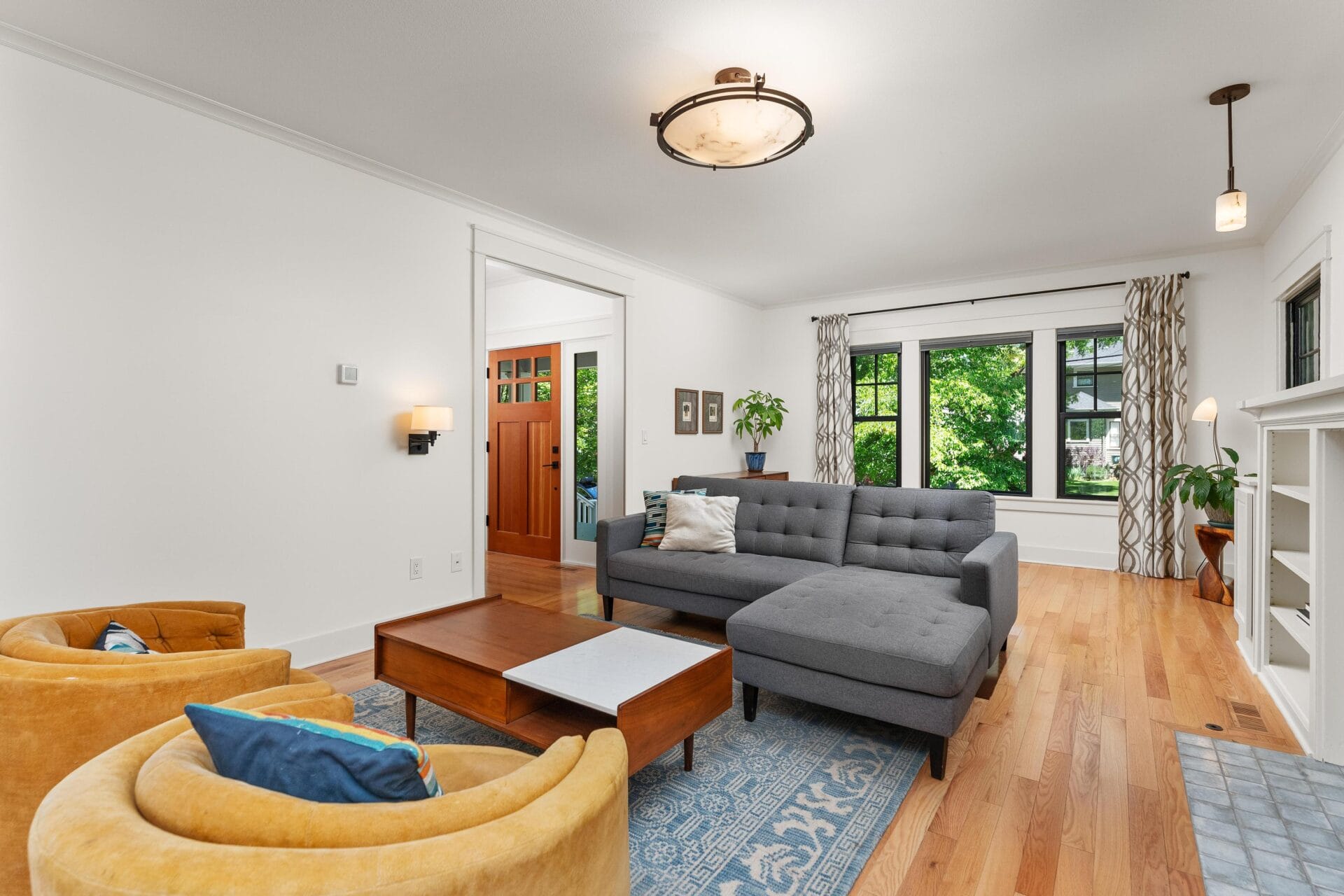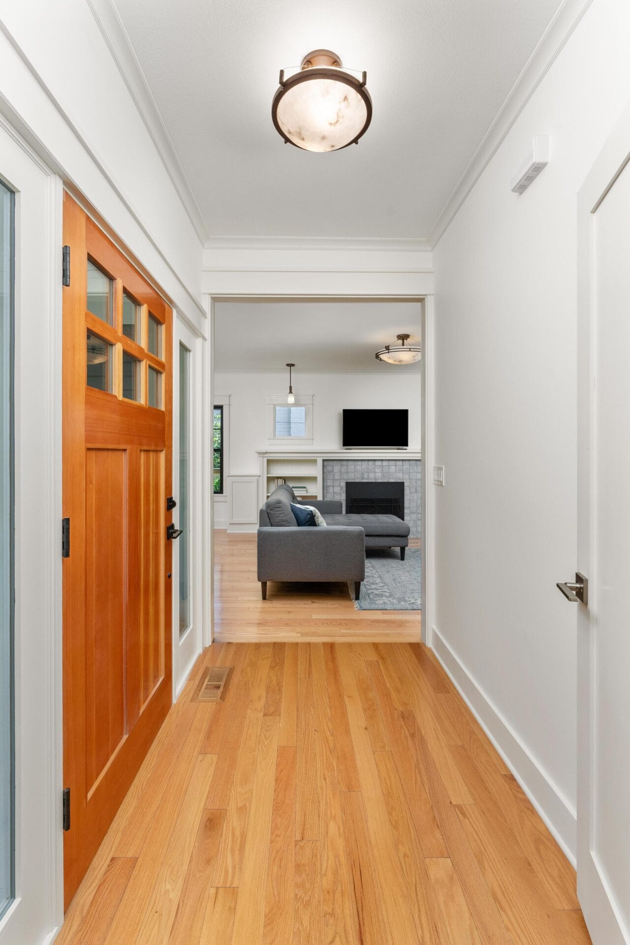 Originally built in 1912, this textbook Craftsman home has been taken down to the studs and extensively renovated both inside and out. As you approach the home you will notice its sweeping main gable, highlighted by a classic, deep eave supported by a series of stout knee braces. The textbook porch is clad in tongue and groove top decking as well as classic v-groove soffitting which reflect the care that has been taken to both preserve and renovate the home in keeping with its heritage. As you enter the front door you find yourself in a foyer that introduces you to the home's formal spaces. The living and dining room are highlighted by oak hardwood floors and built-in bookshelves that bookend the fireplace. Newer divided light wood windows surround the spaces along with large dual, full light french doors. The doors create an elegant flow from the interior to the exterior wrap around porch. While countless finish details have been applied to reflect the period in which this home was constructed, the renovation opened up the spaces from the kitchen to the living room to create one of the most sought after main level floor plans. With a seamless transition from the living to the dining room and dining room to the kitchen you immediately appreciate the scale and depth of the home. The completely remodeled kitchen anchors the southwest corner and features stunning solid surface counters, custom field tile, gourmet appliances and an elevated island that creates the perfect utility and visual balance across the space. A second set of double doors allow the most avid cook and entertainer to move easily from the expansive kitchen to the large back deck. Beyond the kitchen is a gracious bathroom and bedroom, designed with ADA related dimensions. The bedroom features hardwood floors, high ceilings and a large closet, while the main level bathroom is home to a curbless tile set shower, custom built-ins and a gorgeous vanity.