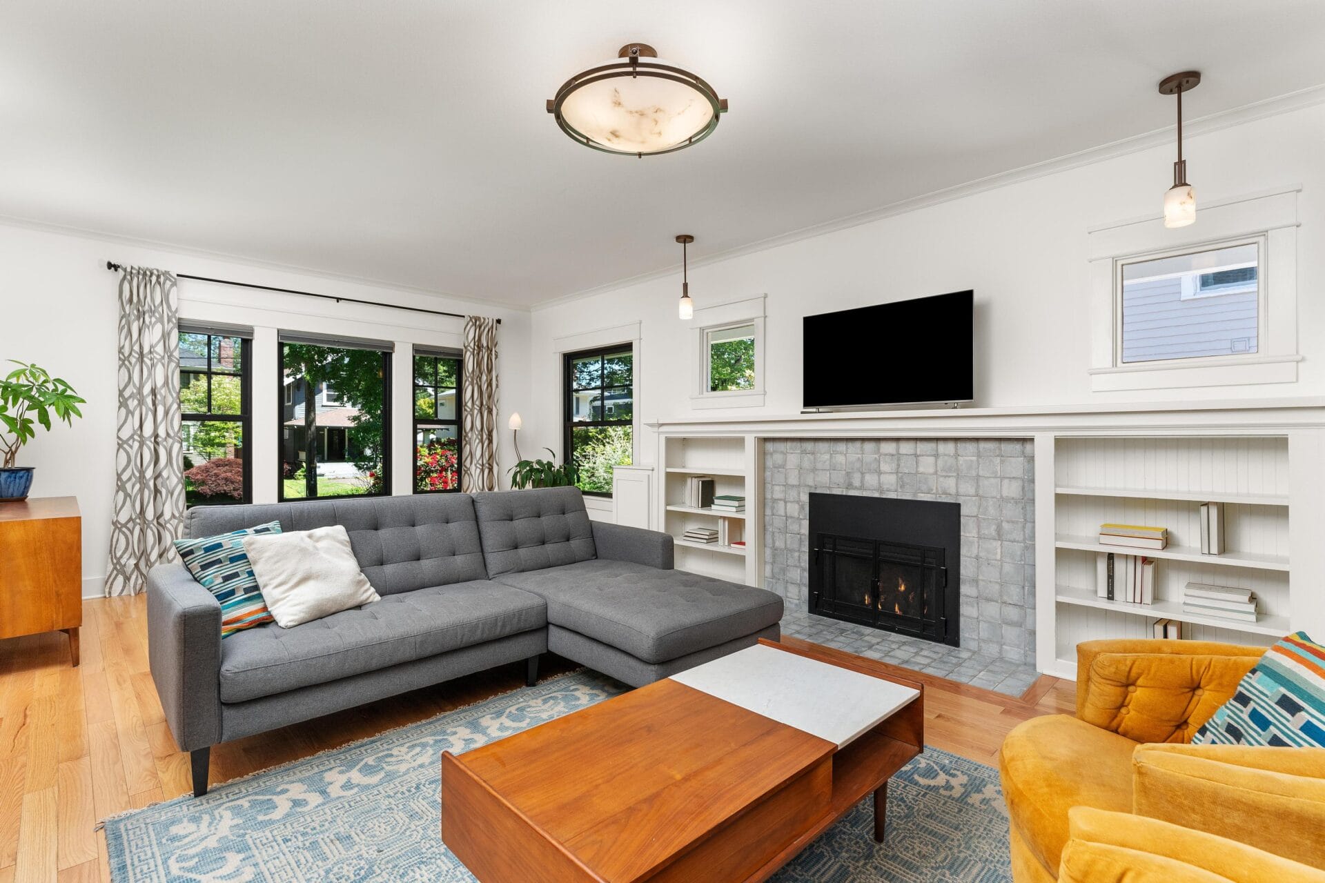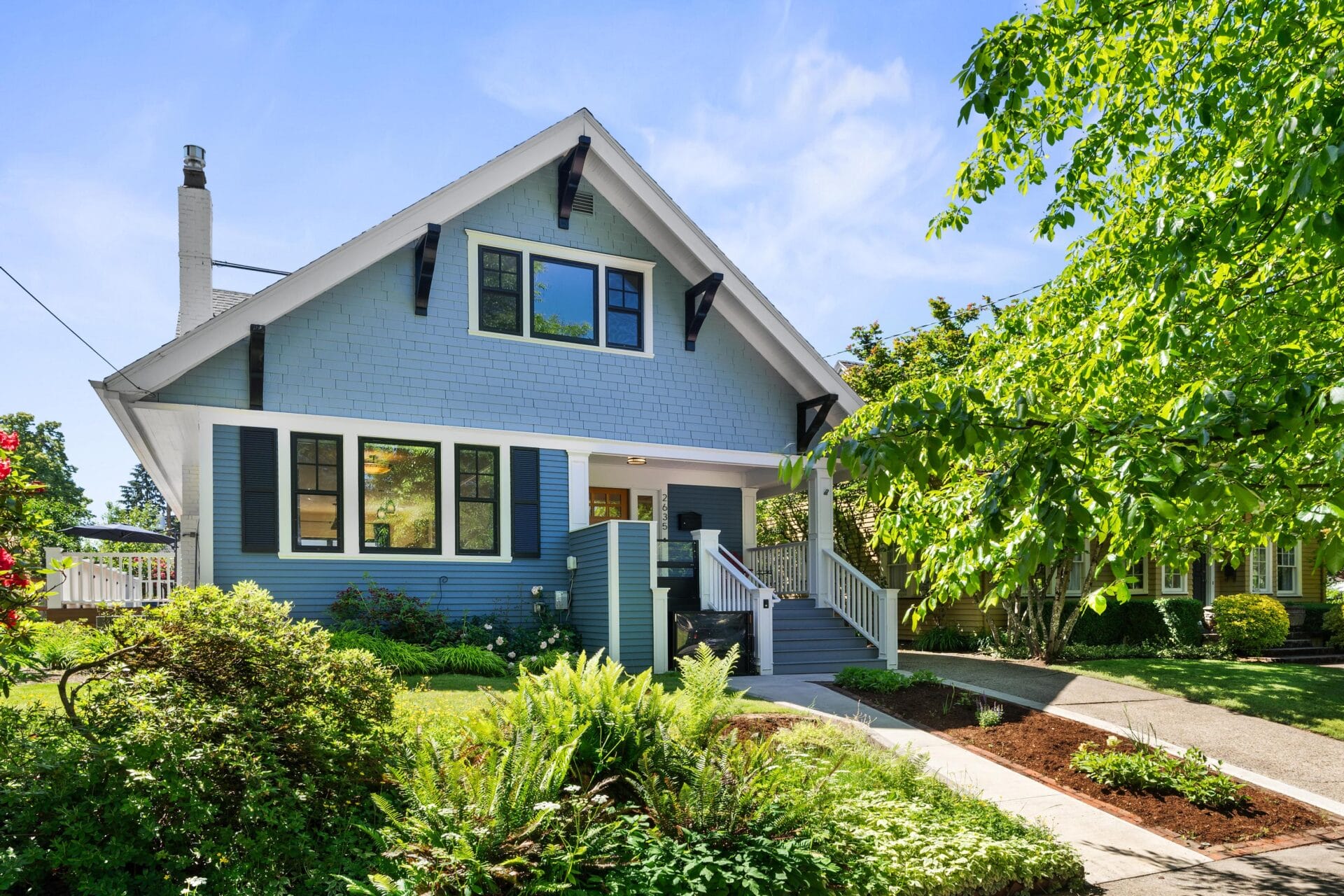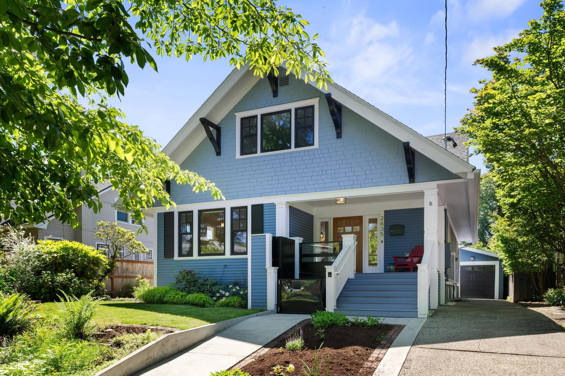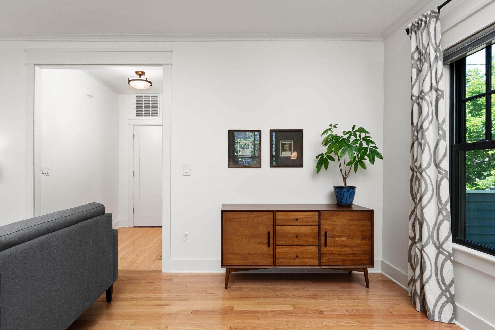 Originally built in 1912, this textbook Craftsman home has been taken down to the studs and extensively renovated both inside and out. As you approach the home you will notice its sweeping main gable, highlighted by a classic, deep eave supported by a series of stout knee braces. The textbook porch is clad in tongue and groove top decking as well as classic v-groove soffitting which reflect the care that has been taken to both preserve and renovate the home in keeping with its heritage. As you enter the front door you find yourself in a foyer that introduces you to the home's formal spaces. The living and dining room are highlighted by oak hardwood floors and built-in bookshelves that bookend the fireplace. Newer divided light wood windows surround the spaces along with large dual, full light french doors. The doors create an elegant flow from the interior to the exterior wrap around porch. While countless finish details have been applied to reflect the period in which this home was constructed, the renovation opened up the spaces from the kitchen to the living room to create one of the most sought after main level floor plans. With a seamless transition from the living to the dining room and dining room to the kitchen you immediately appreciate the scale and depth of the home. The completely remodeled kitchen anchors the southwest corner and features stunning solid surface counters, custom field tile, gourmet appliances and an elevated island that creates the perfect utility and visual balance across the space. A second set of double doors allow the most avid cook and entertainer to move easily from the expansive kitchen to the large back deck. Beyond the kitchen is a gracious bathroom and bedroom, designed with ADA related dimensions. The bedroom features hardwood floors, high ceilings and a large closet, while the main level bathroom is home to a curbless tile set shower, custom built-ins and a gorgeous vanity.