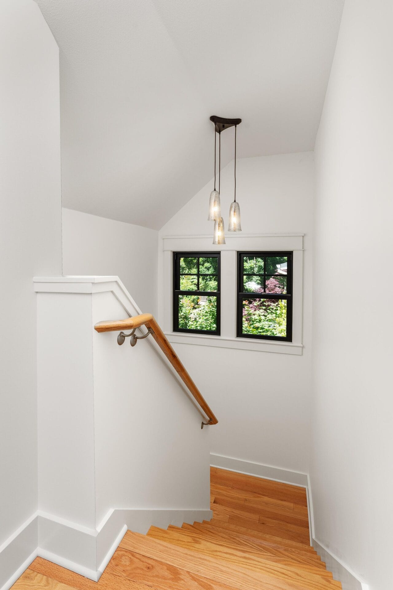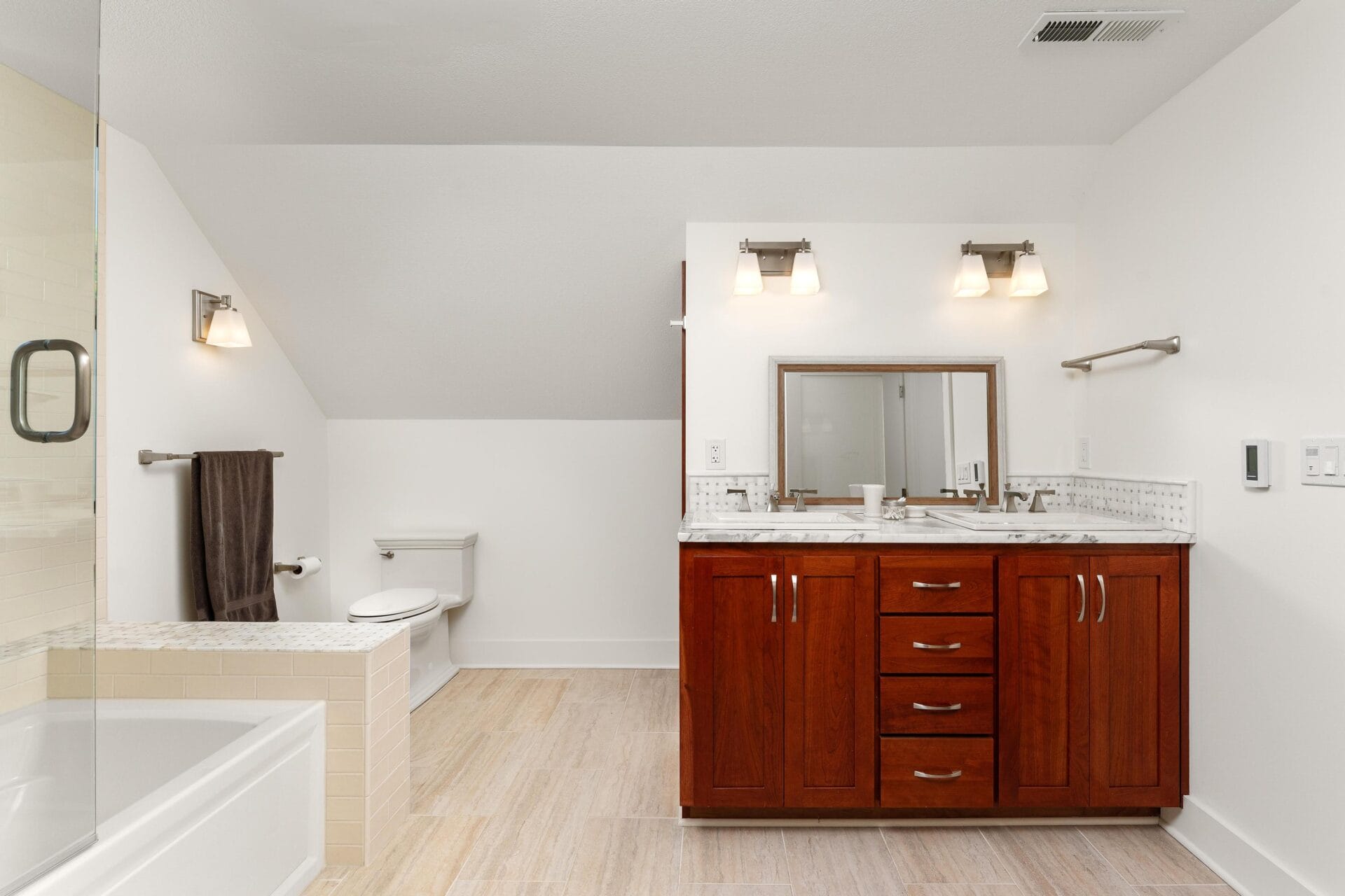 Moving upstairs beyond the 1100 plus square foot main level is almost 900 square feet of space that features three bedrooms and a second full bathroom. The bathroom boasts a soaking tub, double vanity and gorgeous surface treatments throughout. Like the main level, it has also been very thoughtfully planned out to include dual entrances from one of the adjacent bedrooms and the main hallway. Solid core doors, custom casing and oak hardwoods run throughout each room giving additional credit to the renovation. Clever details include multiple crawlspace access points which offer increased storage.