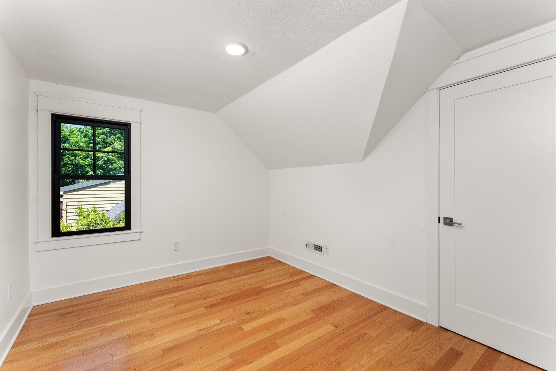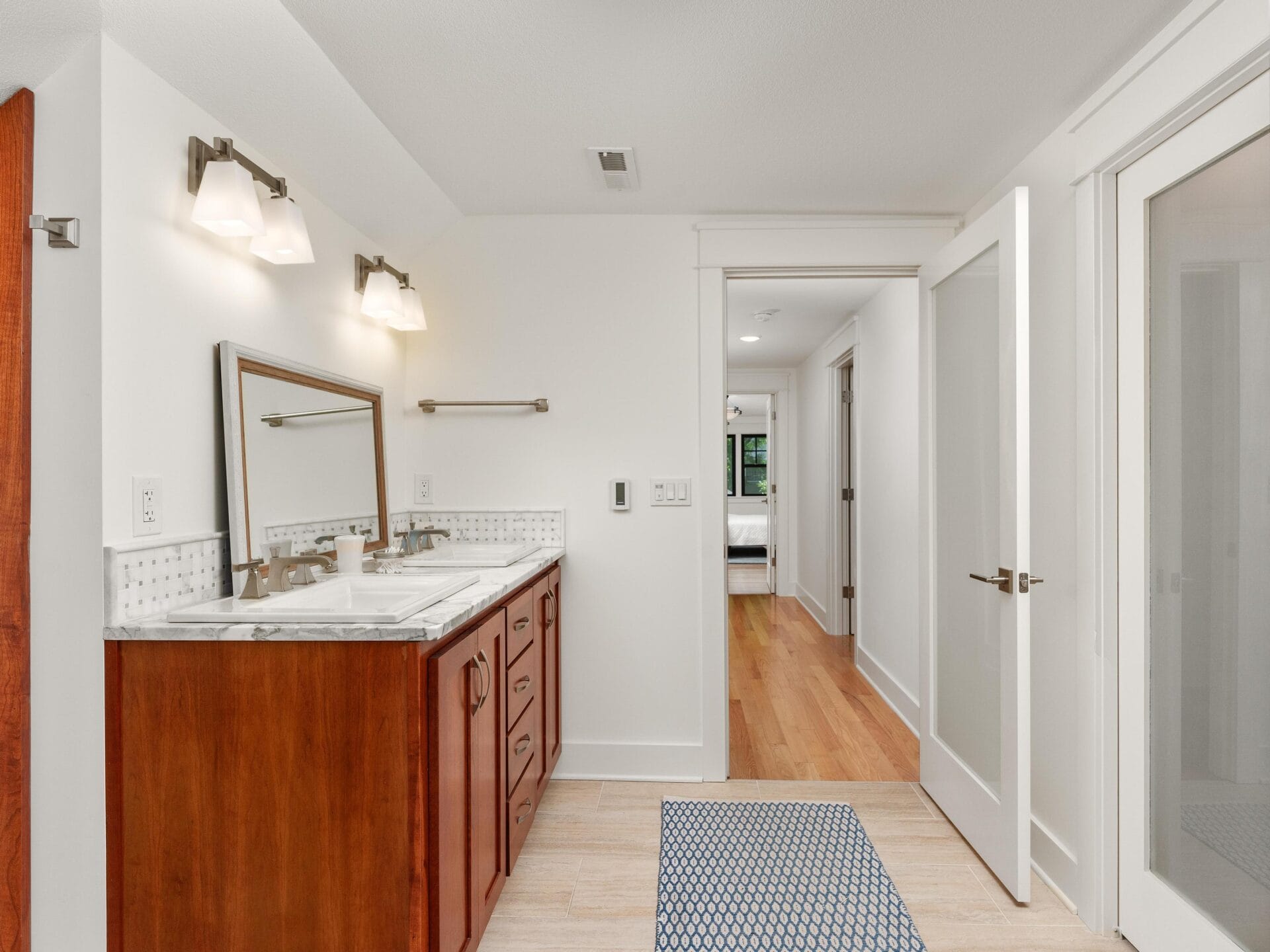 Moving upstairs beyond the 1100 plus square foot main level is almost 900 square feet of space that features three bedrooms and a second full bathroom. The bathroom boasts a soaking tub, double vanity and gorgeous surface treatments throughout. Like the main level, it has also been very thoughtfully planned out to include dual entrances from one of the adjacent bedrooms and the main hallway. Solid core doors, custom casing and oak hardwoods run throughout each room giving additional credit to the renovation. Clever details include multiple crawlspace access points which offer increased storage.